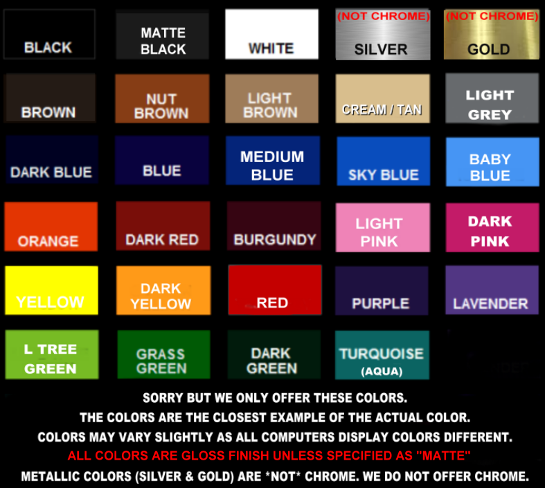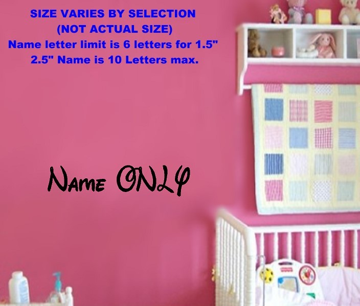 Please Read Entire Description For Any Details Or Restrictions Personalized Item- MUST Send ebay message with lettering after purchase This description provides important details you must follow when ordering. THIS ITEM REQUIRES COMMUNICATION Custom made to order Personalized name *OR* personalized name with Castle image Gloss wall decal sticker. Choose any ONE solid color for your decal. Other SOLID, BOLD fonts can be substituted. Font shown is the font offered for this item. It can not be changed. Long life oracal vinyl!. Requires communication of child name or message. Decal size options are posted above in selections. There are letter limits! 12" Tall name and castle is limited to 14 letters 20"and 30" name and castle option is limited to 16 letters maximum As with any wall decal, Wall MUST be a smooth surface. Vinyl decals are much more involved when applying to textured walls. Please research installation videos online. Although these are simple to install some walls require more work than others. You are 100% responsible for proper installation. Applies to most smooth surfaces including walls, doors, mirrors, poster frame plastic, picture frame glass or any other smooth surface. This is for die cut vinyl. ******There is no background color.****** AMERICAN MADE VINYL not imported from china like a lot of others are selling. Strong adhesive backed vinyl. This is NOT a reusable decal. Once it is on you can not remove it without destroying the decal. It is NOT a reusable decal. Please be sure to install properly and where you want it to be for however long you want it.. ADHERES TO MOST CLEAN, **SMOOTH** SURFACES! WORKS GREAT ON METAL, GLASS, PLASTIC, SOME PAINTED WOODS, FENDERS, DOORS, TAILGATES, & TRIM! Application squeegees are NOT included with purchase. You can purchase them in our ebay store IMPORTANT DETAILS - SEE IMAGES BELOW How To Order Please read ENTIRE item description by scrolling down. Please be advised this is a Personalized item listing. You MUST send an ebay message with the lettering you want on it via **ebay message** immediately after purchase. Failure to do so will result in a cancelled order. We can not proceed without your ebay message. The item comes using the font shown in the item image only. We do not offer other fonts for this item. ASK QUESTIONS first before purchase. Sizes are posted on all listings in overall inches format. Sizing is of the *overall* size from highest point to lowest point, and from furthest left, to furthest right of entire decal. You control the size in the drop down menu above. Payment Policy We only accept payments through paypal. We are unable to invoice orders as ebay does not allow that. Please ensure your address is CORRECT prior to placing your order. We can not alter the address after your purchase. If you notice an address error and your item has not shipped, Please notify us and we will cancel the order so you can repurchase with the correct shipping address. Ensuring proper shipment is our priority and on very rare occasion that we make a mistake, We will correct it upon being notified Shipping Policy We use USPS for most shipments. Ebays estimated delivery dates are just that *estimates* They are not set in stone and will vary based on your location and any USPS delays that may occur. Most items ship within 2-4 business days. Please note that business days do not include weekends or holidays. Our normal business hours are Mon-Thurs 9am-5pm est and Friday 9am-1pm est. We are not open on weekends or holidays. Items ordered on Friday will ship Monday. Any orders received over the weekend will ship by Tuesday as long as we have all the details needed to complete your order. If you are ordering a custom made to order item you MUST send an EBAY MESSAGE with all the details shown in the description. If we do not receive your notes with 24 hours, The order will be cancelled. Please do not ask us to ship fast if you did not pay for expedited shipping. If you need it in a hurry, *PAY* for priority mail shipping during checkout. Otherwise it is sent regular mail. Returns Policy Our policy is to accept returns on unused items that have not be applied or installed within the return policy window shown during purchase. If there was an error on our part, We will gladly correct it. For any mail damaged items or incorrect shipments you must notify us immediately and attach a photo to your message so we can correct it for you. A photo saves time from waiting on a return for exchange in some cases. Ebay still requires a return in many cases. Without a photo you must return it in compliance with ebay policy before a replacement or resolve can be issued. All returns must be approved. Custom made to order items can not be returned. We require specific details to make custom items and any typos or errors when you add your notes are not the sellers error. You must ensure proper typing when adding your notes as we copy and paste it exactly as you type it including any capital or lower case letters. You are advised to preview your font selection on Dafont dot com prior to purchase. Some fonts may not have all capital letters or some may only have capital letters. We only copy and paste the lettering as you type it for custom orders. It is the buyers responsibility to ensure accuracy when submitting details on the order. Make sure your spelling is *correct* Typos during notes are buyers responsibility on custom made to order items.