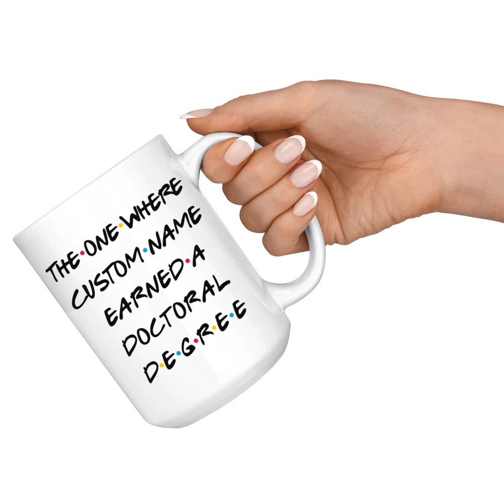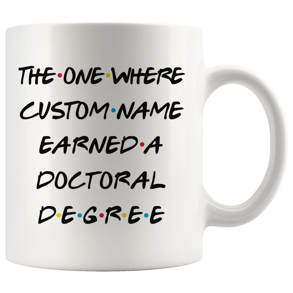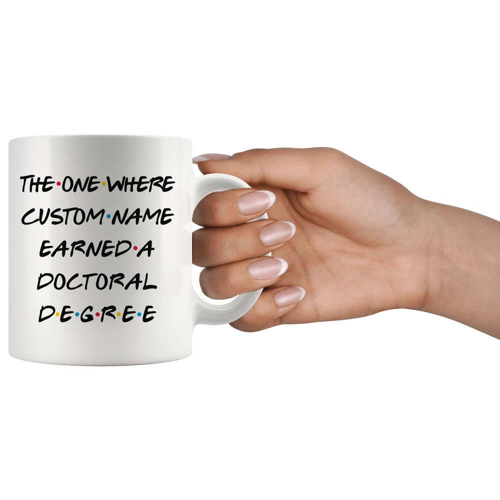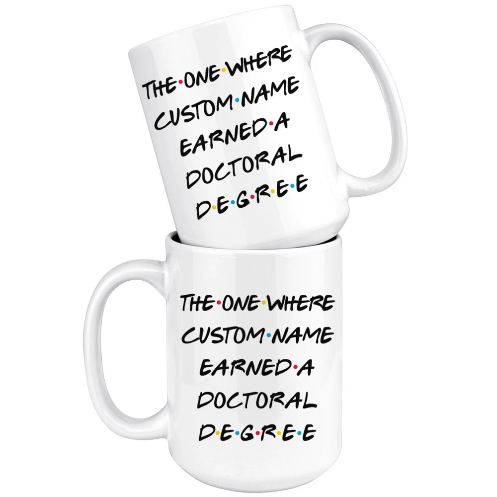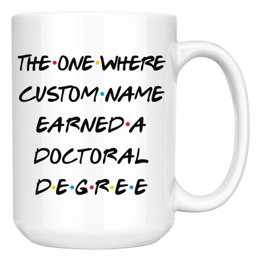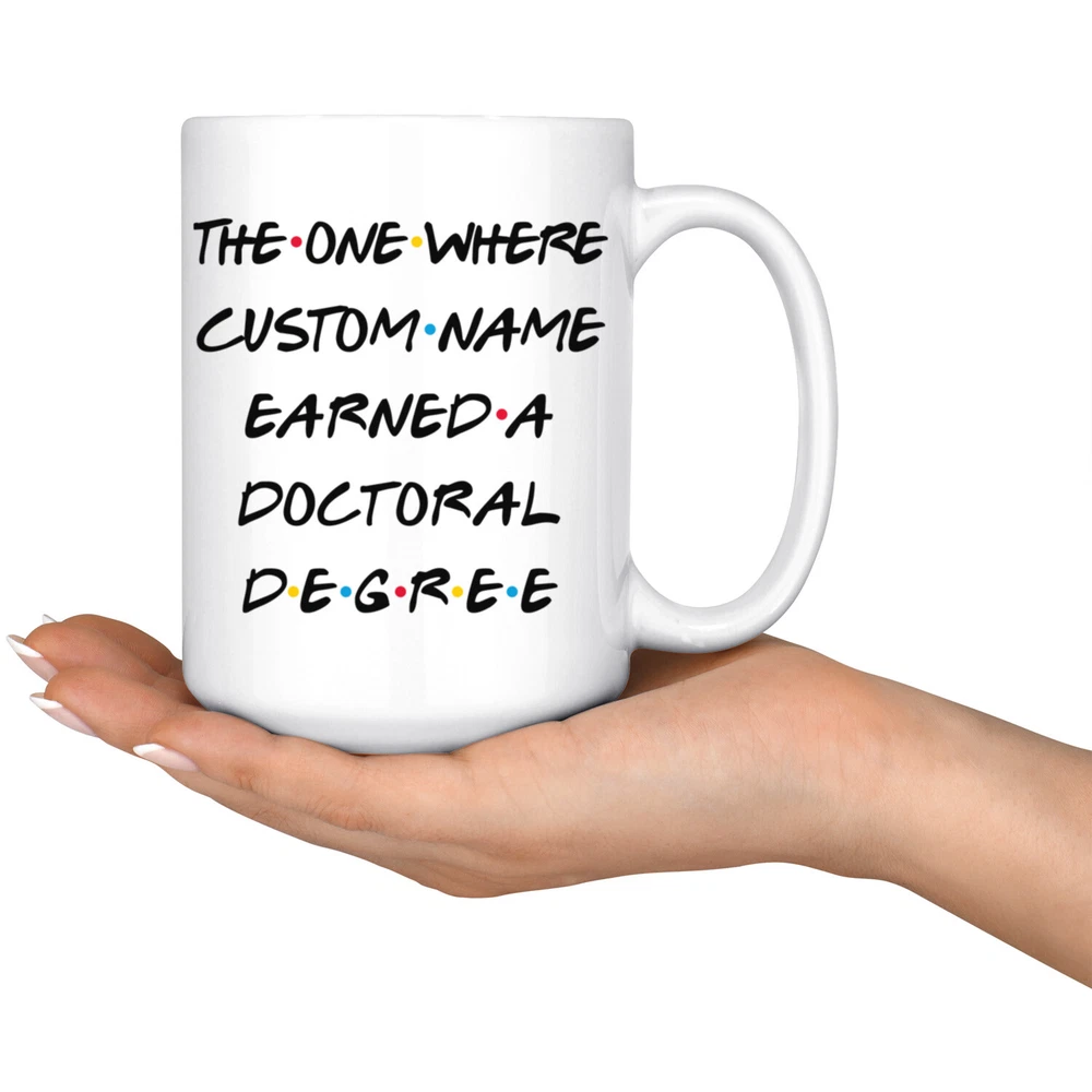 personalized doctor's degree coffee mug, gift for a doctoral degree, doctorate graduation gift, college graduation coffee cup, gifts for men & women, best doctoral degree mug, mothers day gift, fathers day gift, custom degree appreciation gift, gifts for her, gifts for him, academic degree mug This is the perfect coffee mug with content " THE ONE WHERE 'CUSTOM NAME' EARNED A DOCTORAL DEGREE (OR DOCTOR'S DEGREE OR DOCTORATE) ". CUSTOM NAME Please put the custom name in the notes at the checkout or send us a message. By not doing this, it will delay your order. Example: Custom name: Lynda. A PERFECT GIFT FOR A STUDENT WITH A DOCTORAL DEGREE ! This special coffee cup can be a great gift for the best Chief warrant officer two, three or four. Bring a smile to your family member or friend with this unique gift . DISHWASHER AND MICROWAVE SAFE! This version of ceramic mug shows it's true colors with quality assurance to withstand heat in the microwave and put it in the dishwasher as many times as you like, the quality will not be Altered. THE MUG DESIGN IS PRINTED ON BOTH SIDES! No matter if you hold your teacup in your right or left hand, you and everyone else will be able to see this unique design. Looking at this cute coffee mug will put a smile on everyone's face! We want you to be 100% satisfied, so please let us know if there is anything wrong with your order so we can fix it right away.