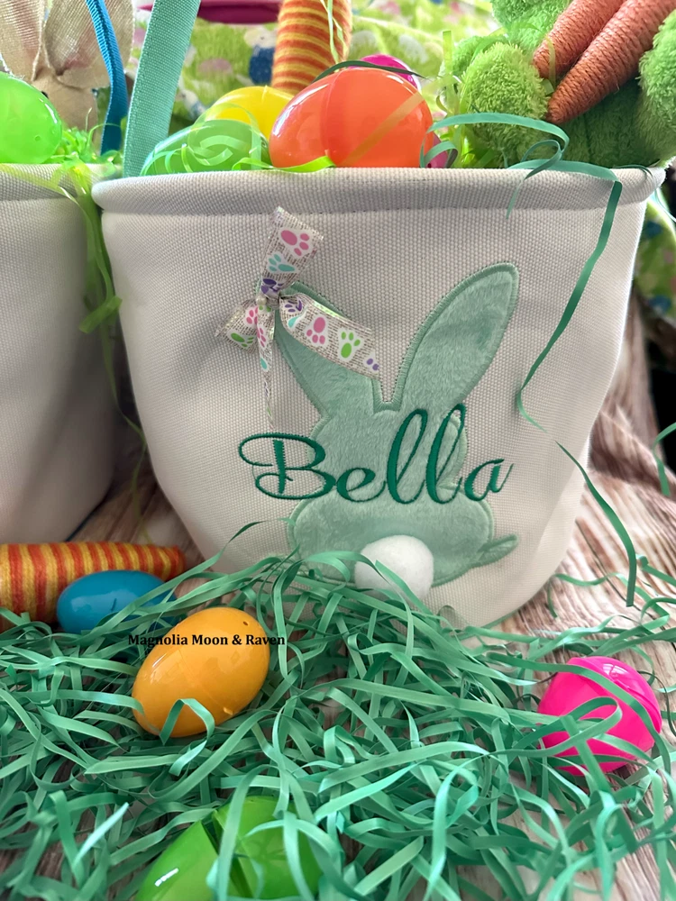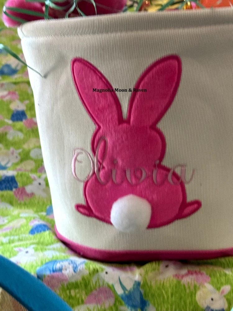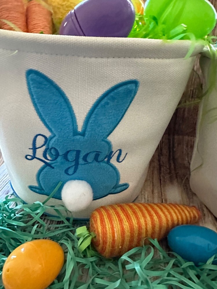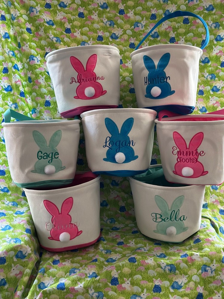 This personalized Easter basket is perfect for kids, with an embroidered touch that adds a special and unique element to the gift. These will hold lots of eggs, treats, trinkets, toys for your little one or perfect for adults too!! Baskets are approx 8" high (excluding handle) 10" diameter at top Choose pink, blue or mint bunny. These are made of a canvas material with handle. Please leave us the name of person for basket and if you want a different color of thread. Please note the pink bunny will have a darker thread used, this was a request, and I feel it doesn't show up as darker colors. Baskets will be shipped in an envelope unless you order two or more and they will be shipped in a box. When your basket arrives in an envelope, just push basket back in shape, we have never had issues of shipping this way. Orders are shipped within 4-5 business days (Monday - Friday). Easter is a busy time of the year, and it takes a little longer to fulfill orders during this time. Orders are shipped via USPS, with tracking. Thank you for stopping by and have a wonderful, blessed Easter.
