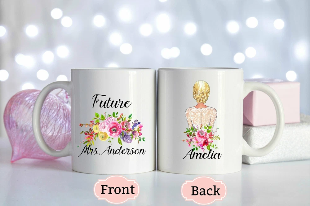 Personalized Engagement Mug Custom Future Mrs Mug Bride Mug Product Details.. This high quality 11oz. ceramic white mug has a premium hard coat that provides crisp and vibrant color reproduction sure to last for years. Perfect for all hot & cold beverages. The highest quality printing possible is used. It will never fade no matter how many times you wash it. Material: 100% Ceramic. Print both sides. Dishwasher and Microwave Safe. High Gloss + Premium White Finish. Printed in the U.S.A. Personalized & Custom. We support personalized and custom mug to add custom, when placing an order, you can add notes to the "order note" in shipping address section. Also you can contact us directly via message. Shipping Info. Ready to ship in 1 to 2 business days, All products are made-to-order and proudly printed in the United States. Shipped by USPS and DHL, You will receive your order in 5-7 days. Replace & Refund. All products are defective during shipping broken, chipped will be replaced free of charge. You are not satisfied with the product, we will refund 100% money to you. If any other issues arise, please do not hesitate to message, we would be more than happy to assist you.