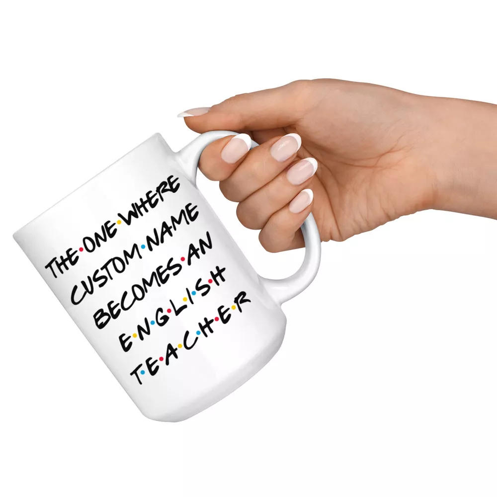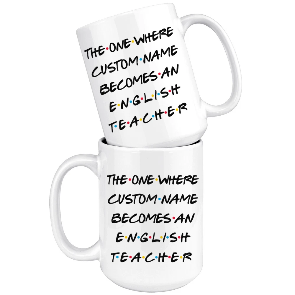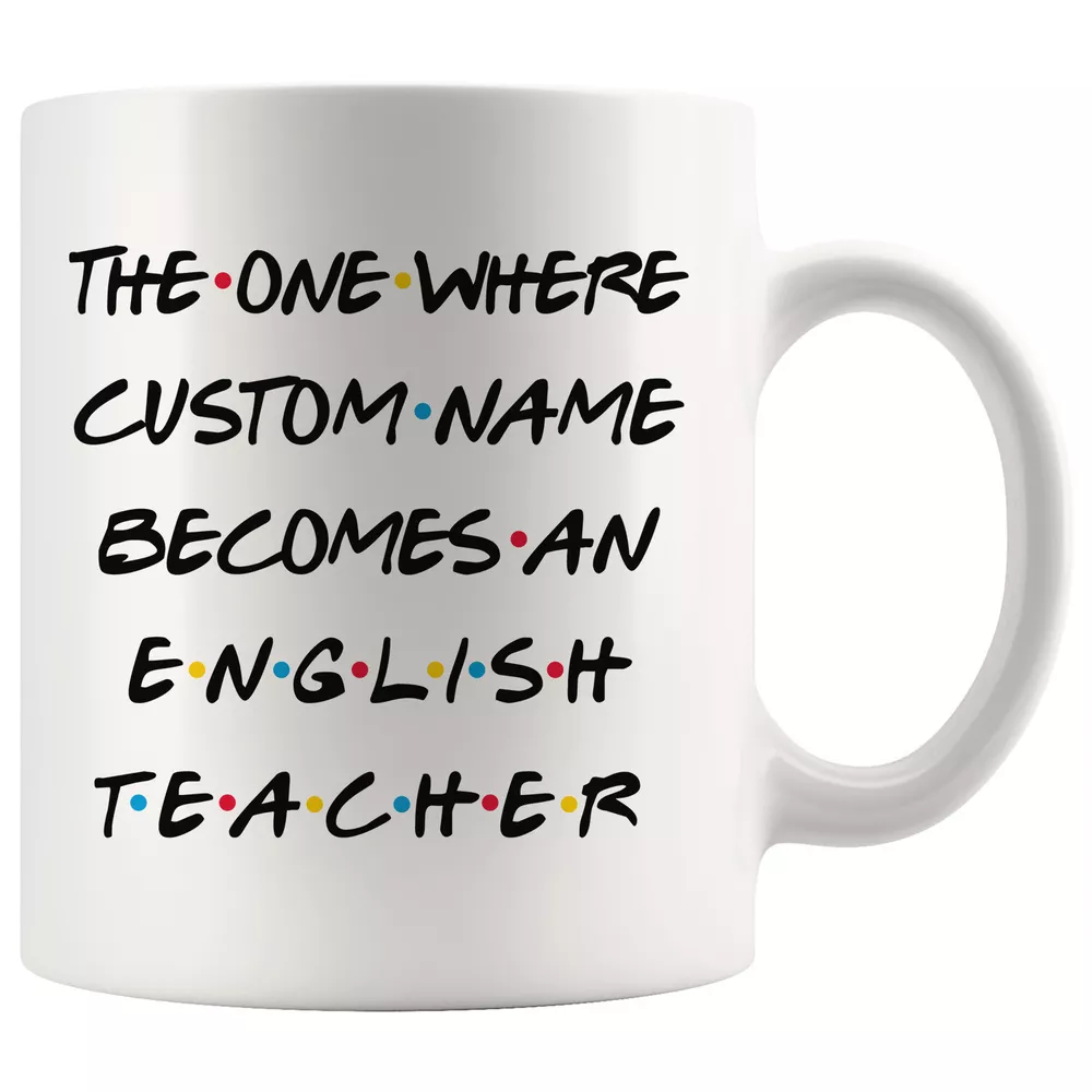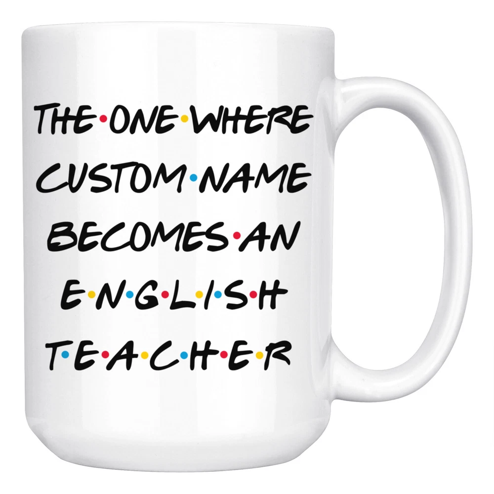 personalized english teacher coffee mug, gift for an english teacher, english teacher graduation gift, english teacher job promotion, english teacher coffee cup, gifts for men & women, best english teacher mug, mothers day gift, fathers day gift, english teacher career job appreciation gift, gifts for her, gifts for him This is the perfect coffee mug with content " THE ONE WHERE 'CUSTOM NAME' BECOMES AN ENGLISH TEACHER ". CUSTOM NAME Please put the custom name in the notes at the checkout or send us a message. By not doing this, it will delay your order. Example: Custom name: Lynda. A PERFECT GIFT FOR AN ENGLISH TEACHER ! This special coffee cup can be a great gift for the best English Teacher. Bring a smile to your family member or friend with this unique gift . DISHWASHER AND MICROWAVE SAFE! This version of ceramic mug shows it's true colors with quality assurance to withstand heat in the microwave and put it in the dishwasher as many times as you like, the quality will not be Altered. THE MUG DESIGN IS PRINTED ON BOTH SIDES! No matter if you hold your teacup in your right or left hand, you and everyone else will be able to see this unique design. Looking at this cute coffee mug will put a smile on everyone's face! We want you to be 100% satisfied, so please let us know if there is anything wrong with your order so we can fix it right away.