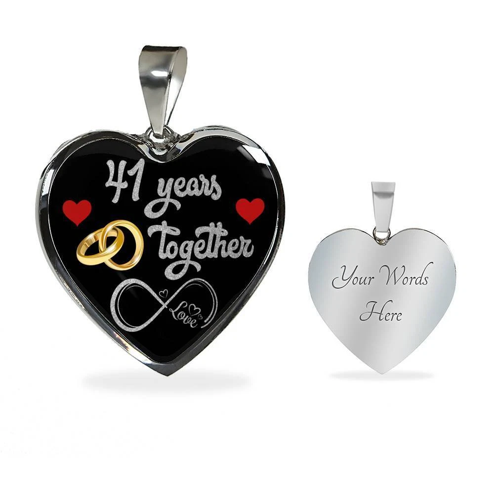 personalized 41st anniversary custom pendant necklace, 41 years wife anniversary gift, 41 years marriage anniversary, best necklace for wife, happy anniversary gift, 41 years together, married 41 years with her, 41 years wedding couple, valentines day romantic necklace, mrs anniversary, custom engraving jewelry, personal keepsake, memory necklace, valentine jewelry gift Add your custom engraving content (the back of the pendant) to create a truly unique piece of jewelry! Purchase this pendant necklace and we guarantee it will exceed your highest expectations! Note: If you want engraved message onto the back of the pendant, leave us a message. Enter up to 40 characters ( up to 20 in every line - including spaces ) for engraving onto the back of the charm. You can choose engraved or ordinary necklace. Our patent-pending jewelry is made of high-quality surgical steel with a shatterproof liquid glass coating and/or 18k gold plating. Our jewelry is hand-made in the U.S.A by awesome working moms just like yours! We hire and train working mothers and pay a living wage. We are proud to support strong communities and keep jobs in America! This Jewelry Item Is the Perfect Keepsake! Whether for Yourself or a Loved One. If the custom engraving option is available, engrave onto the back of the pendant your loved one's name, your wedding date, an anniversary, or anything else you want to remember and keep you close to her heart. Each personalized piece offers exceptional craftsmanship that is fit to be an instant classic in your family. We Offer a 100% Happiness Guarantee If you’re not 100% satisfied with your purchase for any reason, please contact us and we will make it right. Your satisfaction is our ultimate goal. Delivery time: US Delivery Time: 5-8 Days International Delivery Time: 2 - 3 Weeks Product Dimensions: Luxury Necklace: 18-22" (45-56cm) adjustable Heart Pendant: 24mm x 24mm Free Gift Box included