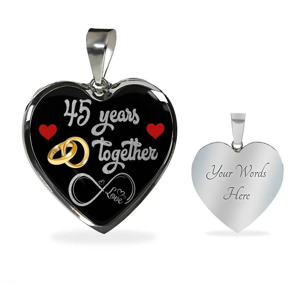 personalized 45th anniversary custom pendant necklace, 45 years wife anniversary gift, 45 years marriage anniversary, best necklace for wife, happy anniversary gift, 45 years together, married 45 years with her, 45 years wedding couple, valentines day romantic necklace, mrs anniversary, custom engraving jewelry, personal keepsake, memory necklace, valentine jewelry gift Add your custom engraving content (the back of the pendant) to create a truly unique piece of jewelry! Purchase this pendant necklace and we guarantee it will exceed your highest expectations! Note: If you want engraved message onto the back of the pendant, leave us a message. Enter up to 40 characters ( up to 20 in every line - including spaces ) for engraving onto the back of the charm. You can choose engraved or ordinary necklace. Our patent-pending jewelry is made of high-quality surgical steel with a shatterproof liquid glass coating and/or 18k gold plating. Our jewelry is hand-made in the U.S.A by awesome working moms just like yours! We hire and train working mothers and pay a living wage. We are proud to support strong communities and keep jobs in America! This Jewelry Item Is the Perfect Keepsake! Whether for Yourself or a Loved One. If the custom engraving option is available, engrave onto the back of the pendant your loved one's name, your wedding date, an anniversary, or anything else you want to remember and keep you close to her heart. Each personalized piece offers exceptional craftsmanship that is fit to be an instant classic in your family. We Offer a 100% Happiness Guarantee If you’re not 100% satisfied with your purchase for any reason, please contact us and we will make it right. Your satisfaction is our ultimate goal. Delivery time: US Delivery Time: 5-8 Days International Delivery Time: 2 - 3 Weeks Product Dimensions: Luxury Necklace: 18-22" (45-56cm) adjustable Heart Pendant: 24mm x 24mm Free Gift Box included