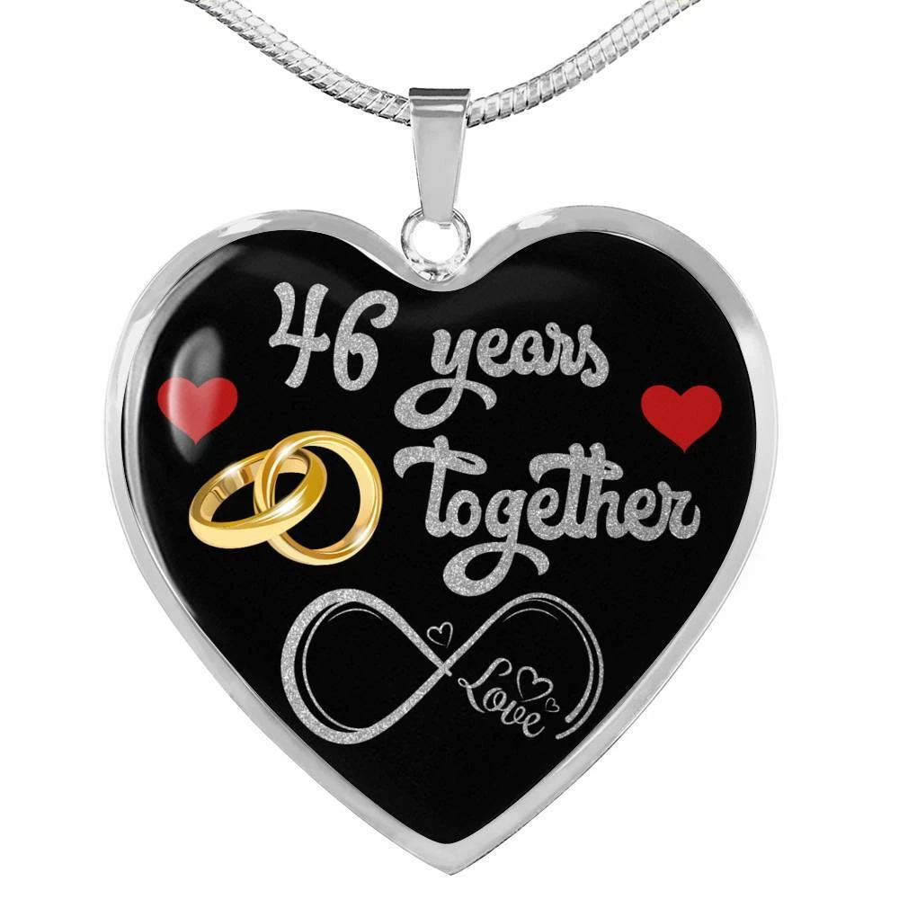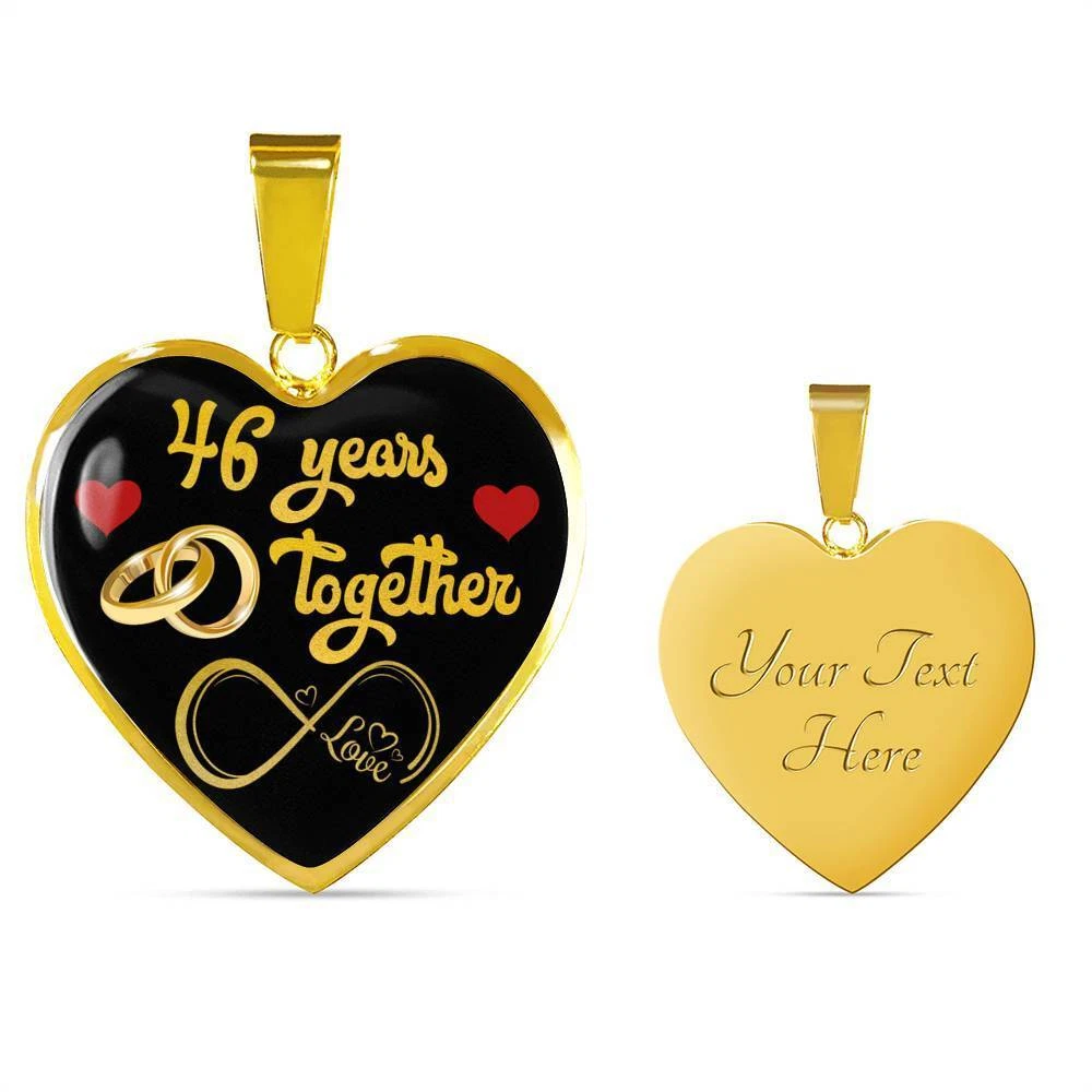 personalized 46th anniversary custom pendant necklace, 46 years wife anniversary gift, 46 years marriage anniversary, best necklace for wife, happy anniversary gift, 46 years together, married 46 years with her, 46 years wedding couple, valentines day romantic necklace, mrs anniversary, custom engraving jewelry, personal keepsake, memory necklace, valentine jewelry gift Add your custom engraving content (the back of the pendant) to create a truly unique piece of jewelry! Purchase this pendant necklace and we guarantee it will exceed your highest expectations! Note: If you want engraved message onto the back of the pendant, leave us a message. Enter up to 40 characters ( up to 20 in every line - including spaces ) for engraving onto the back of the charm. You can choose engraved or ordinary necklace. Our patent-pending jewelry is made of high-quality surgical steel with a shatterproof liquid glass coating and/or 18k gold plating. Our jewelry is hand-made in the U.S.A by awesome working moms just like yours! We hire and train working mothers and pay a living wage. We are proud to support strong communities and keep jobs in America! This Jewelry Item Is the Perfect Keepsake! Whether for Yourself or a Loved One. If the custom engraving option is available, engrave onto the back of the pendant your loved one's name, your wedding date, an anniversary, or anything else you want to remember and keep you close to her heart. Each personalized piece offers exceptional craftsmanship that is fit to be an instant classic in your family. We Offer a 100% Happiness Guarantee If you’re not 100% satisfied with your purchase for any reason, please contact us and we will make it right. Your satisfaction is our ultimate goal. Delivery time: US Delivery Time: 5-8 Days International Delivery Time: 2 - 3 Weeks Product Dimensions: Luxury Necklace: 18-22" (45-56cm) adjustable Heart Pendant: 24mm x 24mm Free Gift Box included