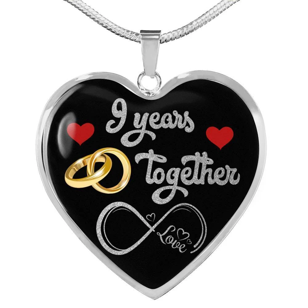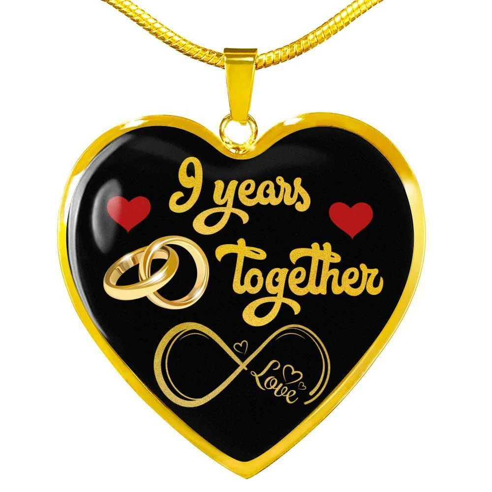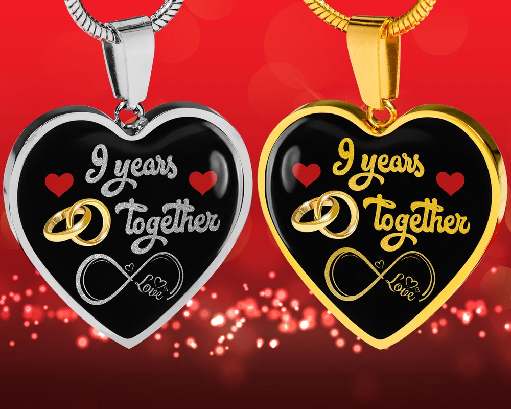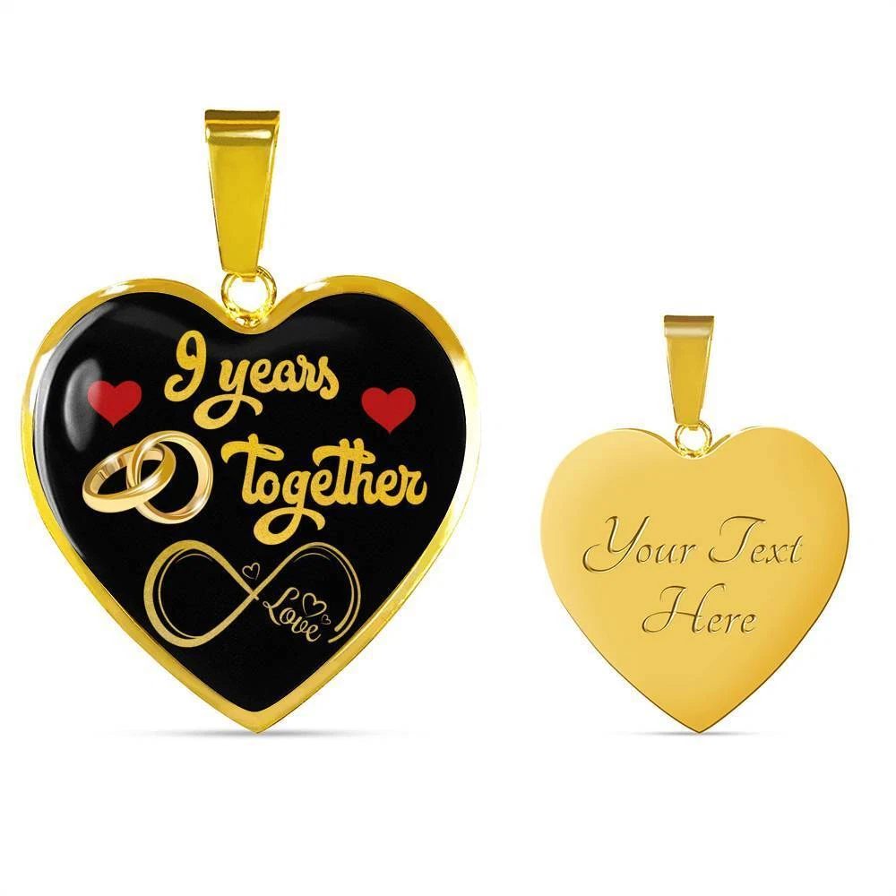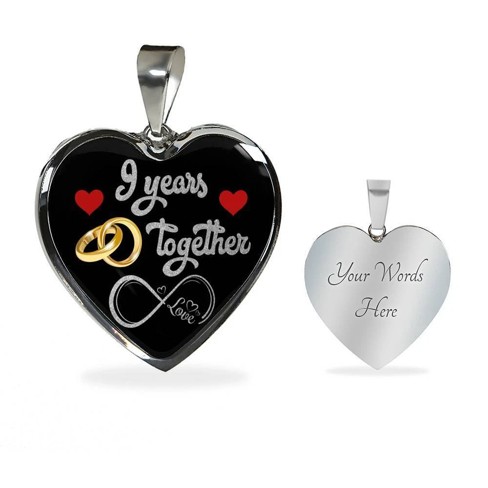 personalized 9th anniversary custom pendant necklace, 9 years wife anniversary gift, 9 years marriage anniversary, best necklace for wife, happy anniversary gift, 9 years together, married 9 years with her, nine years wedding couple, valentines day romantic necklace, mrs anniversary, custom engraving jewelry, personal keepsake, memory necklace, valentine jewelry gift Add your custom engraving content (the back of the pendant) to create a truly unique piece of jewelry! Purchase this pendant necklace and we guarantee it will exceed your highest expectations! Note: If you want engraved message onto the back of the pendant, leave us a message. Enter up to 40 characters ( up to 20 in every line - including spaces ) for engraving onto the back of the charm. You can choose engraved or ordinary necklace. Our patent-pending jewelry is made of high-quality surgical steel with a shatterproof liquid glass coating and/or 18k gold plating. Our jewelry is hand-made in the U.S.A by awesome working moms just like yours! We hire and train working mothers and pay a living wage. We are proud to support strong communities and keep jobs in America! This Jewelry Item Is the Perfect Keepsake! Whether for Yourself or a Loved One. If the custom engraving option is available, engrave onto the back of the pendant your loved one's name, your wedding date, an anniversary, or anything else you want to remember and keep you close to her heart. Each personalized piece offers exceptional craftsmanship that is fit to be an instant classic in your family. We Offer a 100% Happiness Guarantee If you’re not 100% satisfied with your purchase for any reason, please contact us and we will make it right. Your satisfaction is our ultimate goal. Delivery time: US Delivery Time: 5-8 Days International Delivery Time: 2 - 3 Weeks Product Dimensions: Luxury Necklace: 18-22" (45-56cm) adjustable Heart Pendant: 24mm x 24mm Free Gift Box included