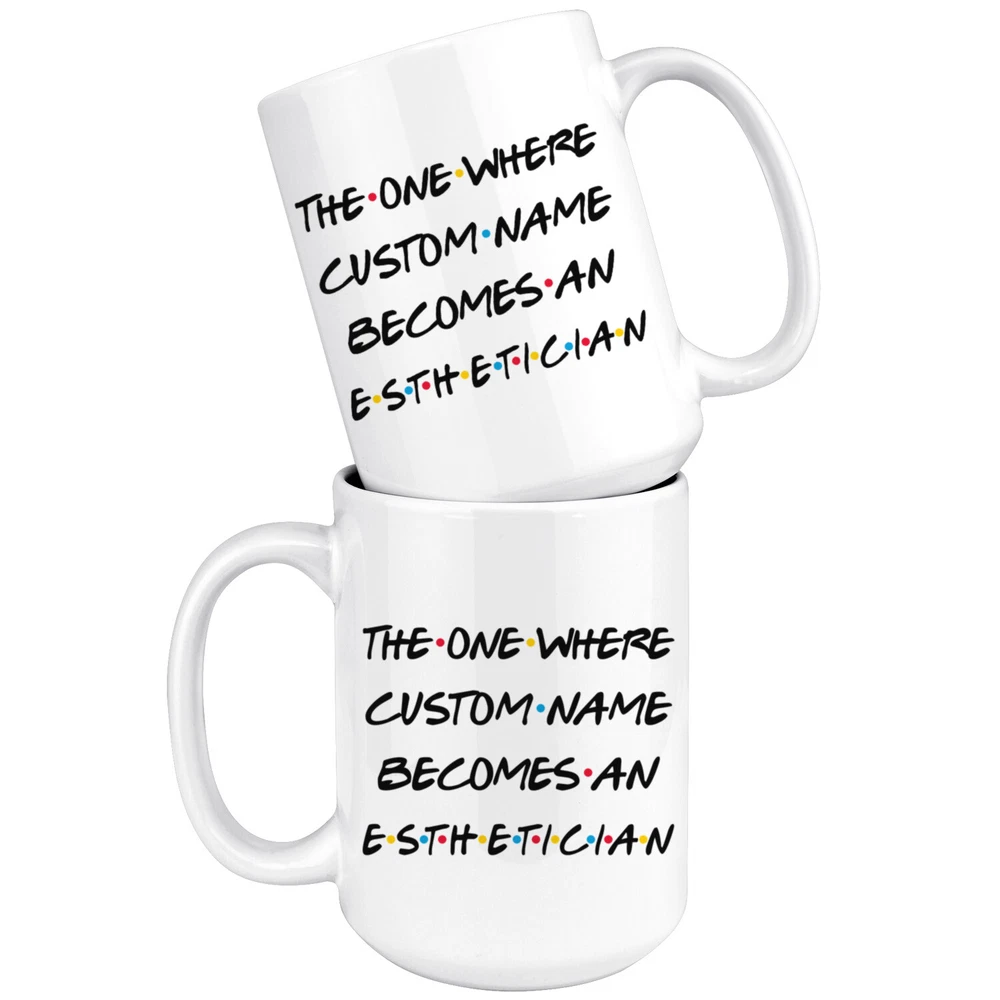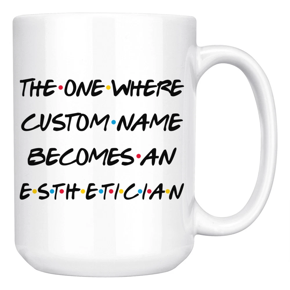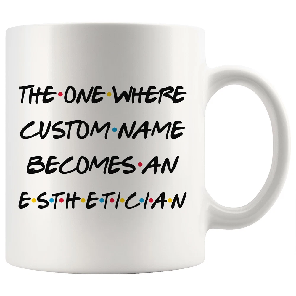 personalized esthetician coffee mug, gift for an esthetician, esthetician graduation gift, esthetician job promotion, esthetician coffee cup, gifts for men & women, best esthetician mug, mothers day gift, fathers day gift, esthetician career job appreciation gift, gifts for her, gifts for him This is the perfect coffee mug with content " T THE ONE WHERE 'CUSTOM NAME' BECOMES AN ESTHETICIAN ". CUSTOM NAME Please put the custom name in the notes at the checkout or send us a message. By not doing this, it will delay your order. Example: Custom name: Lynda. A PERFECT GIFT FOR AN ESTHETICIAN ! This special coffee cup can be a great gift for the best Esthetician. Bring a smile to your family member or friend with this unique gift . DISHWASHER AND MICROWAVE SAFE! This version of ceramic mug shows it's true colors with quality assurance to withstand heat in the microwave and put it in the dishwasher as many times as you like, the quality will not be Altered. THE MUG DESIGN IS PRINTED ON BOTH SIDES! No matter if you hold your teacup in your right or left hand, you and everyone else will be able to see this unique design. Looking at this cute coffee mug will put a smile on everyone's face! We want you to be 100% satisfied, so please let us know if there is anything wrong with your order so we can fix it right away.