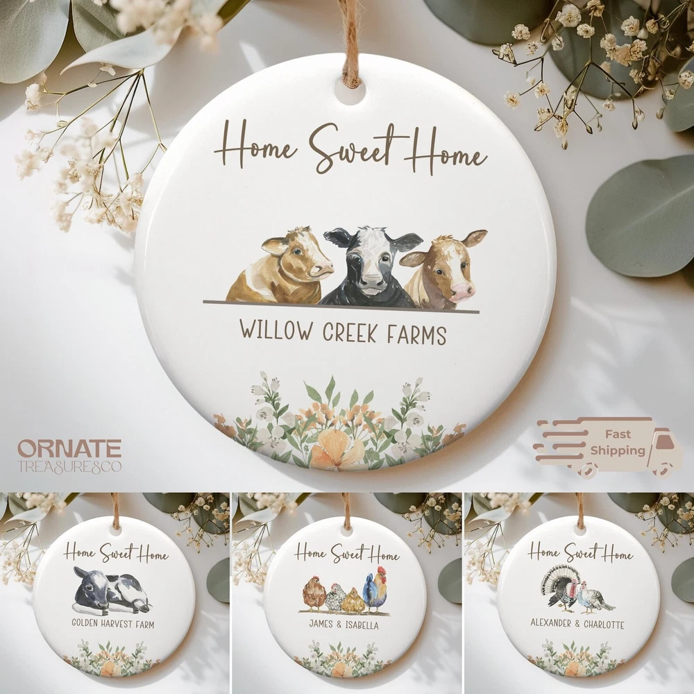 Personalized Farm Animal Christmas Ornament Farm Name Custom Watercolor Decor Gift For Family Home Sweet Home Keepsake Family Ornament Material: Ceramic Color: White Shapes: Circle, star, heart and oval Can be printed on both sides Imprint full-color artwork, photos, or logos Hole for hanging string and hanging string included Printed in the USA