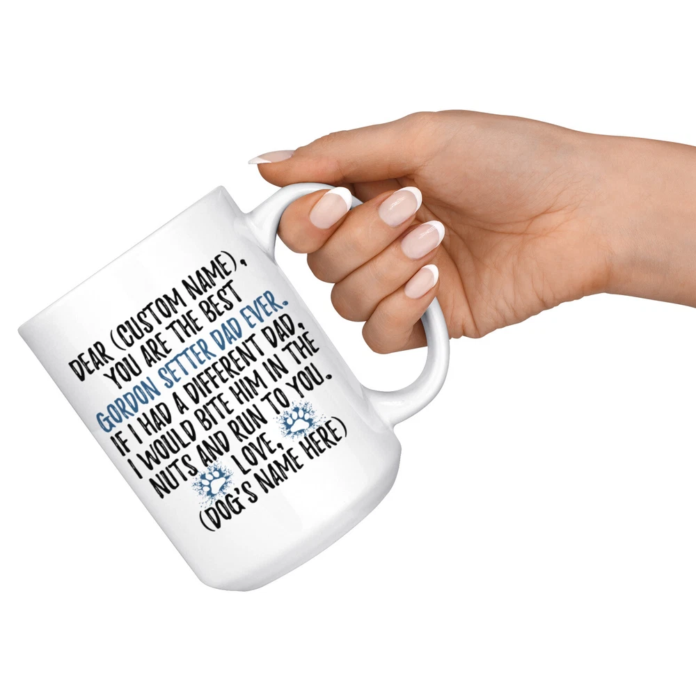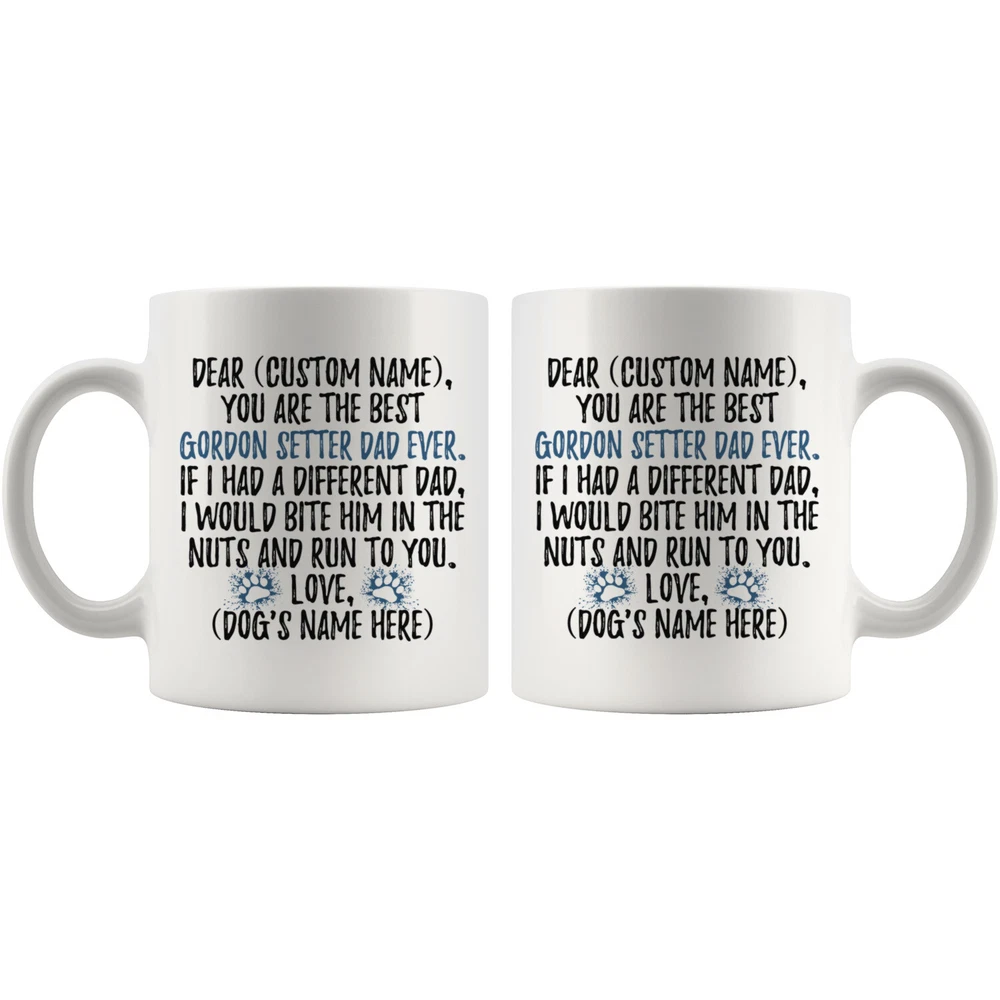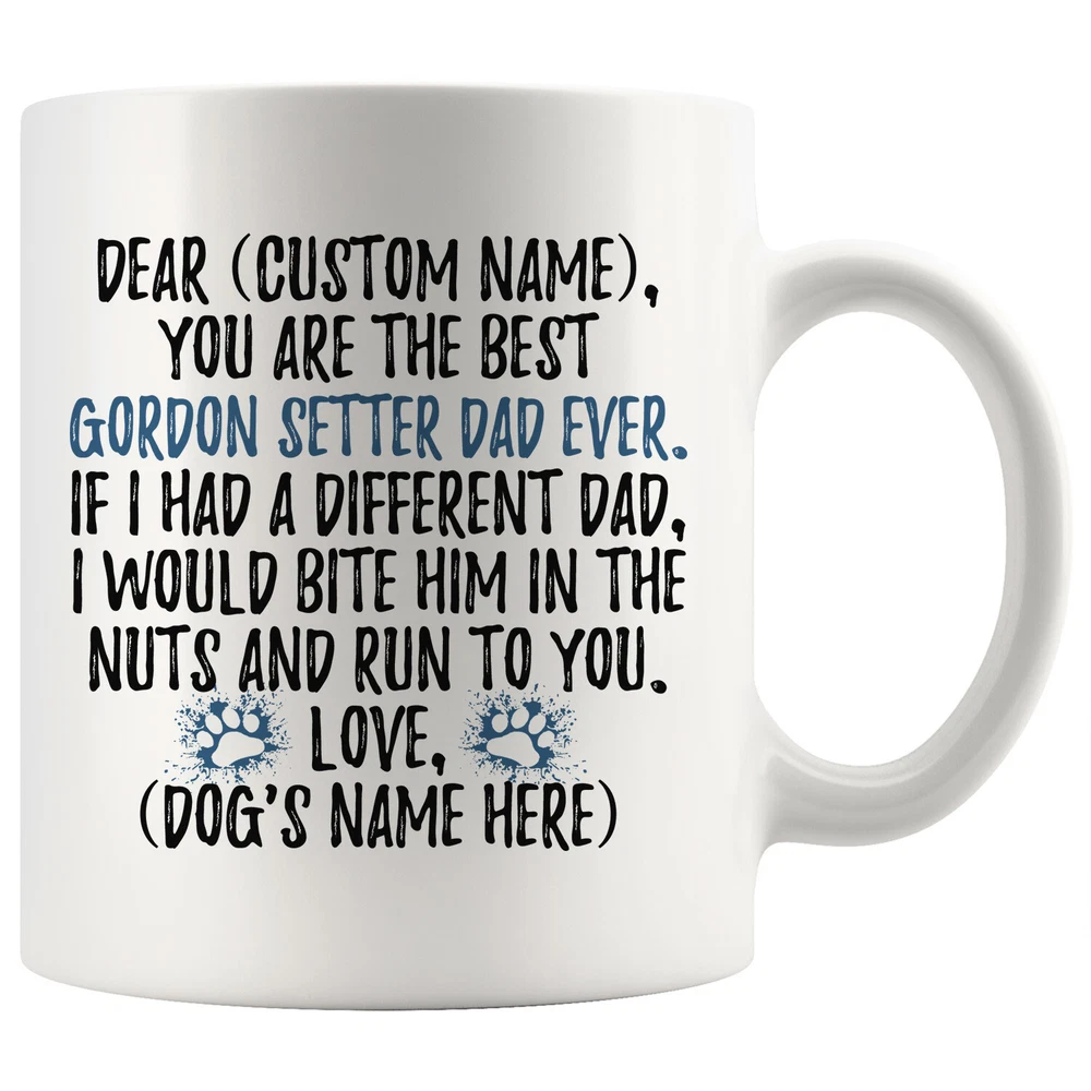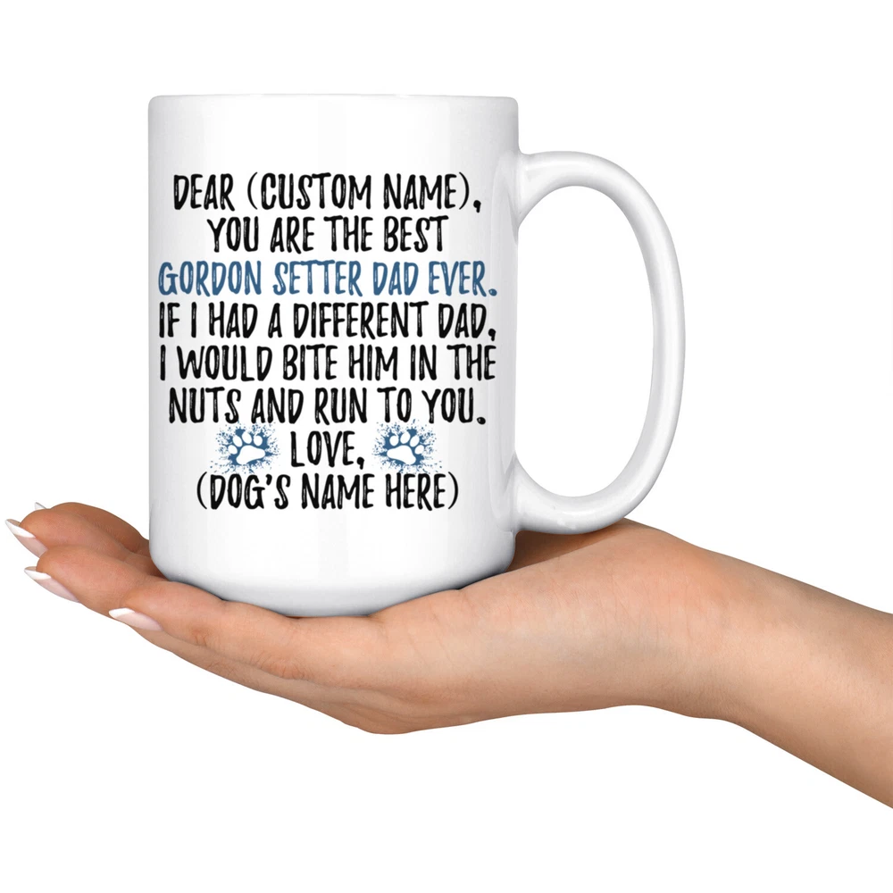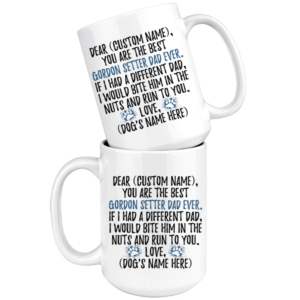 personalized gordon setter mug, gordon castle setters coffee mug, gordon setter dog gifts, gordon setter dad present gift, gordon setter daddy mug, gordon setter owner mug, i love gordon setter, custom gordon setter gift, dog coffee cup, fathers day gift This is the perfect coffee mug with content "DEAR 'CUSTOM NAME', YOU ARE THE BEST GORDON SETTER DAD EVER. IF I HAD A DIFFERENT DAD, I WOULD BITE HIM IN THE NUTS AND RUN TO YOU. LOVE, 'DOG'S NAME HERE' ". CUSTOM DAD'S NAME AND DOG'S NAME Please put the dad's name and dog's name in the notes at the checkout or send us a message. By not doing this, it will delay your order. Example: Dad's Name: Bill; Dog's name: Charlie PERFECT FUNNY GIFT FOR A GORDON SETTER DOG DAD! This special coffee cup can be a great gift for every Gordon Setter dad. DISHWASHER AND MICROWAVE SAFE! This version of ceramic mug shows it's true colors with quality assurance to withstand heat in the microwave and put it in the dishwasher as many times as you like, the quality will not be Altered. THE MUG DESIGN IS PRINTED ON BOTH SIDES! No matter if you hold your teacup in your right or left hand, you and everyone else will be able to see this unique design. Looking at this cute coffee mug will put a smile on everyone's face! We want you to be 100% satisfied, so please let us know if there is anything wrong with your order so we can fix it right away.