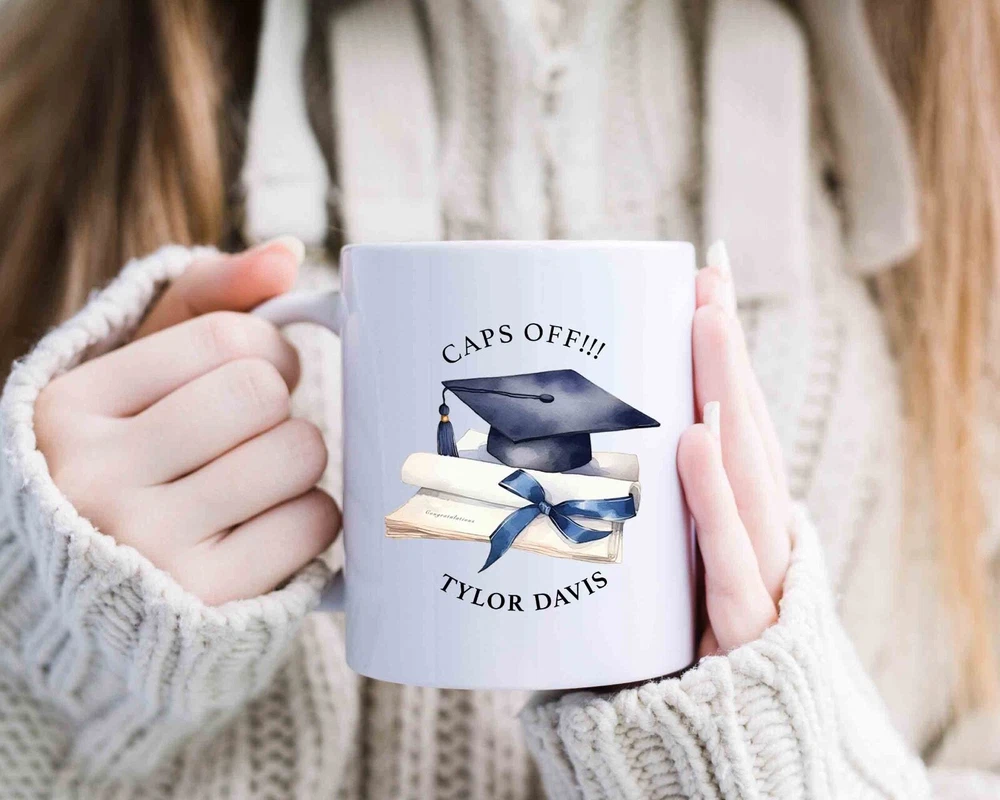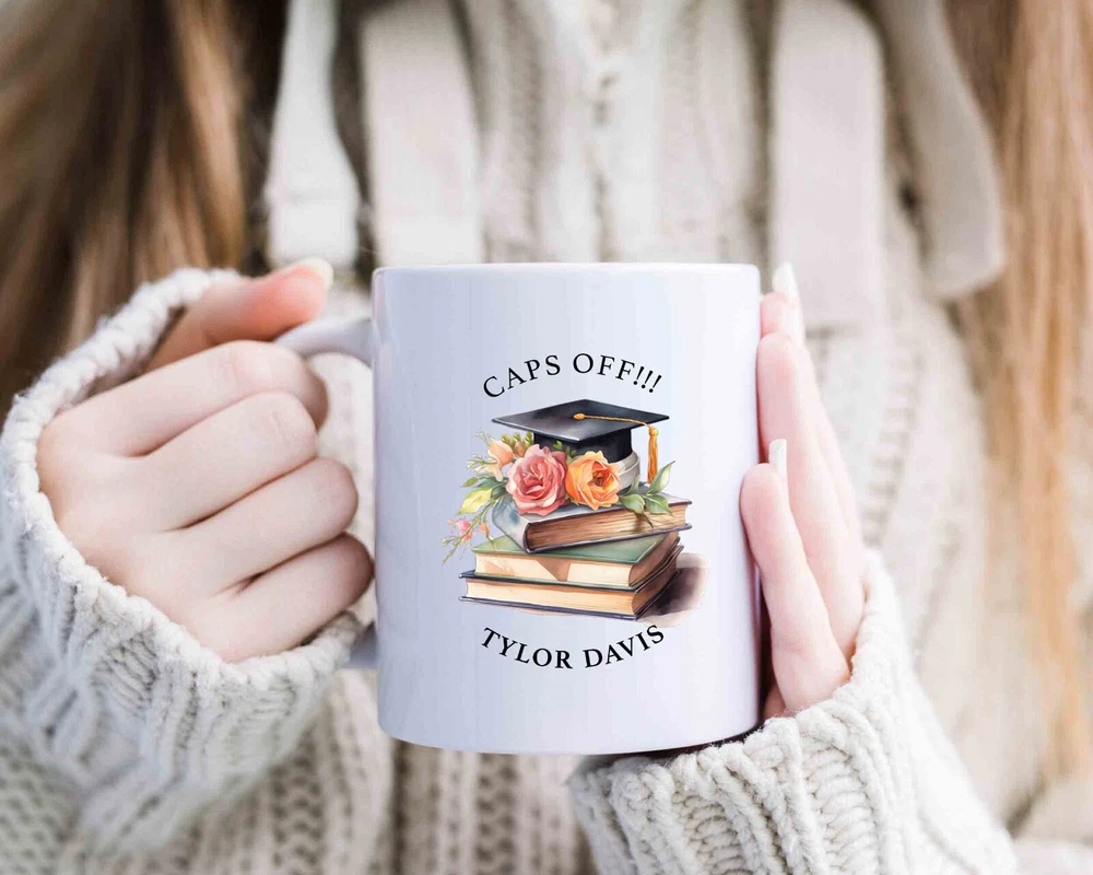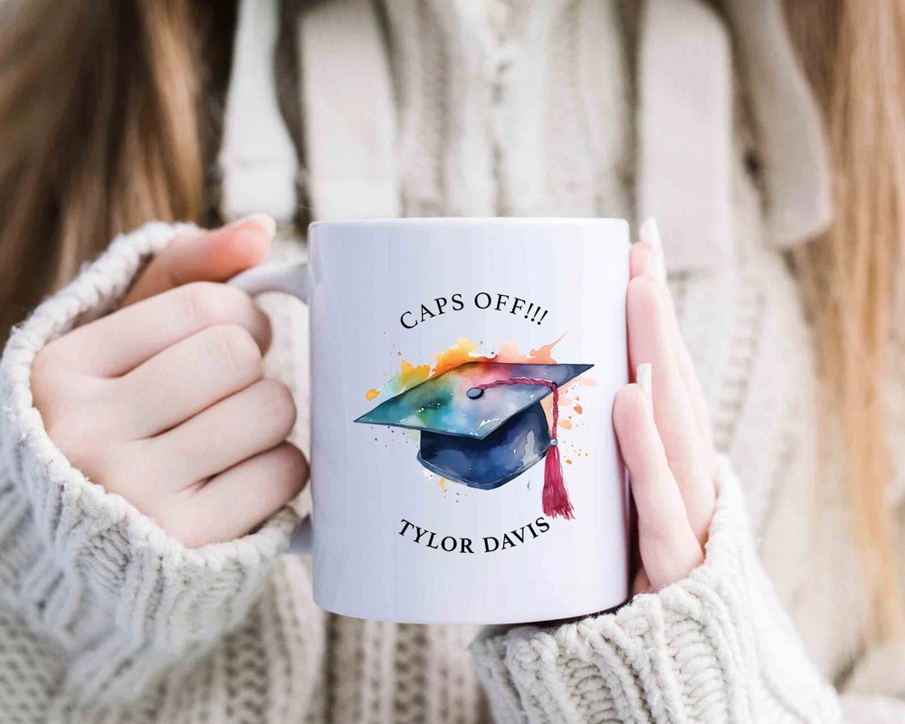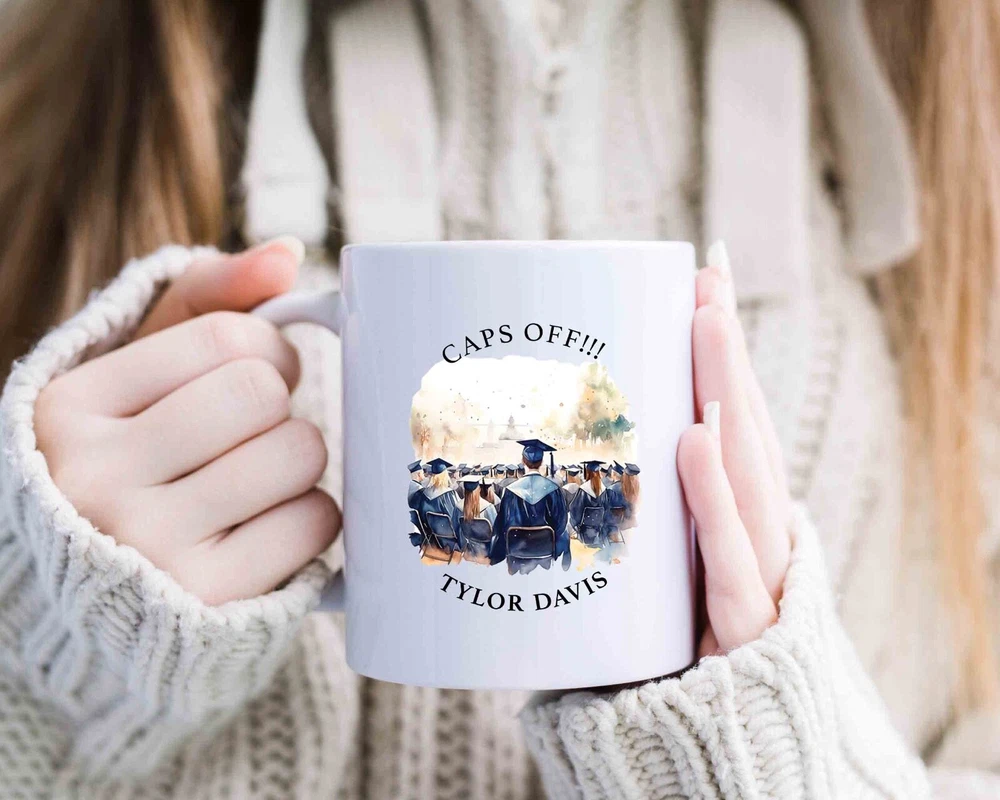 Spice up your morning coffee routine with our personalized mugs just for you! Celebrate your achievement with our Personalized Name Graduation PhDone 11oz Ceramic Coffee Mug! This stylish mug features a custom name and a fun "CAP OFF!!!" design, making it a perfect gift for graduates. Enjoy your favorite beverage while remembering your hard work and success! It's a thoughtful gift for anyone in your life, whether it's family, friends, coworkers, or loved ones ensuring that every moment is memorable. Also, this specialized mug is designed and printed in USA. The long-lasting designs will never fade away, It is dishwasher and microwave safe. Last but not least, it is permanently fused on both sides with glossy and vibrant colors that will make it a durable keepsake gift.