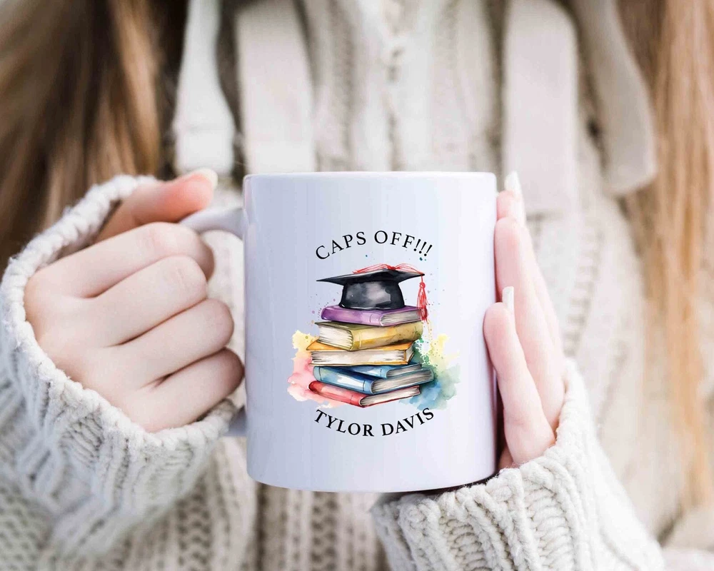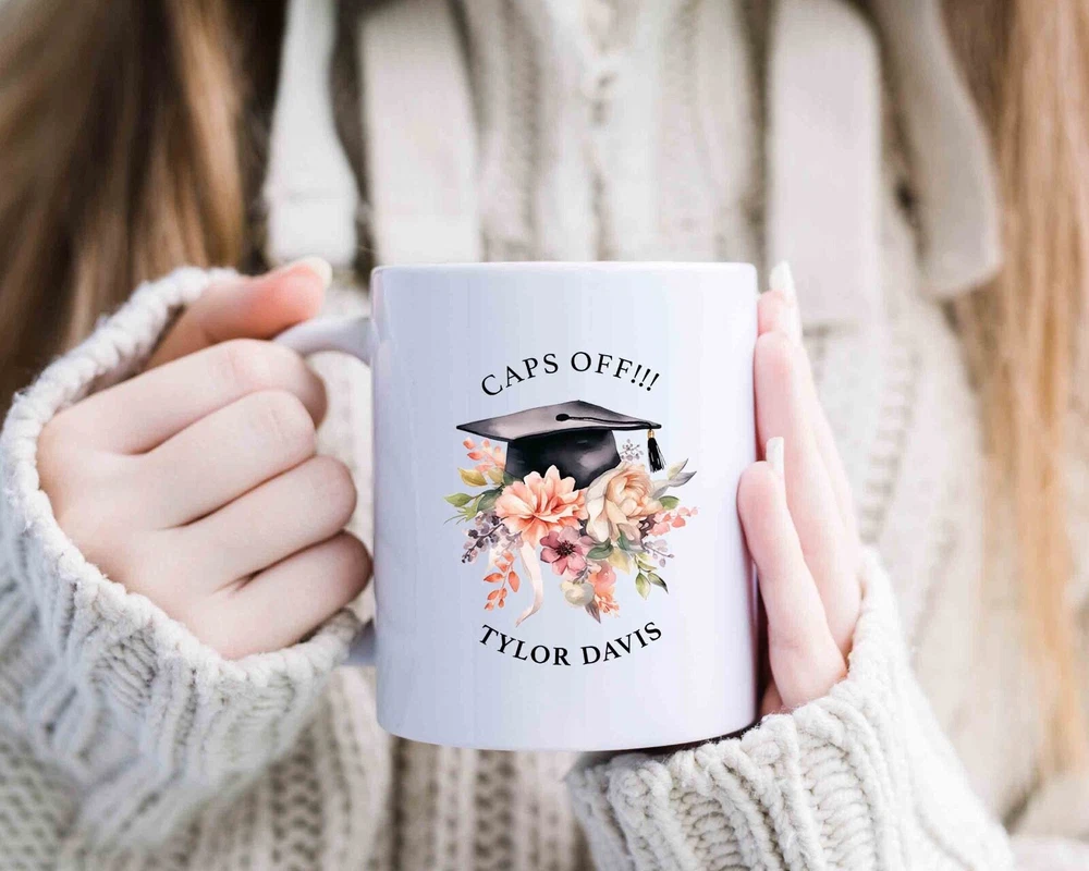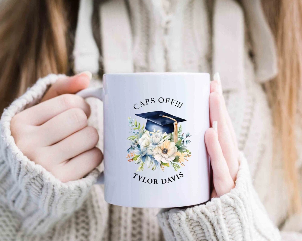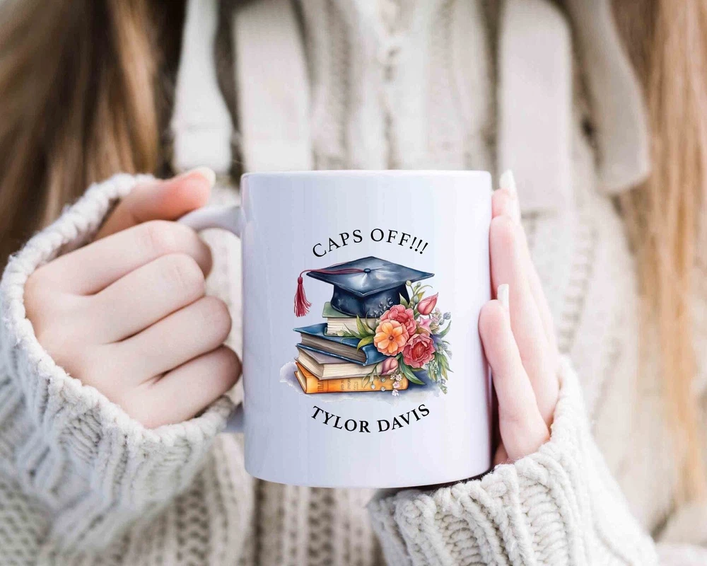 Spice up your morning coffee routine with our personalized mugs just for you! Celebrate your achievement with our Personalized Name Graduation PhDone 11oz Ceramic Coffee Mug! This stylish mug features a custom name and a fun "CAP OFF!!!" design, making it a perfect gift for graduates. Enjoy your favorite beverage while remembering your hard work and success! It's a thoughtful gift for anyone in your life, whether it's family, friends, coworkers, or loved ones ensuring that every moment is memorable. Also, this specialized mug is designed and printed in USA. The long-lasting designs will never fade away, It is dishwasher and microwave safe. Last but not least, it is permanently fused on both sides with glossy and vibrant colors that will make it a durable keepsake gift.