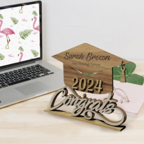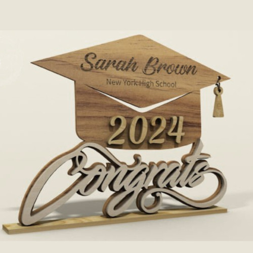 🎓 Personalized Wooden Graduation Cap Plaque – Custom Name, School & Year 🎓 Celebrate your graduate’s big achievement with a celebratory wooden graduation plaque , shaped like a classic graduation cap and engraved with their name and school . Featuring a beautiful stained finish , the plaque is accented with laser-cut numbers for the graduation year and the word "Congrats" proudly displayed at the bottom. Available in 3 sizes: Small - 6" in Wide X 4.75" in Tall Medium - 8" in Wide X 6.5" in Tall Large - 10" in Wide X 8" in Tall 🎉 Product Features: ✔️ Custom Engraving – Includes graduate’s name and school name (achievement, degree or honors optional) ✔️ Unique Design – Shaped like a graduation cap for a memorable keepsake ✔️ Cutout Graduation Year – Adds dimension and style to the plaque ✔️ Stained Finish – Rich wood stain enhances the natural grain and adds a finished look ✔️ Perfect Gift – Ideal for graduates of all ages, from high school to college ✔️ Ready to Display – Makes a great addition to party tables, shelves, or wall displays ✔️ Note: – Due to the natural characteristics of wood, grain patterns and color tones may vary slightly from piece to piece, making each item truly unique. Laser-cut edges may have a slight darkened or scorched appearance, which is a natural result of the process and adds character to the finished piece. This personalized graduation plaque is a one-of-a-kind way to honor a milestone moment. Whether for your child, a friend, or a fellow graduate, it’s a thoughtful gift they’ll treasure for years to come. 🎓 Custom-made with care – order now to celebrate your grad in style! 🎓