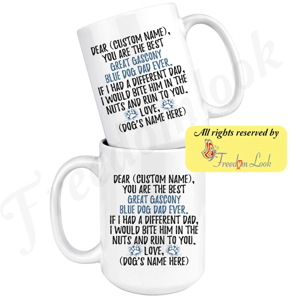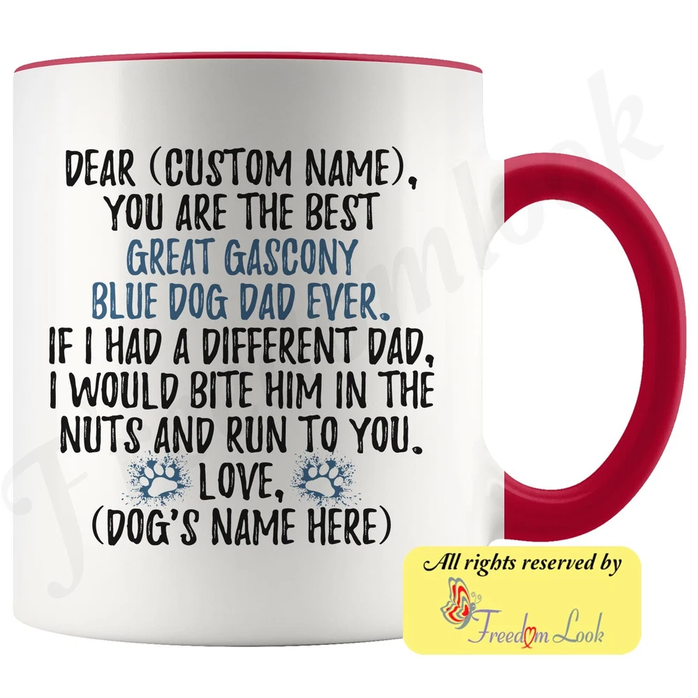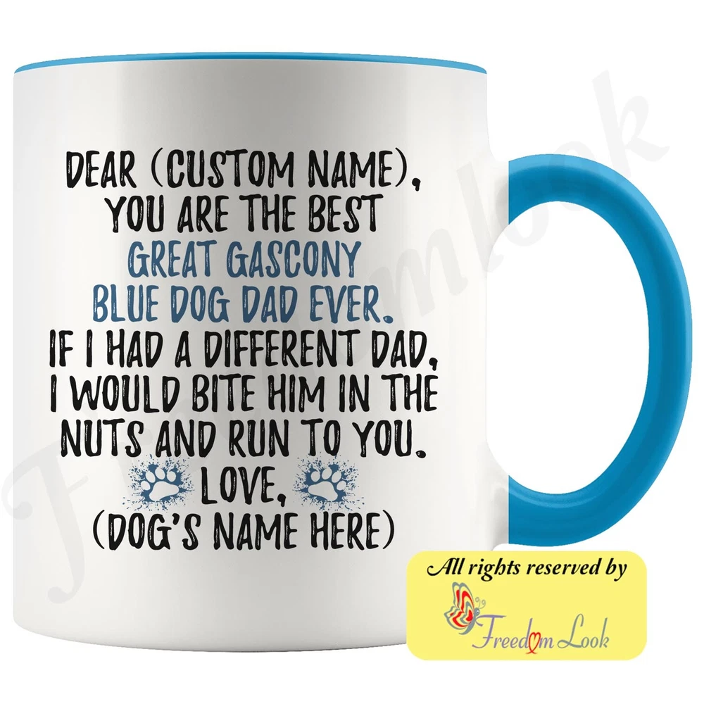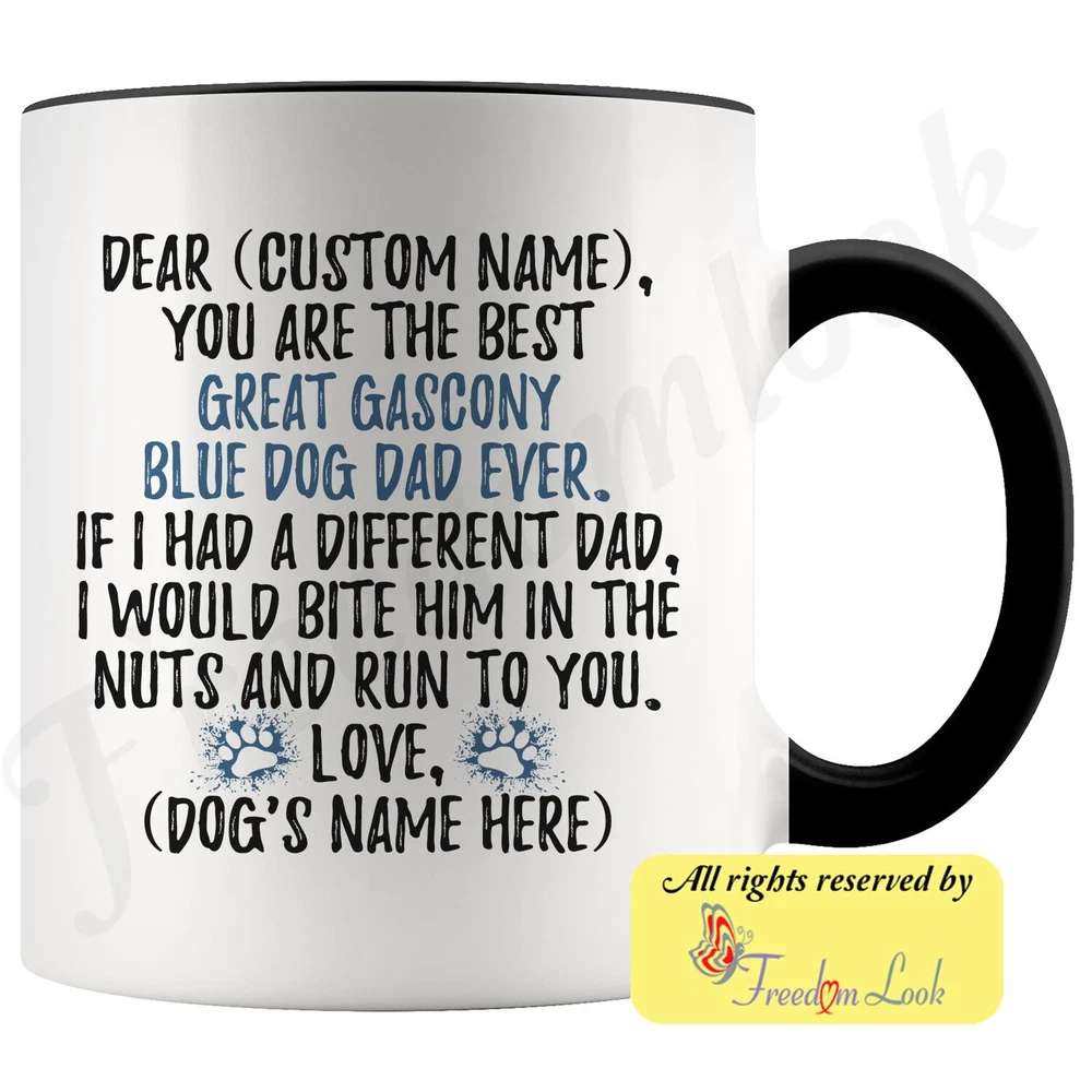 personalized great gascony blue dog mug, grand bleu de gascogne coffee mug, great gascony blue dog gifts, great gascony blue dad present gift, dog daddy mug, great gascony blue dog owner, i love great gascony blue, custom dog gifts, dog coffee cup, fathers day gift Are you looking for a great, unique and personalized gift for a dog owner? Search no more and get this mug TODAY. They will be thankful forever. Don't miss it because you'll regret it later by not getting it. This is the perfect coffee mug with content "DEAR 'CUSTOM NAME', YOU ARE THE BEST GREAT GASCONY BLUE DOG DAD EVER. IF I HAD A DIFFERENT DAD, I WOULD BITE HIM IN THE NUTS AND RUN TO YOU. LOVE, 'DOG'S NAME HERE' ". CUSTOM DAD'S NAME AND DOG'S NAME Please put the dad's and dog's name in the notes at the checkout or just send us a message. By not doing this, it will delay your order. Example: Dad's name: Bill; Dog's name: Charlie A PERFECT FUNNY GIFT FOR A GREAT GASCONY BLUE DOG DAD! This special coffee cup can be a great gift for every Grand Bleu de Gascogne dog dad. Sizes: Colored coffee mug size: 11 oz White coffee mug size: 11 oz or 15 oz DISHWASHER AND MICROWAVE SAFE! This version of ceramic mug shows it's true colors with quality assurance to withstand heat in the microwave and put it in the dishwasher as many times as you like, the quality will not be Altered. THE MUG DESIGN IS PRINTED ON BOTH SIDES! No matter if you hold your teacup in your right or left hand, you and everyone else will be able to see this unique design. Looking at this cute coffee mug will put a smile on everyone's face! We want you to be 100% satisfied, so please let us know if there is anything wrong with your order so we can fix it right away. We truly offer the most stunning, unique and trendy highest-quality products in the world. All of our products are custom-made-to-order and handcrafted to the highest quality standards. We stand by our products the quality is outstanding rest assured. Triple check your address , we copy addresses exactly as written, any undeliverable orders due to customer error are not our responsibility. Mug for every day. Christmas birthday brother sister mom mother father dad aunt grandma grandpa girlfriend gift