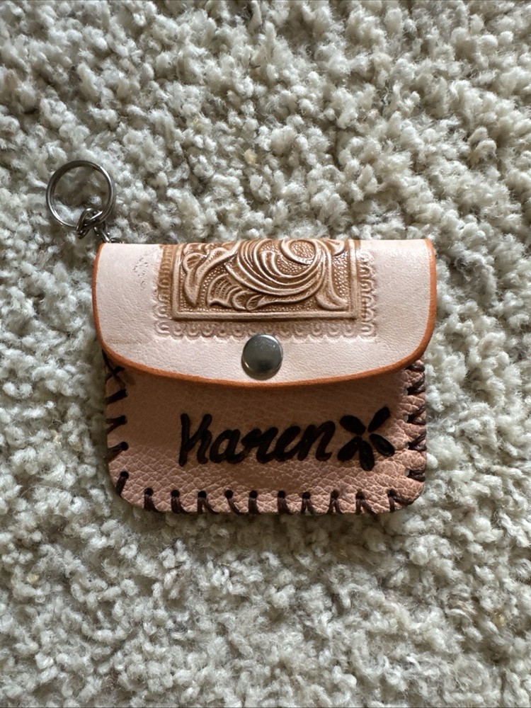 Beautiful handmade leather coin pouch/keychain with personalized name “Karen” and detailed embossed artwork. Originates from Jerez, Zacatecas, Mexico. Perfect for collectors or as a unique gift.