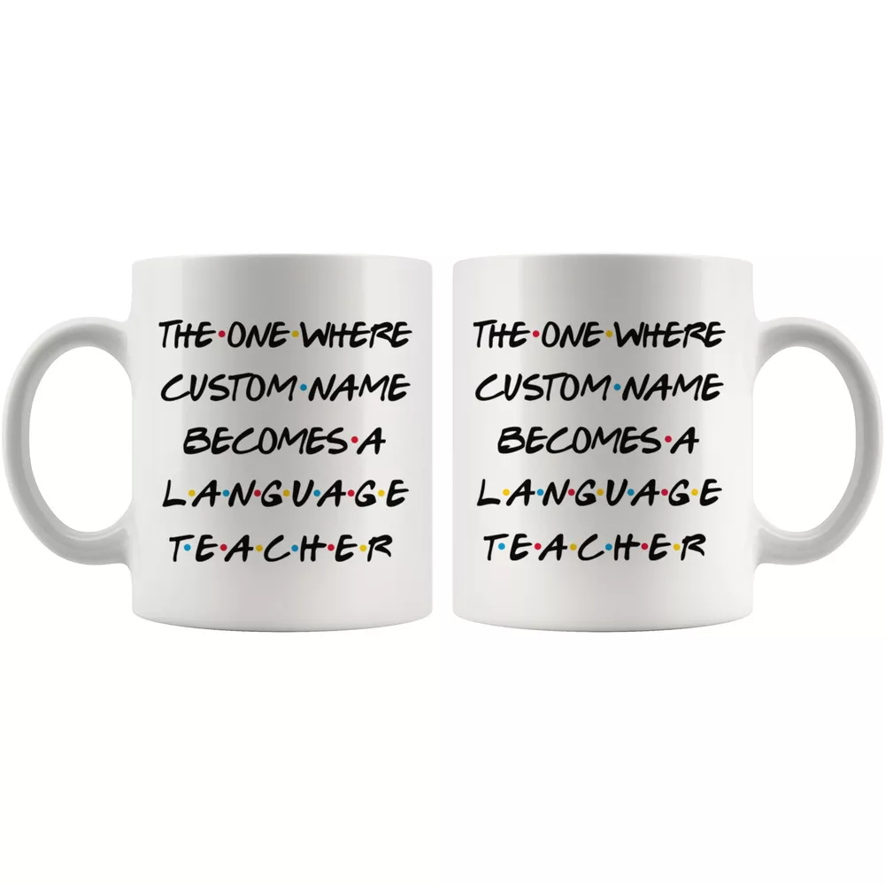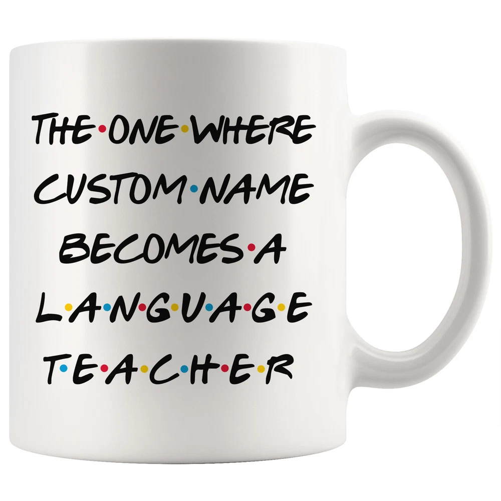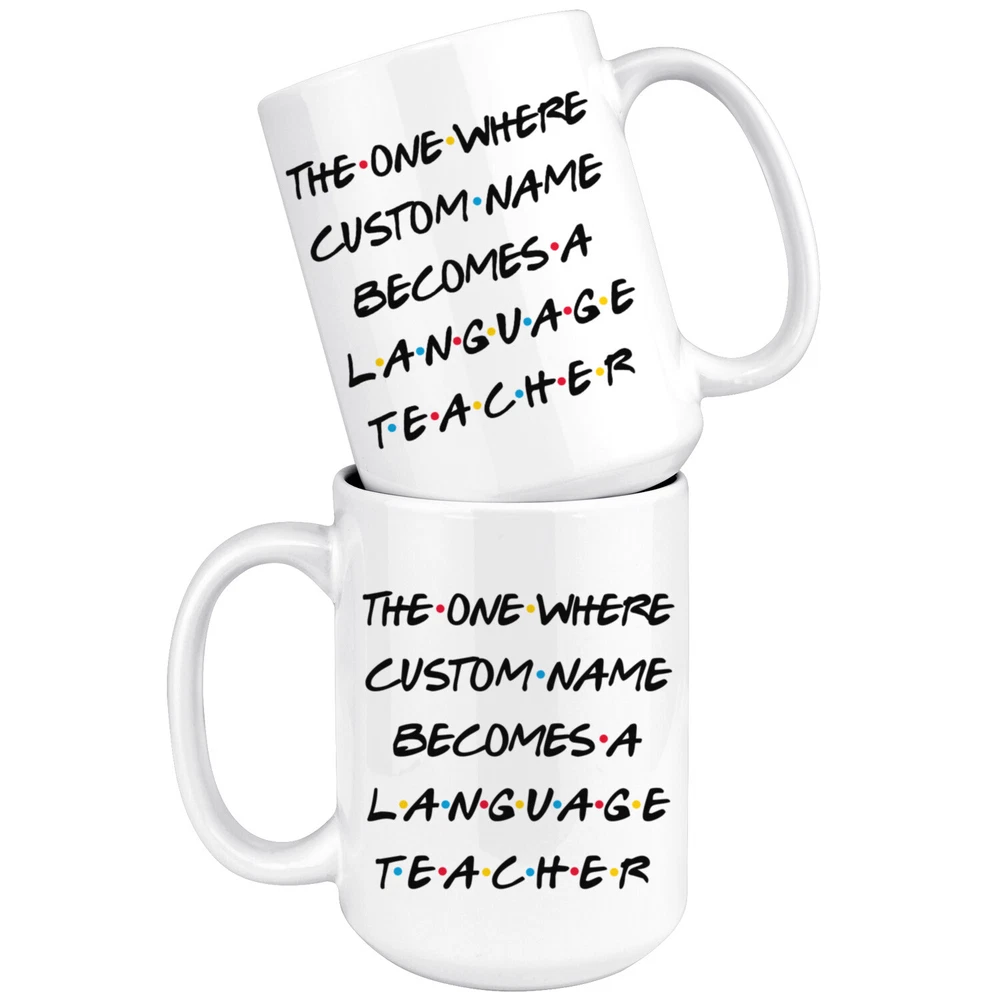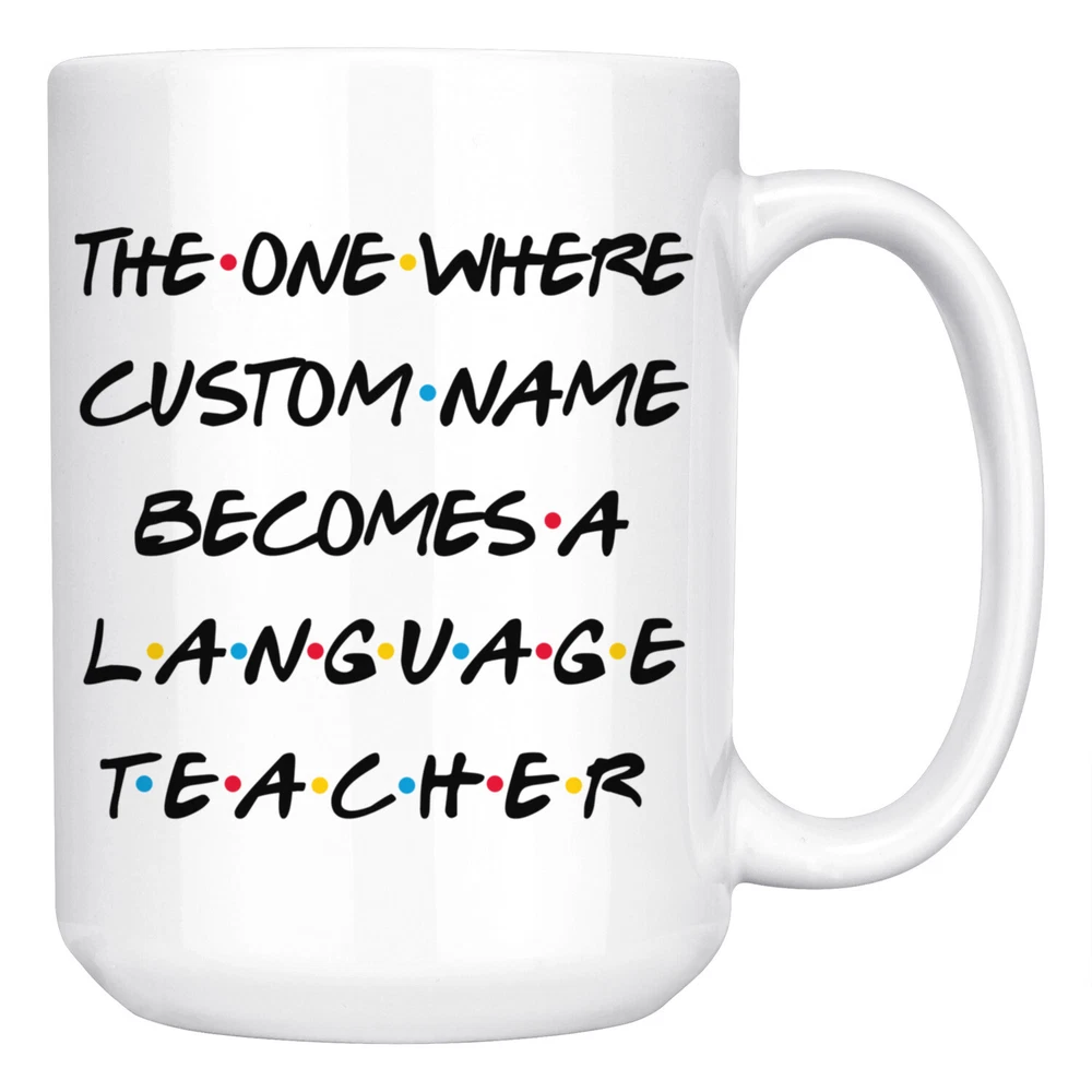personalized language teacher coffee mug, gift for a language teacher, language teacher graduation gift, language teacher job promotion, language teacher coffee cup, gifts for men & women, best language teacher mug, mothers day gift, fathers day gift, teacher career job appreciation gift, gifts for her, gifts for him This is the perfect coffee mug with content " THE ONE WHERE 'CUSTOM NAME' BECOMES A LANGUAGE TEACHER ". CUSTOM NAME Please put the custom name in the notes at the checkout or send us a message. By not doing this, it will delay your order. Example: Custom name: Lynda. A PERFECT GIFT FOR A LANGUAGE TEACHER ! This special coffee cup can be a great gift for the best Language Teacher. Bring a smile to your family member or friend with this unique gift . DISHWASHER AND MICROWAVE SAFE! This version of ceramic mug shows it's true colors with quality assurance to withstand heat in the microwave and put it in the dishwasher as many times as you like, the quality will not be Altered. THE MUG DESIGN IS PRINTED ON BOTH SIDES! No matter if you hold your teacup in your right or left hand, you and everyone else will be able to see this unique design. Looking at this cute coffee mug will put a smile on everyone's face! We want you to be 100% satisfied, so please let us know if there is anything wrong with your order so we can fix it right away.