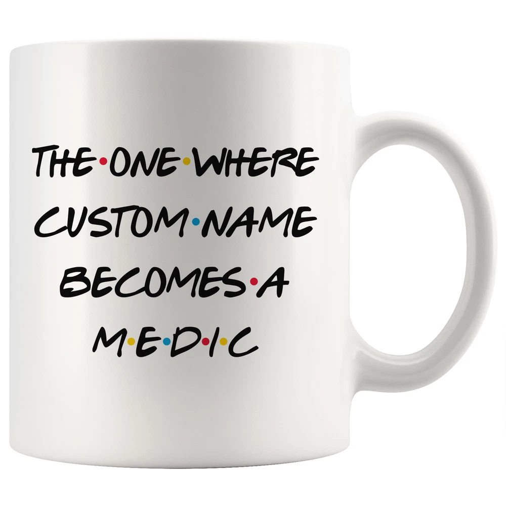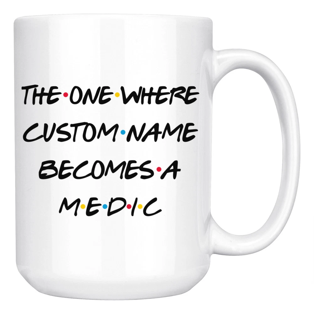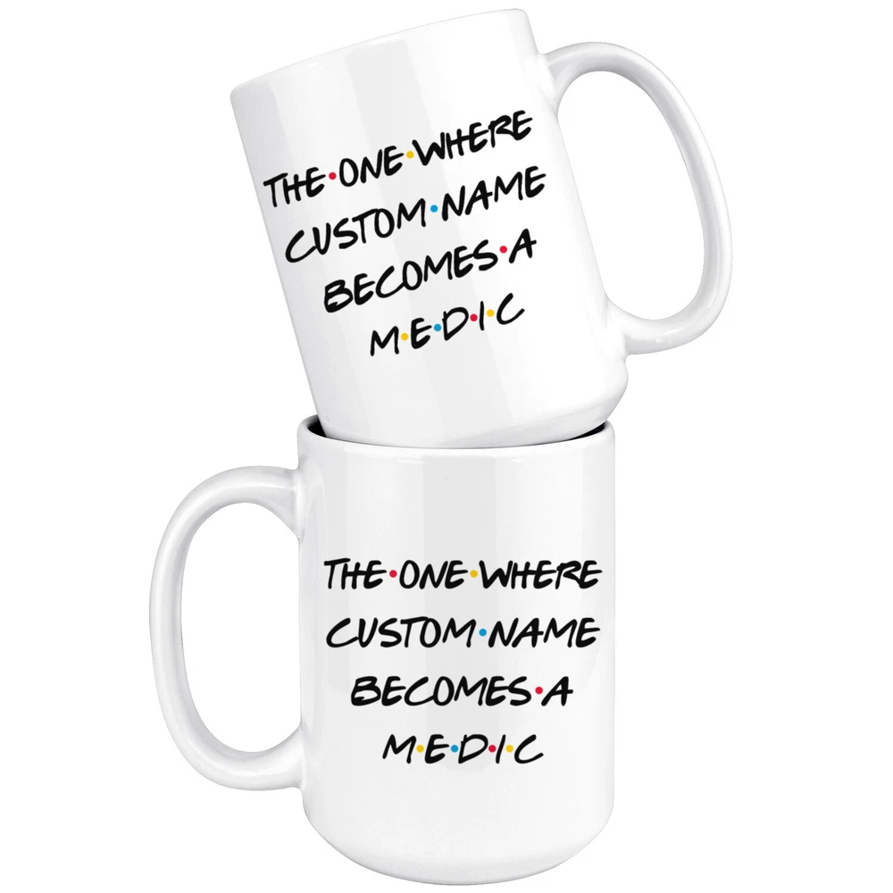 personalized medic coffee mug, gift for a medic, medic graduation gift, medic job promotion, medic coffee cup, gifts for men & women, best medic mug, mothers day gift, fathers day gift, medic career job appreciation gift, gifts for her, gifts for him This is the perfect coffee mug with content " THE ONE WHERE 'CUSTOM NAME' BECOMES A MEDIC ". CUSTOM NAME Please put the custom name in the notes at the checkout or send us a message. By not doing this, it will delay your order. Example: Custom name: Lynda. A PERFECT GIFT FOR A MEDIC ! This special coffee cup can be a great gift for the best Medic. Bring a smile to your family member or friend with this unique gift . DISHWASHER AND MICROWAVE SAFE! This version of ceramic mug shows it's true colors with quality assurance to withstand heat in the microwave and put it in the dishwasher as many times as you like, the quality will not be Altered. THE MUG DESIGN IS PRINTED ON BOTH SIDES! No matter if you hold your teacup in your right or left hand, you and everyone else will be able to see this unique design. Looking at this cute coffee mug will put a smile on everyone's face! We want you to be 100% satisfied, so please let us know if there is anything wrong with your order so we can fix it right away.