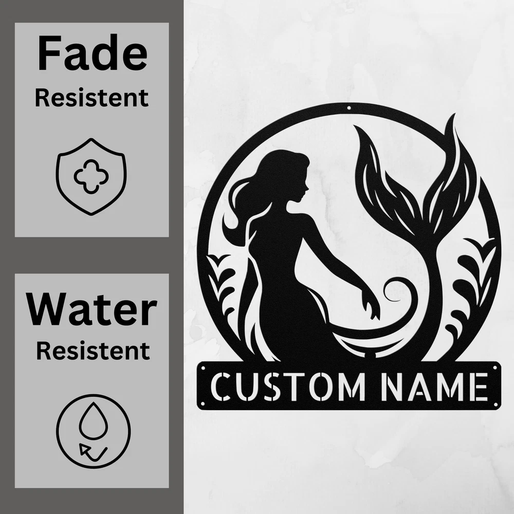 Product Description Personalized Mermaid Sign Custom Nautical Decor Gift for Ocean Lovers Home Decor Dive into a world of charm with the Personalized Mermaid Sign . This delightful sign is perfect for anyone who loves the ocean, making it an enchanting addition to your home or office decor. Crafted from 16 gauge high-quality metal , this sign is built to last. With a powder coating , it is dust, weather, and water-resistant, ensuring it looks beautiful both indoors and outdoors. Key features include: Customizable Design: Personalize with a name or special message for a unique touch. Durable Construction: Made from sturdy metal for long-lasting enjoyment. Perfect Gift Idea: Ideal for Christmas, birthdays, or any special occasion. Charming Decor: Great for beach houses, nurseries, or any room needing a whimsical touch. Transform your space with the Personalized Mermaid Sign . It’s not just a decoration; it’s a celebration of your love for the sea! Service and Color Choice Our metal signs are designed to be personalized just for you, making them the perfect addition to any space! The default color for our signs is Black , but we also offer a variety of beautiful options including Copper, Gold, White, and Silver . After placing your order, simply contact us with your preferred color choice, and we'll ensure your sign is exactly how you envision it. Let’s create something special together!