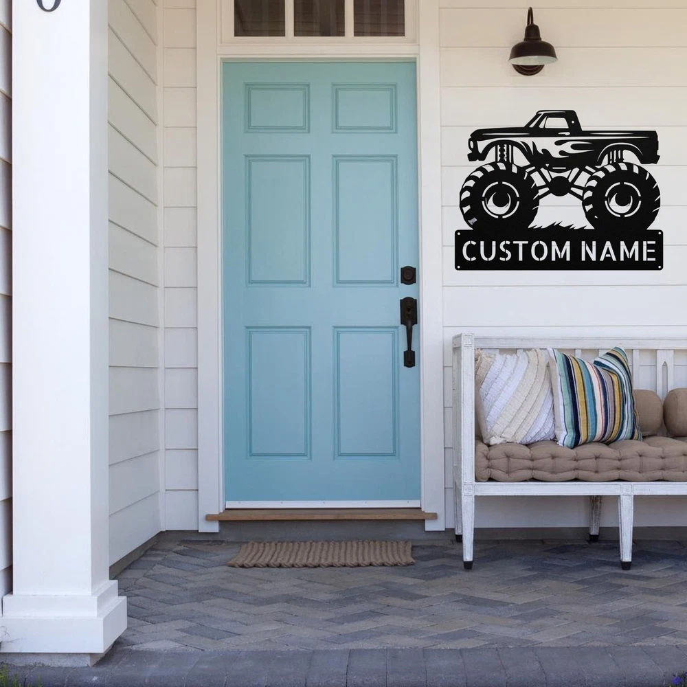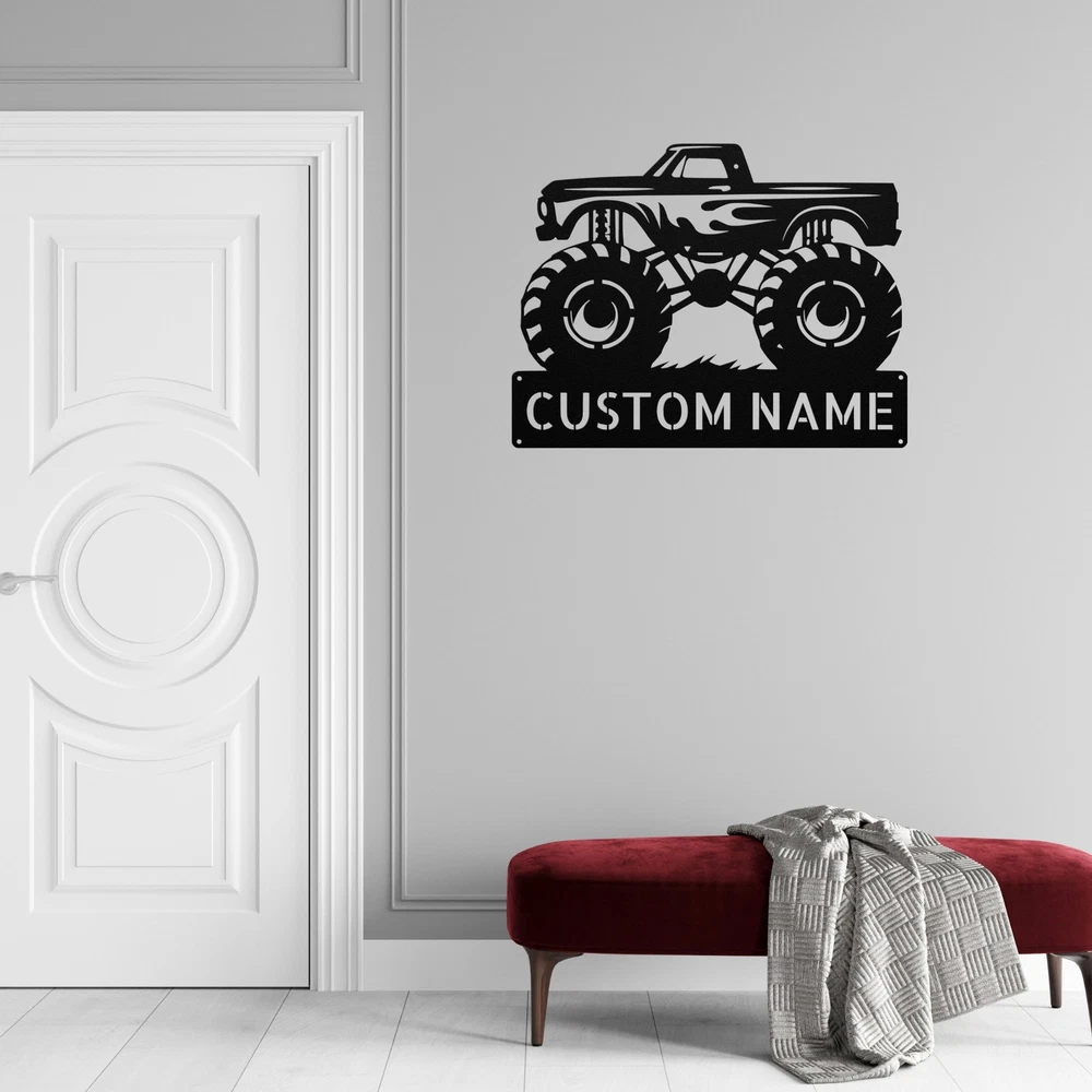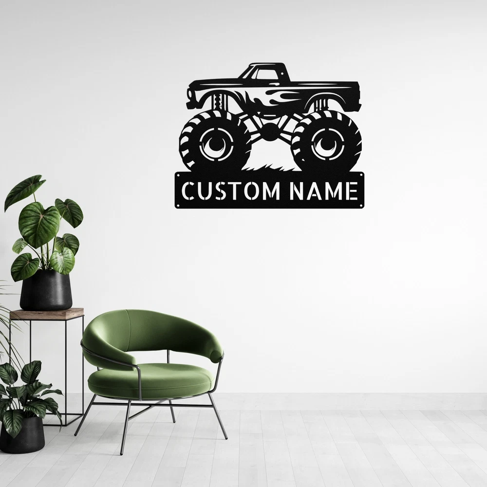 Product Description Personalized Monster Truck Metal Sign Custom Kids Room Decor Truck Lovers Gifts Rev up your decor with our Personalized Monster Truck Metal Sign ! Perfect for any young truck enthusiast or for adding a playful touch to your space, this sign is sure to impress. Crafted from 16 gauge high-quality metal , this sign is built to last. The powder coating makes it dust, weather, and water-resistant , ensuring it looks great both indoors and outdoors. Key features include: Customizable Design: Add a name or special message to create a unique sign that stands out. Durable Material: Made from high-quality metal, designed to withstand the elements. Great Gift Idea: Perfect for Christmas, birthdays, or any special occasion for truck lovers. Versatile Use: Ideal for a child’s bedroom, playroom, garage, or any space that needs a fun touch. Bring excitement and personality to your decor with the Personalized Monster Truck Metal Sign ! It’s not just a sign; it’s a celebration of your passion for all things monster trucks! Service and Color Choice Our metal signs are designed to be personalized just for you, making them the perfect addition to any space! The default color for our signs is Black , but we also offer a variety of beautiful options including Copper, Gold, White, and Silver . After placing your order, simply contact us with your preferred color choice, and we'll ensure your sign is exactly how you envision it. Let’s create something special together!