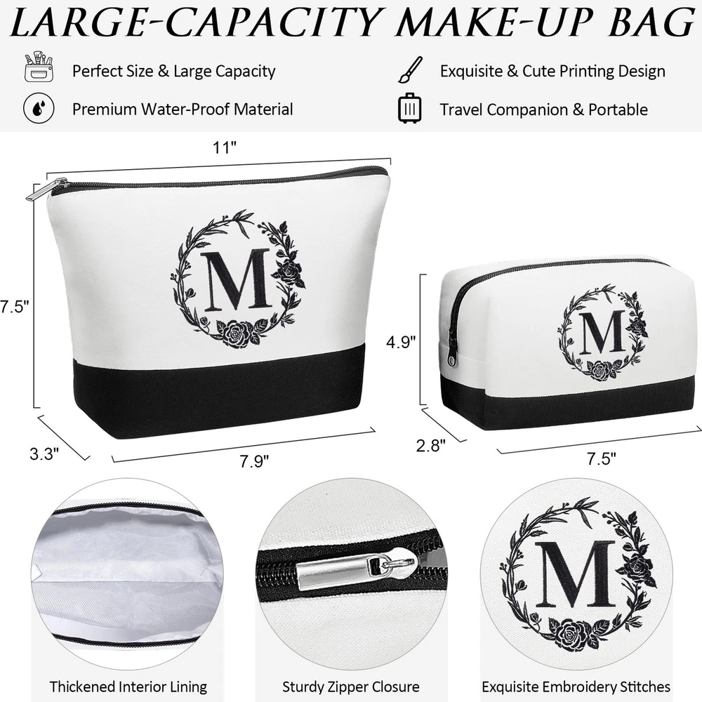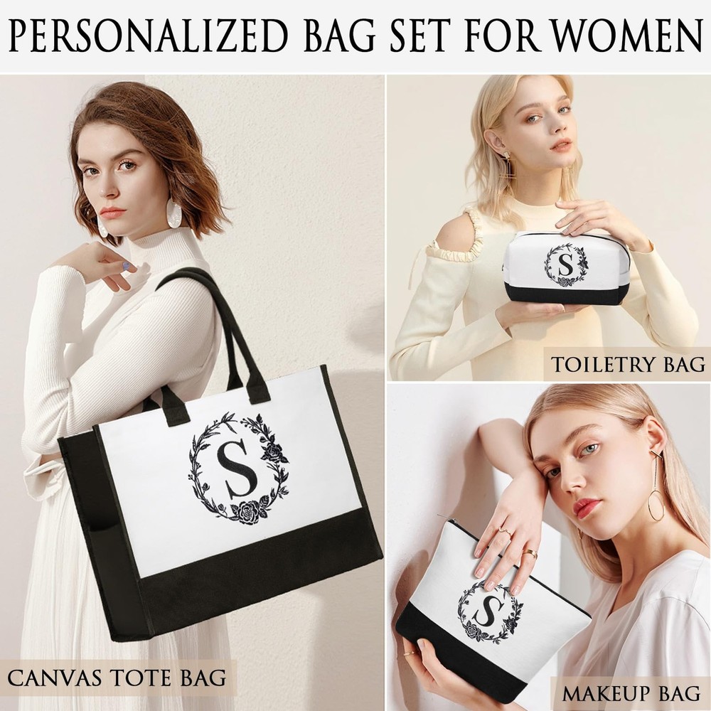 Embroidery Initial Canvas Tote Bag Makeup Bags Set Personalized Gifts for Women Mom Sister Best Friends Teacher Daughter Girlfriend Searching for a stunning personalized gifts for women to warm the heart of the special lady in your life? Want to make a lasting impression with a high-end birthday, Christmas, or Mother’s Day gifts? Dreaming of gifting an exquisite monogrammed tote bag set that exudes style and elegance? Personalized Gifts for Women Monogrammed Initial Jute Tote Bag & Makeup Bags Gifts Set is precisely what you need. Crafted from premium materials and showcasing exquisite workmanship, this gift set is sure to exceed expectations. Treat her to this stylish large jute tote bag and adorable makeup bags set adorned with high-density initial embroidery, delighting her and making her feel truly cherished. Ample Space: The elegant initial tote bag measures 17" x 13" x 6.7", providing generous space for all your essentials, including groceries books, clothes, towels, shoes, laptops, makeup,snacks, lunch box and other commodities for daily use. Versatile Functionality: Its flexible design allows the tote bag for women to serve multiple purposes, working as a grocery storage bag, shopping bag, gym bag, travel tote bag, weekend bag, work tote bag, beach tote bag, nurse bag, teacher bag, making it suitable for various activities. Easy to Organize: The set also includes a large cosmetic bag (11" x 7.5" x 3.3") and a small makeup bag (7.5" x 4.9" x 2.8"), providing organized and separate spaces for storing cosmetics, toiletries, or snacks, ensuring that you can easily access everything they need when on the go. Adjustable Detachable Strap: This personalized tote bags feature a detachable shoulder strap that adjusts from 21" to 39". Easily switch between crossbody bag, shoulder bag, or handbag styles to suit your comfort and preferences, making it perfect for any outing. LARGE CAPACITY: This initial tote bag for women (17" x 13" x 6.7") is spacious enough for clothes, shoes, laptops, etc. The canvas tote bag works as a grocery storage bag, shopping or gym bag, travel tote bag, beach bag. The large cosmetic bag (11" x 7.5" x 3.3") and small makeup bag (7.5" x 4.9" x 2.8") provide secure, organized spaces for makeup, toiletries, or snacks. With its versatile design, it makes practical gifts for women on the go, perfect for travel, everyday use, or as a snack pouch PORTABLE & MULTIFUNCTIONAL TOTE BAG: This canvas tote bag for women includes a detachable shoulder strap (21"-39") and can be used as a crossbody, shoulder, or handbag. The large tote bags for women has an inside zip pocket for keys, phone, cash etc. and side pocket for a water bottle, umbrella or magazine. This monogrammed tote bags for women in classic black and white complements any outfit for various occasions. Perfect for weekend trips, work, shopping, travel, beaches, picnics and more PREMIUM QUALITY AND DURABLE: The travel tote bag and toiletry bag are made of premium canvas with a waterproof lining, and double stitching ensures the Personalized Birthday Christmas gifts for women sturdy enough to hold many items without tearing. The unique Mothers day birthday gifts for women friend mom sister personalized bags for women features finely embroidered initials for an elegant look. Ideal as Best Friend Birthday Gifts Christmas Mothers Day Gifts for Women Mom Sister Daughter MONOGRAM & ROSE EMBROIDERY DESIGN: Our initial beach tote bag features distinctive high-density embroidery, instead of ordinary prints, adding a luxurious touch and setting you apart with unmatched personality and taste. The rose on the wreath, symbolizing love and romance, makes it a perfect gift, evoking timeless feelings of affection and admiration. Choose initials that represent names or letters with special meanings as individual & Personalized Gifts for Women, they will definitely love it IDEAL DAILY COMPANION: This initial tote bag & makeup bags set for women feature a spacious design, making them perfect for organizing essentials for beach, travel, camping, swimming, gym and yoga. The Bridesmaid Gifts Wedding Bridal Shower Gifts Monogrammed Gifts for Women are perfect for carrying essentials like cosmetics, toiletries, jewelry & outfits. It is also a great commuter bag for holding magazine, laptop, lunch, and it serves well as a handy shopping bag for groceries, snacks & drinks PERSONALIZED GIFTS FOR WOMEN: The women tote bag set can also be used as gifts for her, mom, sister, friend, daughter, girlfriend, coworker, teacher on birthday, Christmas, Mother's Day, Valentine's Day, Boss's Day, Teacher's Day, Nurse Week, retirement, graduation, wedding, Thanksgiving, which will surely surprise them! This Personalized Gifts for Women is also an excellent way to thank bridesmaids, hostess, brides-to-be, friends, relatives &guests for their love and support on your special day REUSABLE & IDEAL GIFTS: HAND WASH ONLY! Join the movement to save our planet by choosing our Reusable Personalized Monogrammed Tote Bag & Travel Makeup Bag Set for Women instead of plastic ones to reduce environmental impact. With initial-embroidery design, this set not only highlights her unique style but represents her name, making it perfect as teacher appreciation gifts, nurse week gifts, graduation gifts, thank you gifts, best friend gifts, Valentine’s Day gifts for girlfriend STYLISH & FASHIONABLE: Our Canvas Tote Bag Toiletry Bags Gifts for Women will elevate her look, showcase her unique style & add a touch of elegance. It will lets her stand out at every occasion and effortlessly capture fashionable moments in casual poses. Along with a classic dot ribbon, the beach bag becomes a chic accessory. Just choose from a variety of initial-embroidery designs to find the perfect option for your special lady. And gift her this trendy set to express your love and care