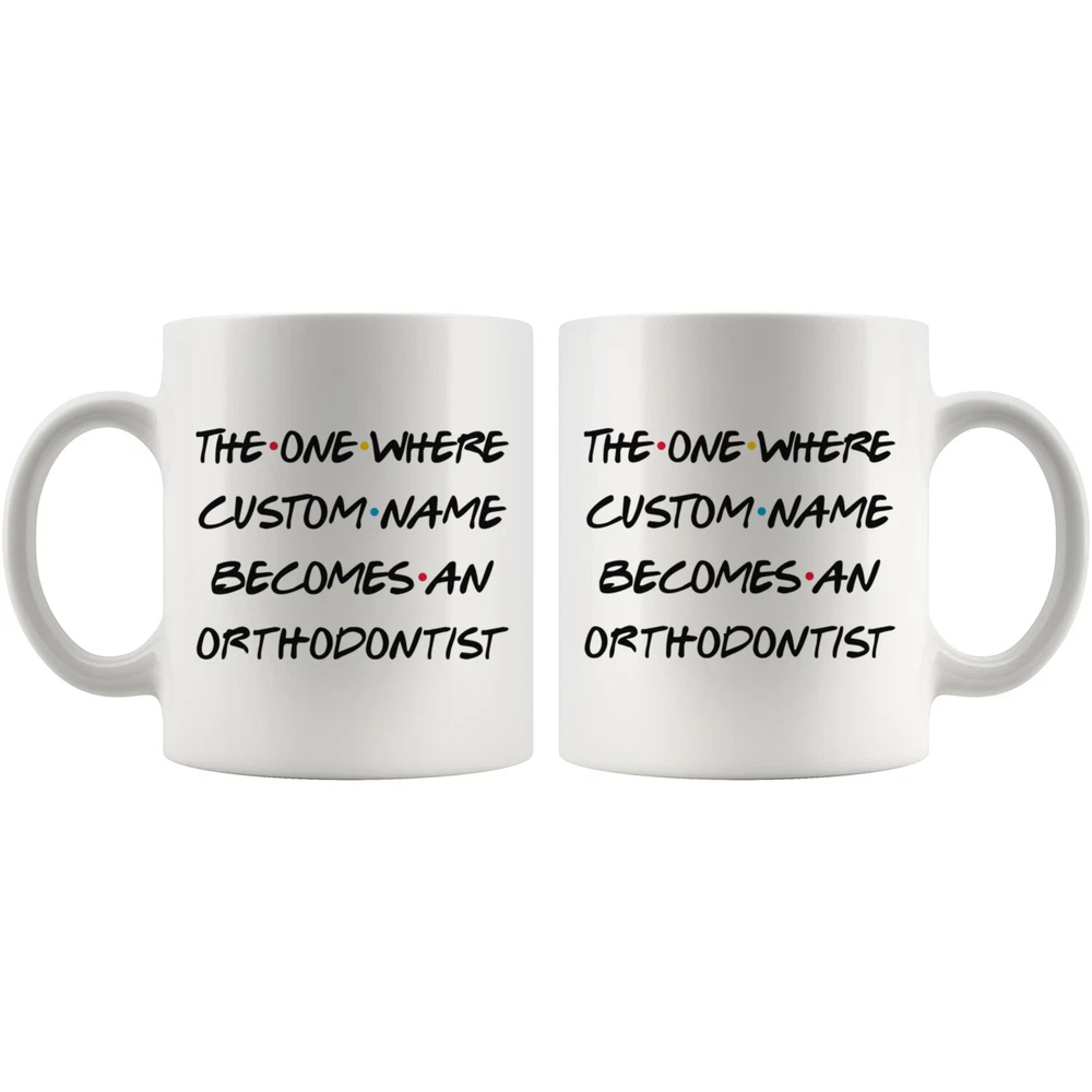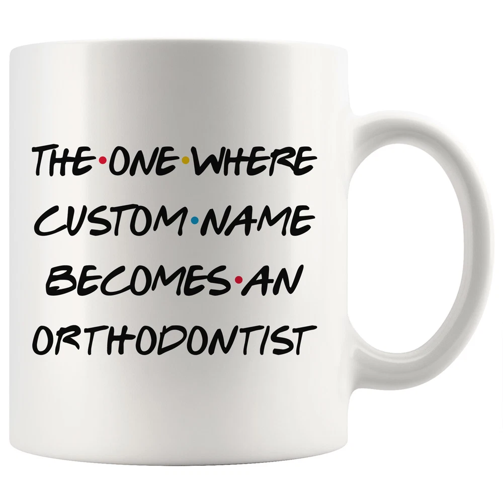 personalized orthodontist coffee mug, gift for an orthodontist, orthodontist graduation gift, orthodontist job promotion, orthodontist coffee cup, gifts for men & women, best orthodontist mug, mothers day gift, fathers day gift, orthodontist career job appreciation gift, gifts for her, gifts for him This is the perfect coffee mug with content " T THE ONE WHERE 'CUSTOM NAME' BECOMES AN ORTHODONTIST ". CUSTOM NAME Please put the custom name in the notes at the checkout or send us a message. By not doing this, it will delay your order. Example: Custom name: Lynda. A PERFECT GIFT FOR AN ORTHODONTIST ! This special coffee cup can be a great gift for the best Orthodontist. Bring a smile to your family member or friend with this unique gift . DISHWASHER AND MICROWAVE SAFE! This version of ceramic mug shows it's true colors with quality assurance to withstand heat in the microwave and put it in the dishwasher as many times as you like, the quality will not be Altered. THE MUG DESIGN IS PRINTED ON BOTH SIDES! No matter if you hold your teacup in your right or left hand, you and everyone else will be able to see this unique design. Looking at this cute coffee mug will put a smile on everyone's face! We want you to be 100% satisfied, so please let us know if there is anything wrong with your order so we can fix it right away.