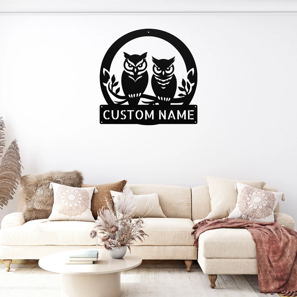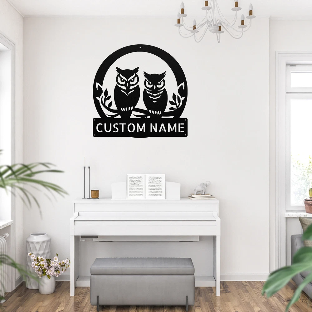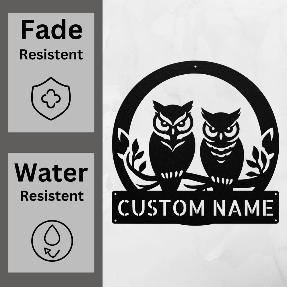 Product Description Personalized Owl Couple Metal Sign Custom Name Decor Perfect Gift for Couples Celebrate love and togetherness with our Personalized Owl Couple Metal Sign ! This charming sign is a delightful addition to any home or office, showcasing the special bond between you and your loved one. Crafted from 16 gauge high-quality metal , this sign is designed to last. The powder coating makes it dust, weather, and water-resistant, ensuring it remains beautiful whether displayed indoors or outdoors. Key features include: Customizable Design: Personalize it with your names or a special date to make it uniquely yours. Durable Construction: Built to withstand the elements, perfect for outdoor or indoor decor. Thoughtful Gift Idea: An ideal present for Christmas, birthdays, anniversaries, or any special occasion. Charming Decor: Add a touch of whimsy and warmth to your space with this adorable design. Showcase your love with the Personalized Owl Couple Metal Sign . It’s not just a sign; it’s a celebration of your unique relationship! Service and Color Choice Our metal signs are designed to be personalized just for you, making them the perfect addition to any space! The default color for our signs is Black , but we also offer a variety of beautiful options including Copper, Gold, White, and Silver . After placing your order, simply contact us with your preferred color choice, and we'll ensure your sign is exactly how you envision it. Let’s create something special together!