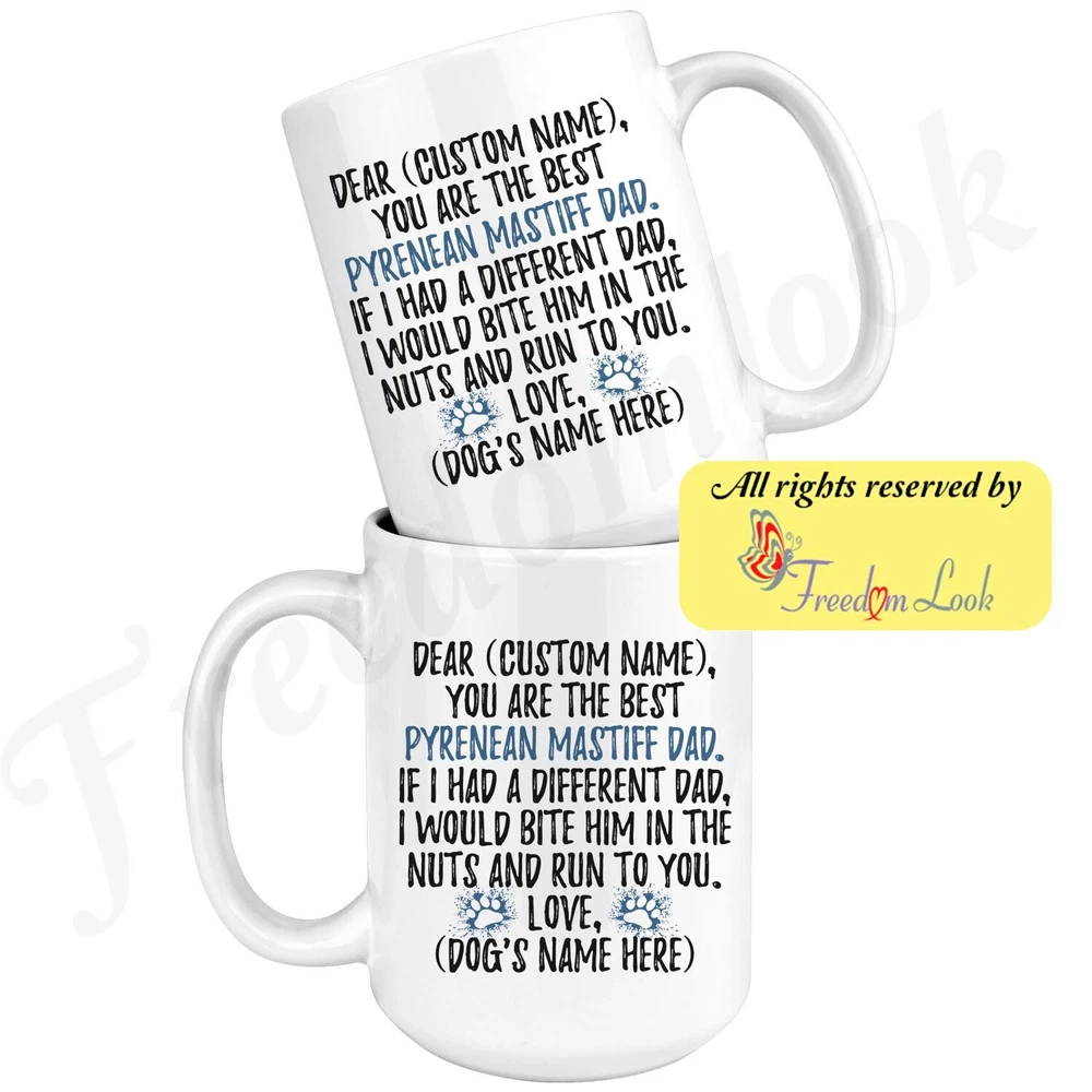 personalized pyrenean mastiff dog mug, mastín del pirineo coffee mug, mostín d'o pireneu gifts, pyrenean mastiff dad present gift, pyrenean mastiff dog daddy, pyrenean mastiff dog owner, i love dogs, custom dog gift, dog coffee cup, fathers day gift Are you looking for a great, unique and personalized gift for a dog owner? Search no more and get this mug TODAY. They will be thankful forever. Don't miss it because you'll regret it later by not getting it. This is the perfect coffee mug with content "DEAR 'CUSTOM NAME', YOU ARE THE BEST PYRENEAN MASTIFF DAD. IF I HAD A DIFFERENT DAD, I WOULD BITE HIM IN THE NUTS AND RUN TO YOU. LOVE, 'DOG'S NAME HERE' ". CUSTOM DAD'S NAME AND DOG'S NAME Please put the dad's and dog's name in the notes at the checkout or just send us a message. By not doing this, it will delay your order. Example: Dad's name: Bill; Dog's name: Charlie A PERFECT FUNNY GIFT FOR A PYRENEAN MASTIFF DOG DAD! This special coffee cup can be a great gift for every Pyrenean Mastiff dad. Sizes: Colored coffee mug size: 11 oz White coffee mug size: 11 oz or 15 oz DISHWASHER AND MICROWAVE SAFE! This version of ceramic mug shows it's true colors with quality assurance to withstand heat in the microwave and put it in the dishwasher as many times as you like, the quality will not be Altered. THE MUG DESIGN IS PRINTED ON BOTH SIDES! No matter if you hold your teacup in your right or left hand, you and everyone else will be able to see this unique design. Looking at this cute coffee mug will put a smile on everyone's face! We want you to be 100% satisfied, so please let us know if there is anything wrong with your order so we can fix it right away. We truly offer the most stunning, unique and trendy highest-quality products in the world. All of our products are custom-made-to-order and handcrafted to the highest quality standards. We stand by our products the quality is outstanding rest assured. Triple check your address , we copy addresses exactly as written, any undeliverable orders due to customer error are not our responsibility. Mug for every day. Christmas birthday brother sister mom mother father dad aunt grandma grandpa girlfriend gift