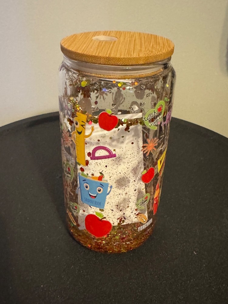 This will make the perfect teacher gift. A custom made 16oz snow globe tumbler. This is a glass tumbler that comes with the lid and straw.