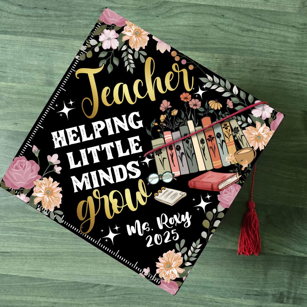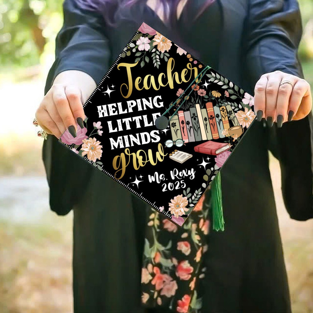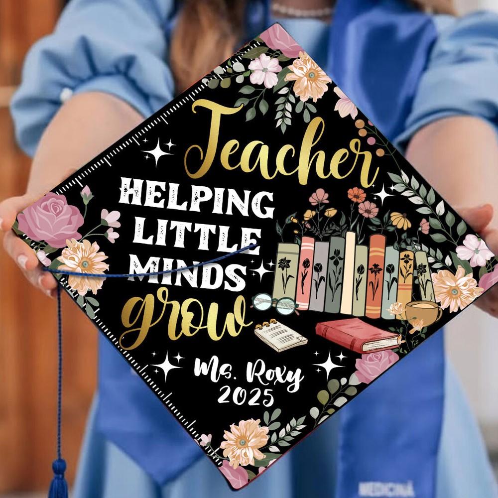 This personalized Teacher Helping Little Minds Grow Graduation Cap Topper is a handmade acrylic topper designed to enhance your graduation cap with a touch of color and personalization. The multi-color design is gender-neutral, making it suitable for anyone. The topper can be customized by entering the name you want on the Personalization Instructions. Made in Vietnam, this unique accessory is a special addition to your graduation attire, representing the inspiring work of teachers in helping young minds grow. Product Details: - Material: Acrylic - 9.5 x 9.5 inches printed Acrylic topper - Double-sided adhesive to attach to your cap - It's easy to apply to your graduation cap up to minutes before graduation.