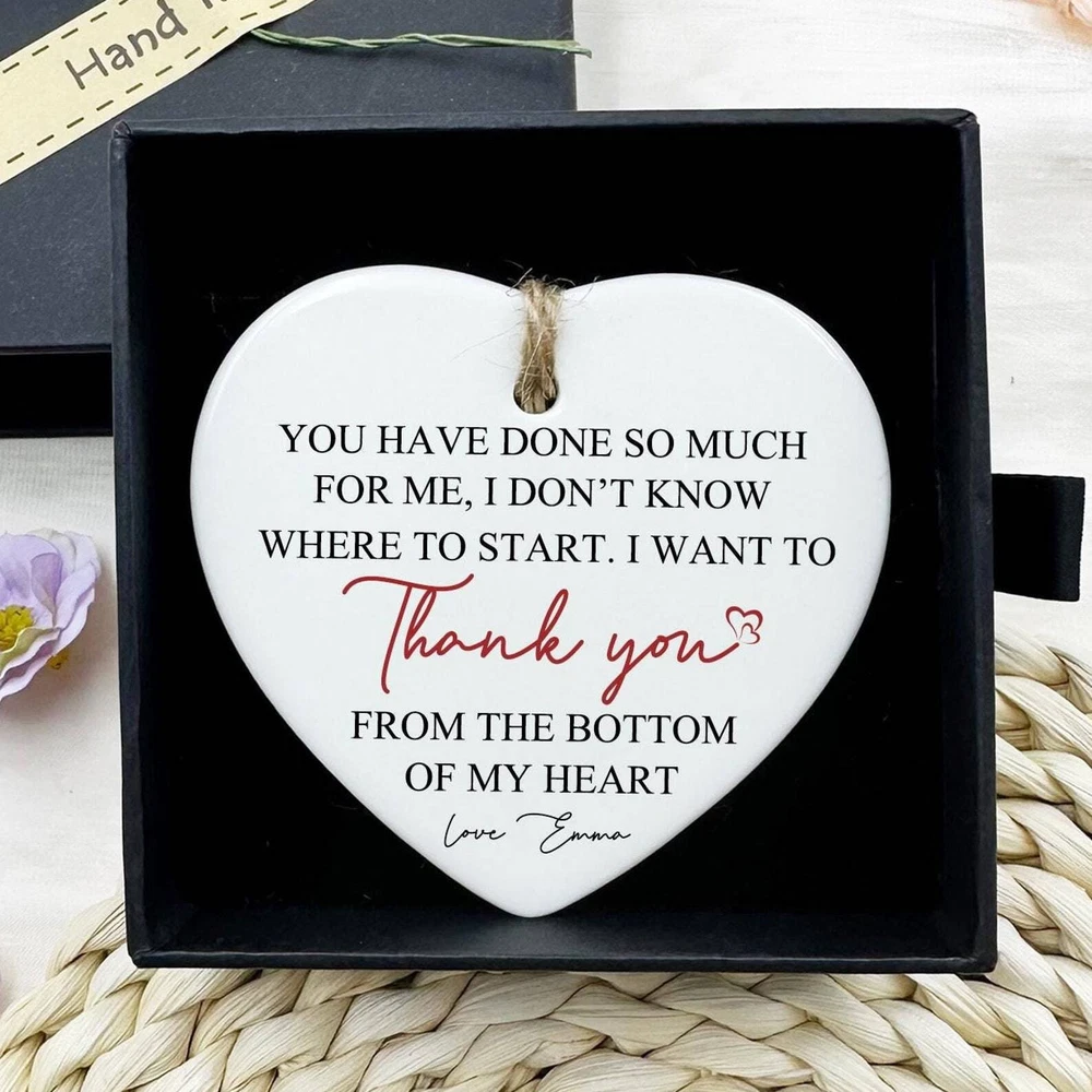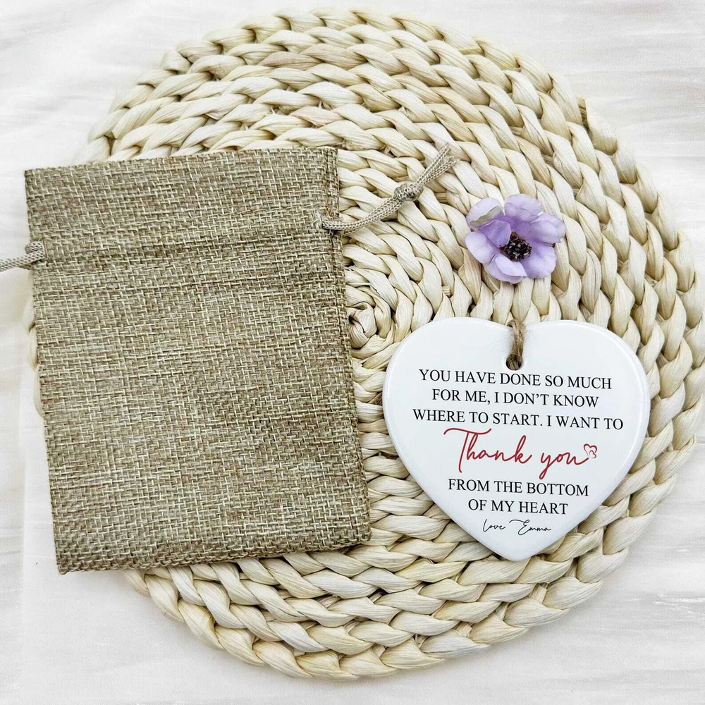 Personalized Thank You Ceramic Ornament Gift For Her Teacher Mom Gifts Christmas Gifts Name On Ornament Couple Ornament Heart Shape Material: Ceramic Color: White Shapes: Circle, star, heart and oval Can be printed on both sides Imprint full-color artwork, photos, or logos Hole for hanging string and hanging string included Printed in the USA
