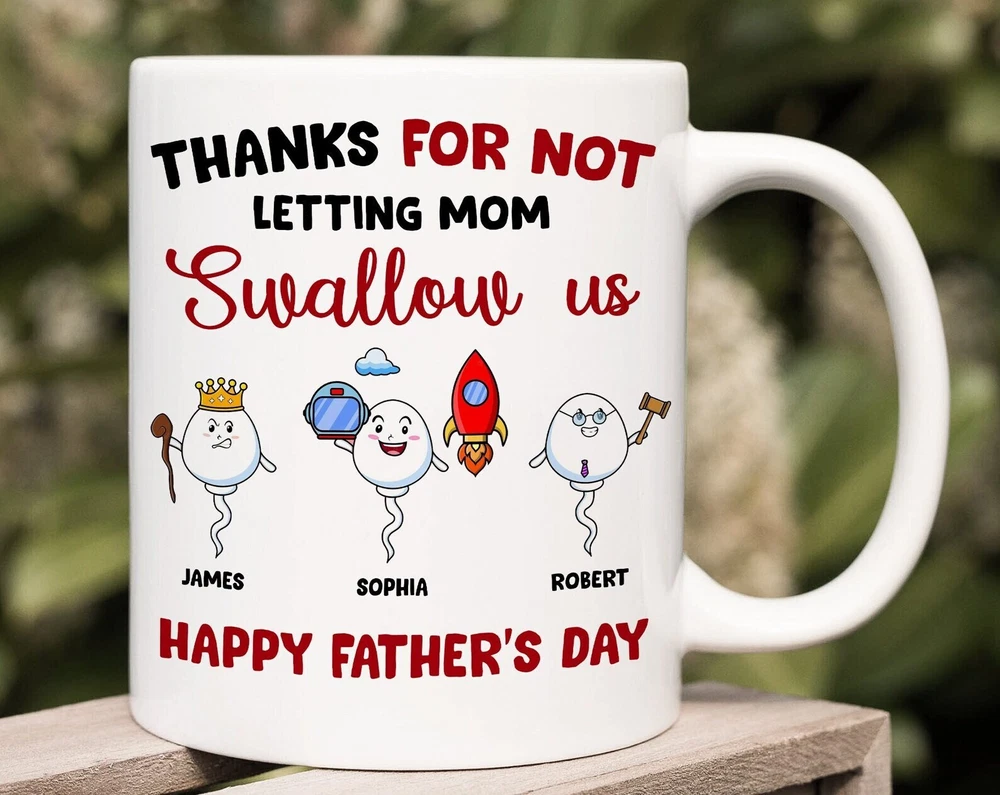 Personalized Thanks For Not Letting Mom Swallow Us Mug Father's Day Gift For Dad Product Details.. This high quality 11oz. ceramic white mug has a premium hard coat that provides crisp and vibrant color reproduction sure to last for years. Perfect for all hot & cold beverages. The highest quality printing possible is used. It will never fade no matter how many times you wash it. Material: 100% Ceramic. Print both sides. Dishwasher and Microwave Safe. High Gloss + Premium White Finish. Printed in the U.S.A. Personalized & Custom. We support personalized and custom mug to add custom, when placing an order, you can add notes to the "order note" in shipping address section. Also you can contact us directly via message. Shipping Info. Ready to ship in 1 to 2 business days, All products are made-to-order and proudly printed in the United States. Shipped by USPS and DHL, You will receive your order in 5-7 days. Replace & Refund. All products are defective during shipping broken, chipped will be replaced free of charge. You are not satisfied with the product, we will refund 100% money to you. If any other issues arise, please do not hesitate to message, we would be more than happy to assist you.