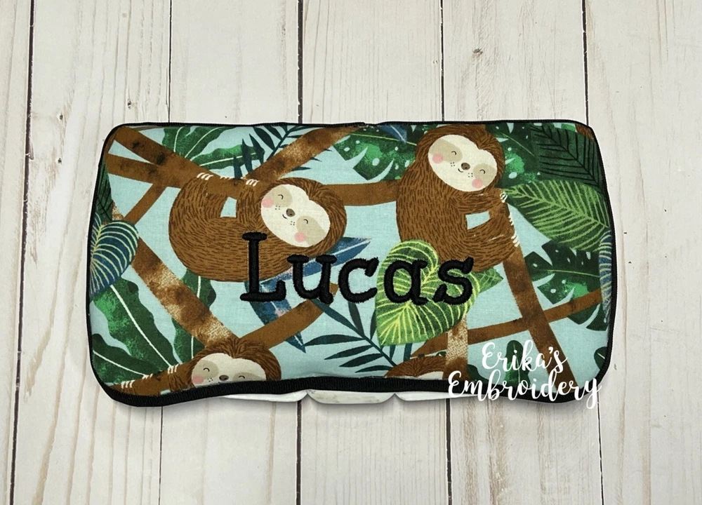 Super cute personalized travel size wipe case with a cute Sloth print fabric. Wipe case can be personalized with your choice of 1-2 names. Wipe case is slim and compact. It is padded with fabric on both sides and finished with a grosgrain ribbon. These make really nice and unique baby shower gifts. *The pop up center lid will not be usable once I put fabric over it. But this is the only style I have found. Approximate size: 8.5" x 5" x 1"