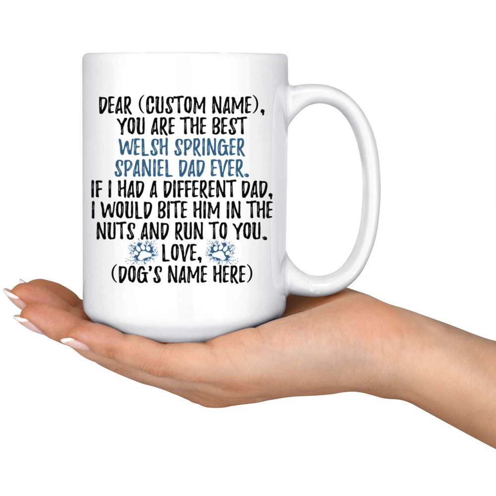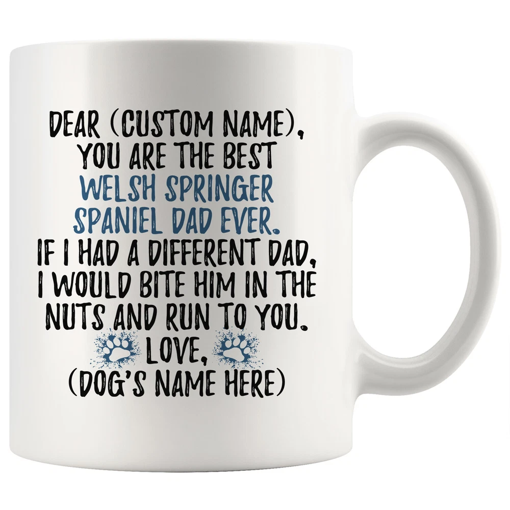 personalized welsh springer dog mug, welsh springer springer coffee mug, welsh cocker spaniel dog gifts, welsh starter dad present gift, welshie dog daddy mug, welsh springer dog owner mug, i love welsh springer dog, custom welsh springer dog gift, dog coffee cup, fathers day gift This is the perfect coffee mug with content "DEAR 'CUSTOM NAME', YOU ARE THE BEST WELSH SPRINGER SPANIEL DAD EVER. IF I HAD A DIFFERENT DAD, I WOULD BITE HIM IN THE NUTS AND RUN TO YOU. LOVE, 'DOG'S NAME HERE' ". CUSTOM DAD'S NAME AND DOG'S NAME Please put the dad's name and dog's name in the notes at the checkout or send us a message. By not doing this, it will delay your order. Example: Dad's Name: Bill; Dog's name: Charlie PERFECT FUNNY GIFT FOR A WELSH SPRINGER SPANIEL DOG DAD! This special coffee cup can be a great gift for every Welsh Springer Spaniel dad. DISHWASHER AND MICROWAVE SAFE! This version of ceramic mug shows it's true colors with quality assurance to withstand heat in the microwave and put it in the dishwasher as many times as you like, the quality will not be Altered. THE MUG DESIGN IS PRINTED ON BOTH SIDES! No matter if you hold your teacup in your right or left hand, you and everyone else will be able to see this unique design. Looking at this cute coffee mug will put a smile on everyone's face! We want you to be 100% satisfied, so please let us know if there is anything wrong with your order so we can fix it right away.