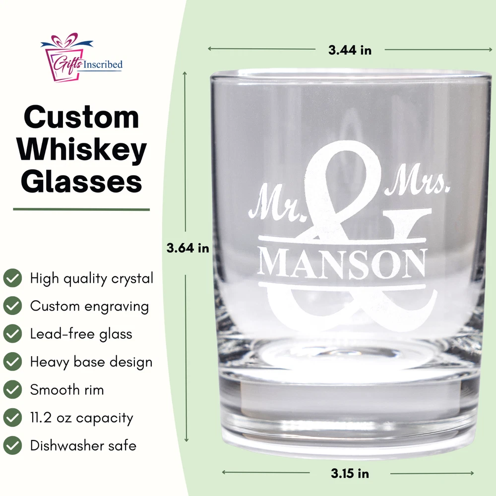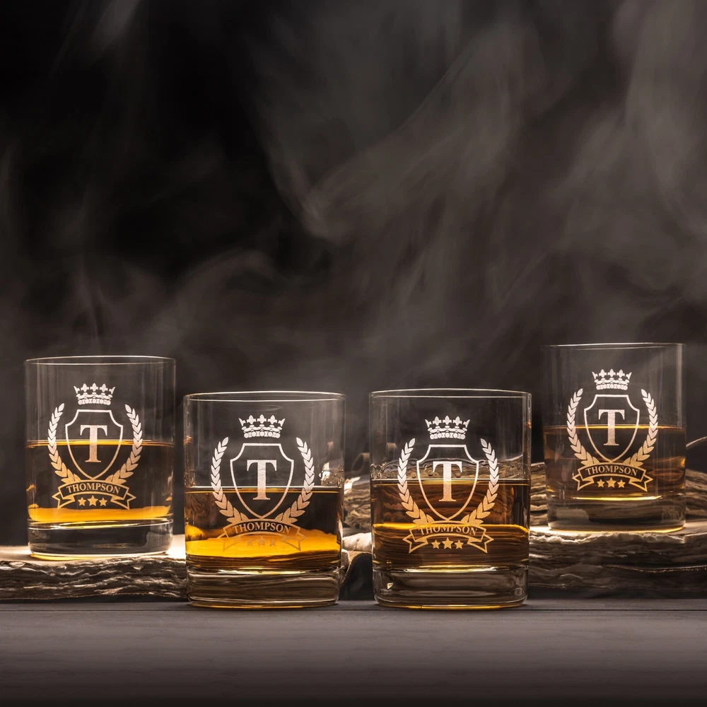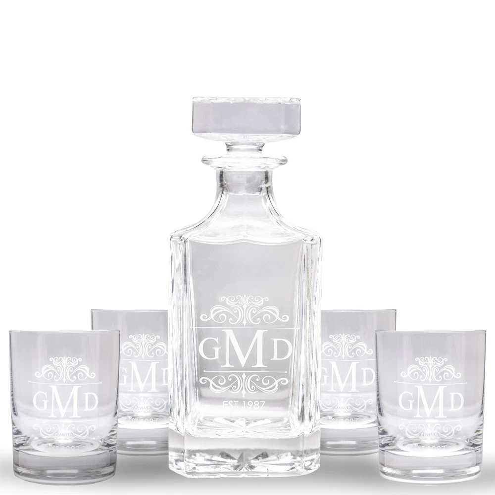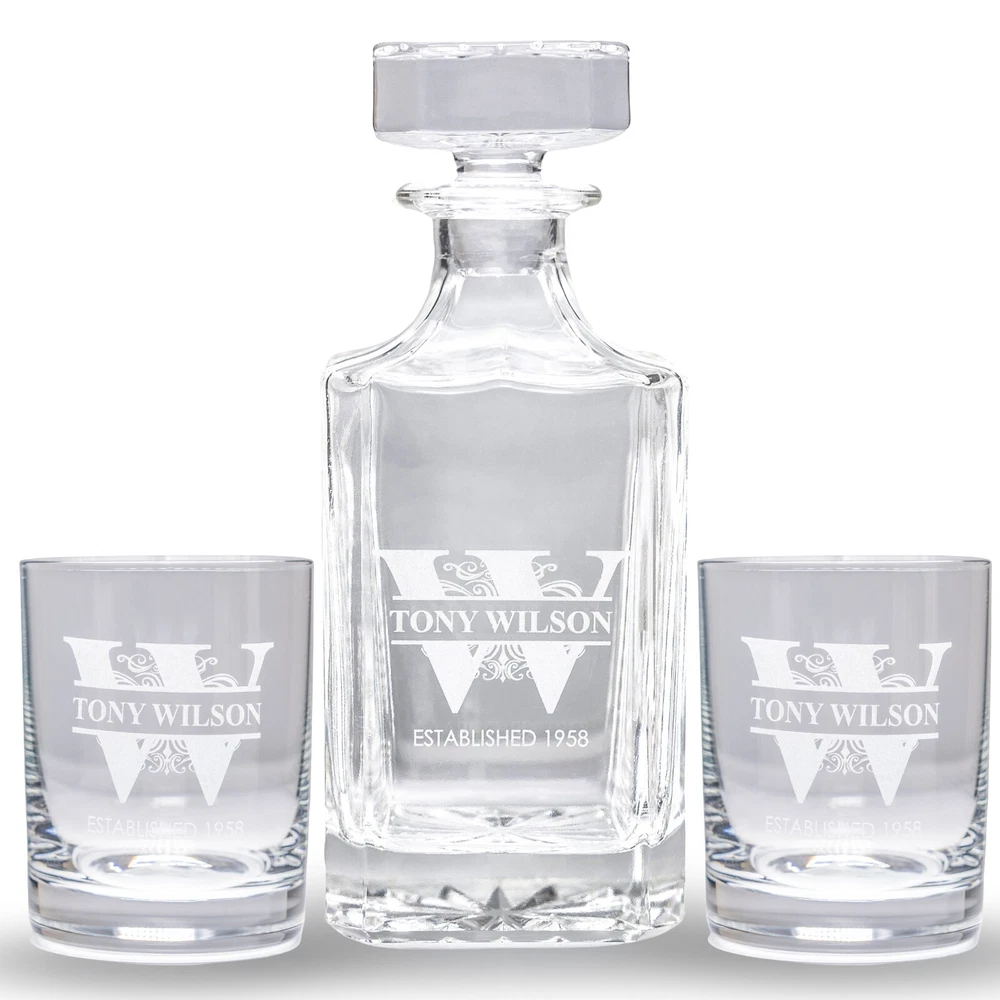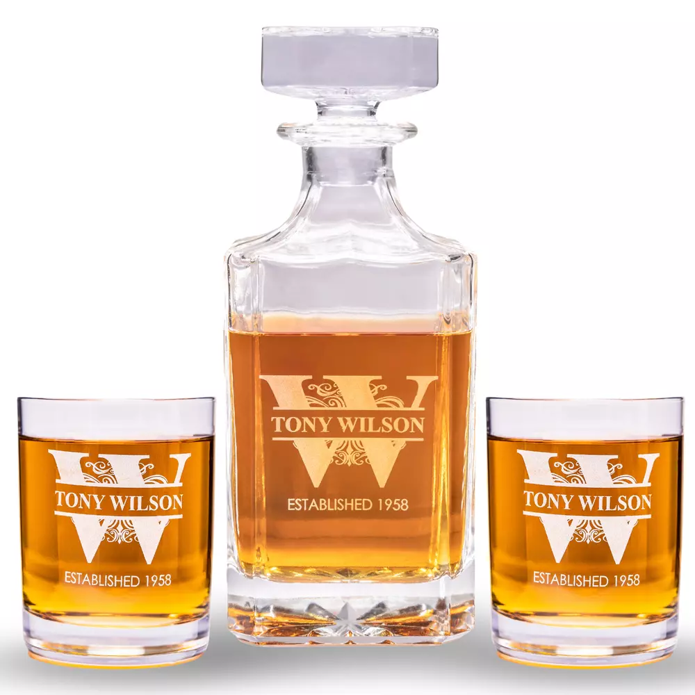 Our Gifts Inscribed premium whiskey decanter sets with whiskey glasses gift includes a vintage whiskey decanter with stopper and whisky glass set of 2 or 4 whisky glasses, personalized with the design & name of your choice. The whiskey drinking glasses set is designed to help enhance the aroma and drinking experience of any liquor. Choose from 9 designs for your whisky decanter and drinking glasses set. Add personalization and we’ll custom engrave your designs on the liquor decanter & double old fashioned glasses gifts for men. Engrave your whiskey decanter vintage and glass cup set for a unique whiskey gift set perfect for events like weddings, birthdays, anniversary, groomsmen, retirement, or as a housewarming present. The bourbon decanter bottle and scotch glasses make a great addition to any kitchen or barware set. ENGRAVED WHISKEY GLASSES GIFT - Create lasting memories and enjoy the ultimate drinking experience with the personalized decanter glass and glass cup set. WHISKEY GLASS SET - Our glasses drinking set is made of high-quality crystal glass that is durable and keeps the liquor insulated at the perfect temperature for longer. The rum glass glassware set holds 11.2 oz capacity of your favorite liquors. GLASS WHISKEY BOTTLE DETAILS - The liquor bottle glass design enhances the aroma of any spirit including rum, bourbon, scotch, tequila, wine, and more. The whiskey tumbler glass decanter holds 750 ml of liquor, has a glass stopper and features a sleek, non-faceted glass that provides the perfect blank slate for etching and customization to your custom whiskey tasting glasses. CUSTOM WHISKEY GLASS - Select your design and personalize your name, initial, & date to create a one-of-a-kind glass whisky bottle set laser engraved gift. The decanter glass and whiskey tumbler set engraving is permanent, dishwasher safe and lead-free. WHISKEY GIFTS FOR MEN – The set of lowball glasses and decanter whisky are the perfect long-lasting keepsake for events such as weddings, birthdays, anniversary, groomsmen gifts, fathers day, mothers day, or retirement present. Nice addition to any bar glasses set. Enhances the taste and drinking experience of whisky, bourbon, scotch Great for having drinks neat or on the rocks Perfect gift for him, wedding, anniversary, birthday, and more HIGH QUALITY GLASS High quality crystal glass Personalized laser engraving included Whiskey glasses holds 11.2 oz of liquor Whiskey decanter holds 26 oz or 750 ml of any liquor Heavy base, lowball glass shape Dishwasher safe
