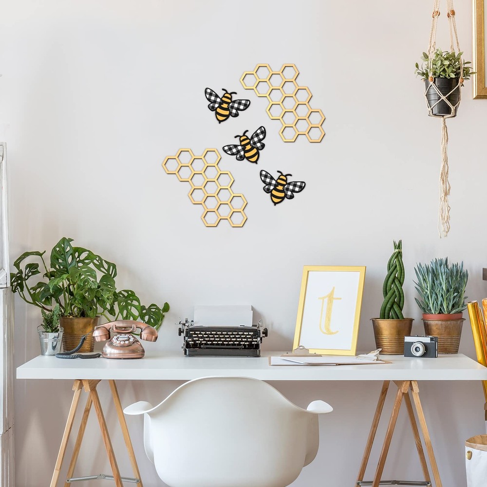Peryiter 5 Pcs Metal Bee Wall Art Farmhouse Honey Bee Honey Comb Decor Wire Metal Wall Decor Hanging for Living Room Garden Bedroom Office Home(Stylish Color) What You Can Get: you can get 5 pieces of hanging art ornaments in this package, including 3 pieces of bee shaped decors and 2 pieces of honeycomb shaped decors, cute and eye catching, to keep your room from being dull and monotonous Reliable and Reusable: this honey bee decor is made of metal material, reliable and unbreakable, long lasting and sturdy, not easy to break or fade, smooth to touch, lightweight and thick, providing you with a pleasant use experience, so you can use it with confidence Decorative and Eye Catching: our bee wall decor is mainly printed with a black and gold color, and the bees adopt plaid and stripe elements, so you can hang it in many places, such as windows, mantels, fireplace, doors, counters and more, full of a sense of elegance and color in your home and room Proper Size to Decorate: our bee shaped decors are about 3.94 x 2.95 inches/ 10 x 7.5 cm and these honeycomb shaped decors are about 7.87 x 7.87 inches/ 20 x 20 cm, suitable and portable, you can use this metal outdoor wall art to decorate your space conveniently Variety of Occasions: this bee decor features an attractive color and adorable appearance, suitable to display in different places, like hallway, kitchen, patio, porch, bathroom, bedroom, living room and so on, can well blend with your various ornaments Features: Ideal and delicate gifts: This honeycomb art can be served as delicate gifts for your family, relatives, friends and colleagues as housewarming gifts, birthday gifts and Christmas gifts, warm and ideal. Brighten up your space: With a noticeable and creative shape, our bee themed kitchen decor can match well with a variety of styles and ornaments, making your party more interesting and comfortable. Specifications: Material: metal Color: black and gold mainly Size: Bee shaped decors: about 3.94 x 2.95 inches/ 10 x 7.5 cm Honeycomb shaped decors: about 7.87 x 7.87 inches/ 20 x 20 cm Package includes: 5 x Bee kitchen accessories Notes: Manual measurement, please allow slight errors on size. The color may exist a slight difference due to different screen displays. Shipping We offer FREE shipping on all orders! We ship within Three business days of payment, usually sooner. We use a selection of shipping services such as UPS, FedEx, USPS etc. We only ship to the lower 48 states, no APO/FPO addresses or PO Boxes allowed. Local pickups and combined shipping options are not provided at this time. Return You can return a product for up to 30 days from the date you purchased it. Any product you return must be in the same condition you received it and in the original packaging. Please keep the receipt. Payment We accept payment by any of the following methods: PayPal Please pay as soon as possible after winning an auction, as that will allow us to post your item to you sooner! Feedback Customer satisfaction is very important to us. If you have any problem with your order, please contact us and we will do our best to make you satisfied. Contact Us If you have any queries, please contact us via ebay. We usually respond within 24 hours on weekdays. Please visit our eBay store to check out other items for sale! Thank you for shopping at our store.
