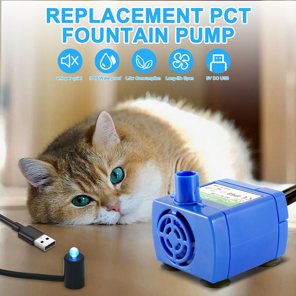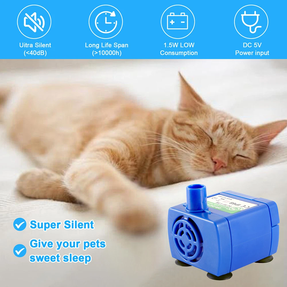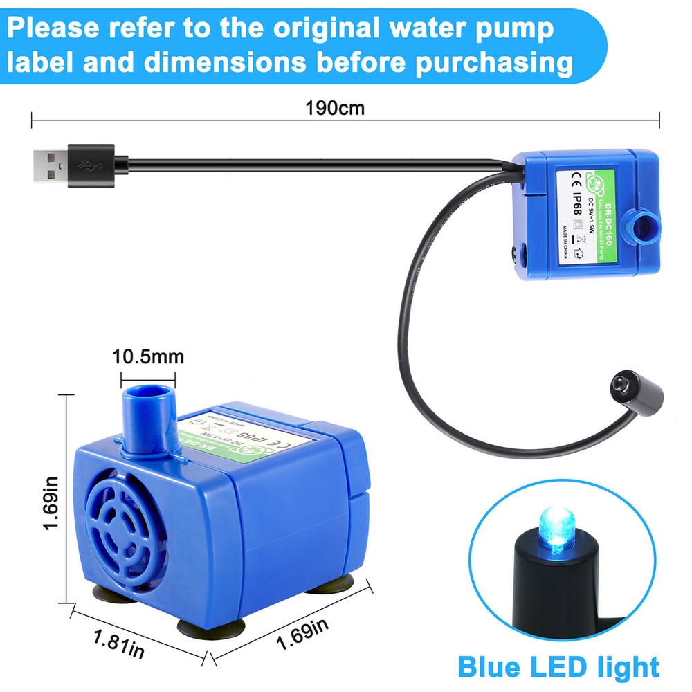Pet Water Dispenser Pump USB Plug con LED Light Cat Dog Drinking Fountain Motor About this item: 【WARNING】 NOT SUITABLE FOR THESE BRANDS: KASTTY, CATIT, WOPET CAT FOUNTAIN. THE PUMP ONLY MATCHES THE 5V-1.5W ADAPTER 【PURCHASE NOTE】 Please refer to the original water pump label and dimensions before purchasing. Our cat water fountain pump label is: DR-DC160 with LED LIGHT. THE PACKAGE DOES NOT INCLUDE THE ADAPTER. 【INSTRUCTIONS FOR USE】 This product is only suitable for pet water dispensers and is not suitable for other purposes 【ULTRA QUIET & LOW CONSUMPTION UPGRADED PUMP】 1.5W low power consumption & super silent cat fountain replacement pump , give you and your pets sweet sleep 【 LONG LIFE SPAN】 DC 5V low voltage, IP68 Waterproof,USB Plug for various applications--can be used for portable charger, computer and so on. Please use 5V/1A USB power adapters. (USB adapter is not included in the package). Overvoltage can damage the pump 【STRONG SUCTION CUPS FOR EASY INSTALLATION】 The cat water fountain pump have 190cm long power cable and 4 strong suction cups, easy to install 【EASY TO DISASSEMBLE AND CLEAN】 Clean the cat water fountain pump every 2 weeks to extend the pump life Product Feature Powerful Suction Cups: The Pet Water Dispenser Water Pump comes with 4 powerful suction cups, which can be stably adsorbed on a flat surface, preventing movement or tilting during the working process. Strong Silence: The Pet Water Dispenser Water Pump uses advanced technology and is designed for silent operation, which minimizes the impact of noise on pets and their owners. Outdoor Waterproof: The Pet Water Dispenser Water Pump is IP68 waterproof, so you don't have to worry about the performance being affected even if it is invaded by water. Fresh and Clean Water: The Pet Water Dispenser Water Pump provides a constant stream of water that helps keep the water fresh and oxygenated, which can encourage your pet to drink more, promoting hydration and overall health. Filtration System: The Pet Water Dispenser Water Pump is equipped with a filtration system that helps to remove impurities from the water such as hair, debris and odors. Product Specification Load Current: 280mA Maximum Lift: 50cm Continuous Working Life: >10000 hours Waterproof Grade: IP68 Working Voltage: DC5V Load Power: 1.5W Maximum Flow Rate: 160L/H Outlet Diameter: 10.5mm Color: blue Material: plastic Size: 4.6x4.3x4.3cm/1.81x1.69x1.69in Package Includes 1x Pet Water Dispenser Water Pump Payment Delivery details Terms of sales About us Contact us Payment Payments: Paypal, Google Pay, Visa, Master Card, Amerian Express, Discover. Delivery details All items are shipped from US warehouse. 😉😉 😉 We have 2 wharehouse in US, one is in NJ and the other is in CA. 😉😉 😉 We will ship from the warehouse closest to the buyer's delivery address. Don't hesitate make orders ! We ship to your eBay or Paypal address. Please make sure your eBay or Paypal address is correct before you pay. Terms of sales Free return About us Pls contact our customer service firstly if have any problems , we will help to solve the issue, and could offer free return service for full refund or free replacement after confirming. You can buy from us with confidence Contact us If have any problems, please feel free to contact us.