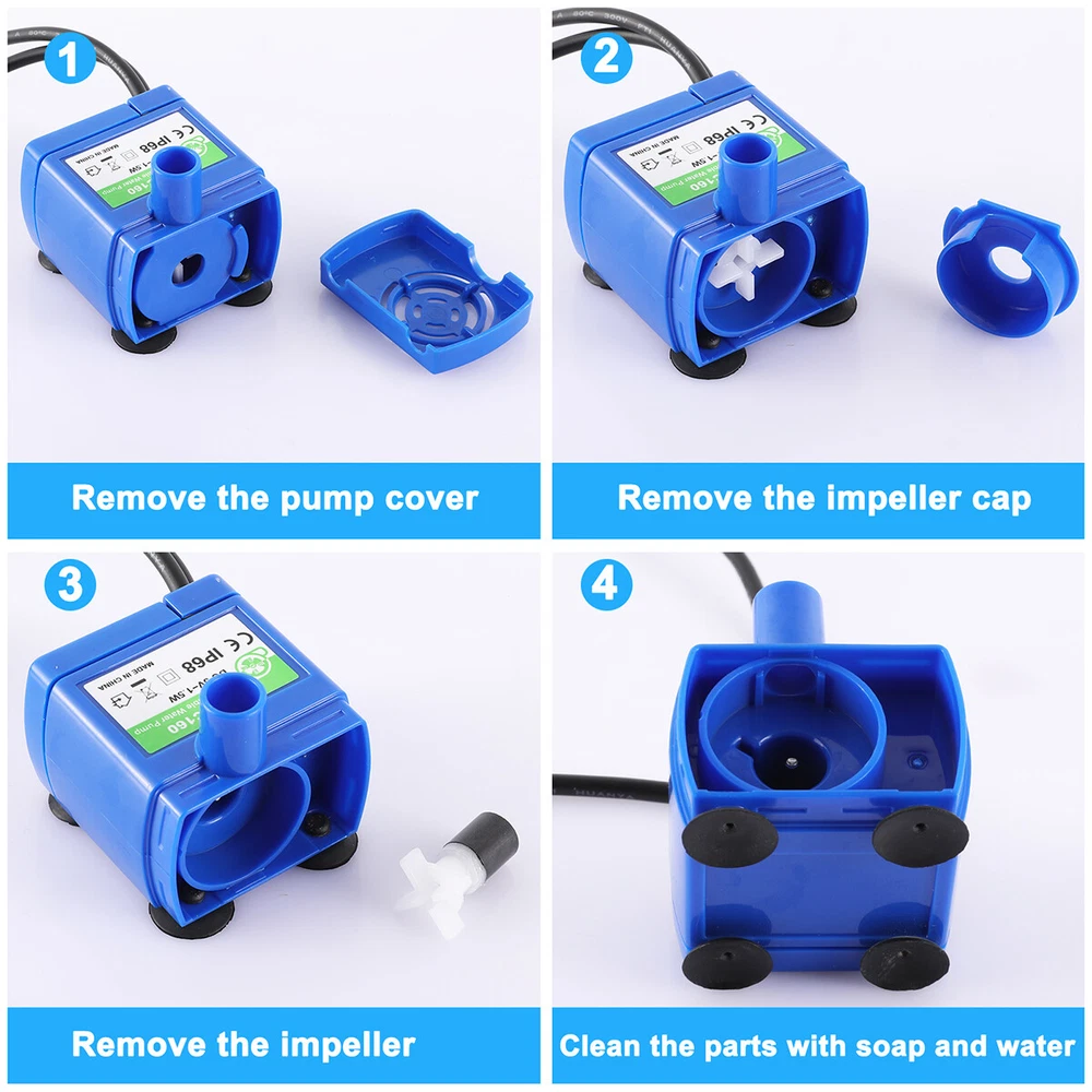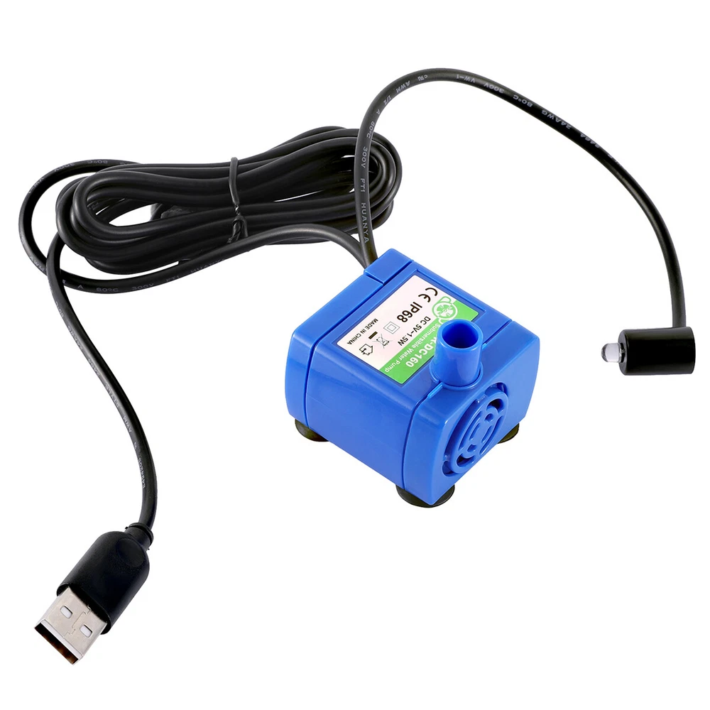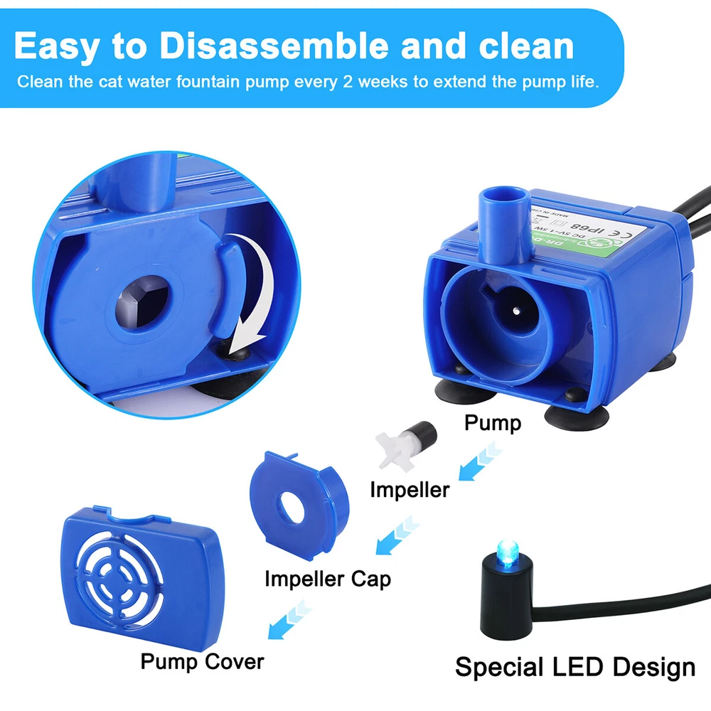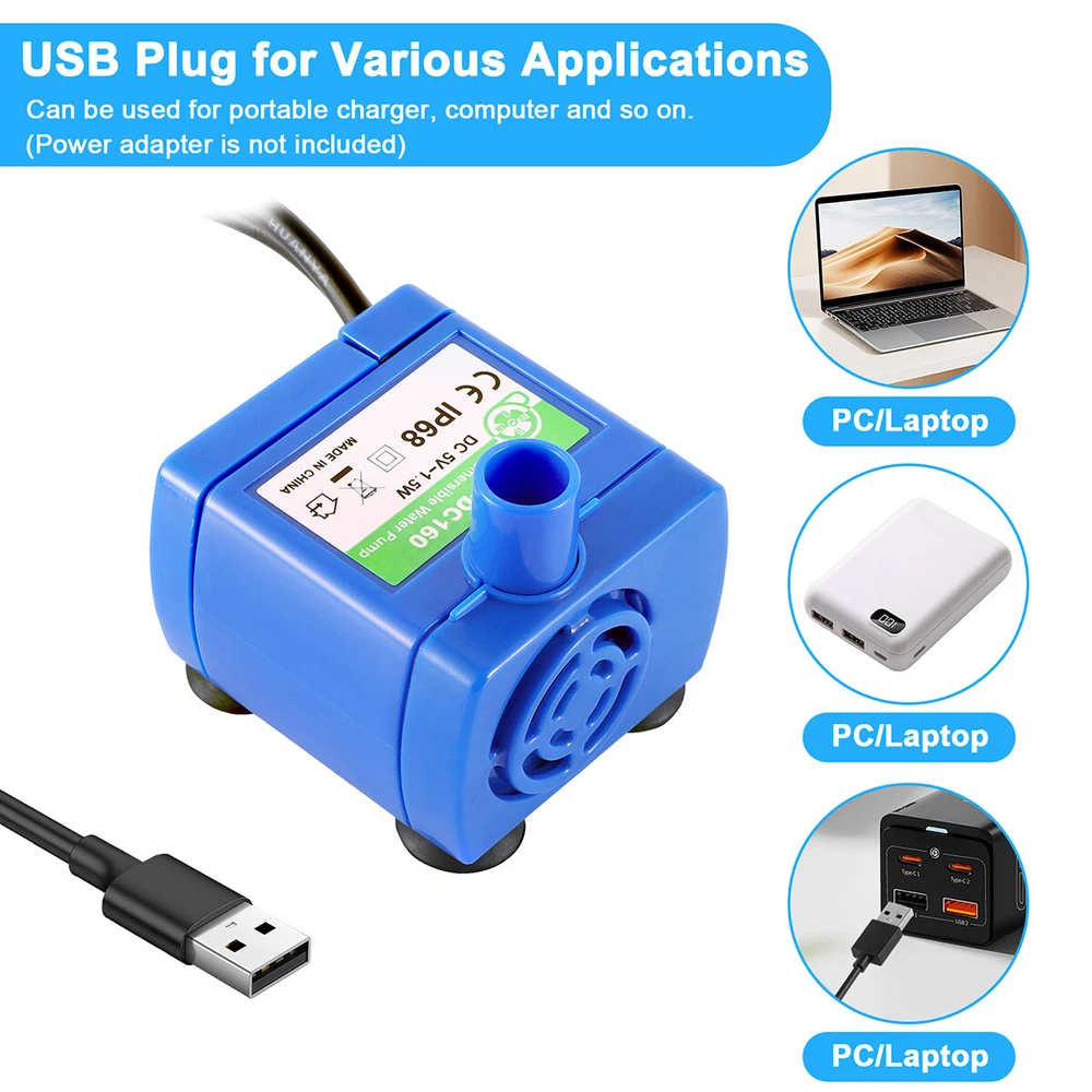 Pet Water Dispenser Pump USB Plug con LED Light Cat Dog Drinking Fountain Motor About this item: 【WARNING】 NOT SUITABLE FOR THESE BRANDS: KASTTY, CATIT, WOPET CAT FOUNTAIN. THE PUMP ONLY MATCHES THE 5V-1.5W ADAPTER 【PURCHASE NOTE】 Please refer to the original water pump label and dimensions before purchasing. Our cat water fountain pump label is: DR-DC160 with LED LIGHT. THE PACKAGE DOES NOT INCLUDE THE ADAPTER. 【INSTRUCTIONS FOR USE】 This product is only suitable for pet water dispensers and is not suitable for other purposes 【ULTRA QUIET & LOW CONSUMPTION UPGRADED PUMP】 1.5W low power consumption & super silent cat fountain replacement pump , give you and your pets sweet sleep 【 LONG LIFE SPAN】 DC 5V low voltage, IP68 Waterproof,USB Plug for various applications--can be used for portable charger, computer and so on. Please use 5V/1A USB power adapters. (USB adapter is not included in the package). Overvoltage can damage the pump 【STRONG SUCTION CUPS FOR EASY INSTALLATION】 The cat water fountain pump have 190cm long power cable and 4 strong suction cups, easy to install 【EASY TO DISASSEMBLE AND CLEAN】 Clean the cat water fountain pump every 2 weeks to extend the pump life Product Feature Powerful Suction Cups: The Pet Water Dispenser Water Pump comes with 4 powerful suction cups, which can be stably adsorbed on a flat surface, preventing movement or tilting during the working process. Strong Silence: The Pet Water Dispenser Water Pump uses advanced technology and is designed for silent operation, which minimizes the impact of noise on pets and their owners. Outdoor Waterproof: The Pet Water Dispenser Water Pump is IP68 waterproof, so you don't have to worry about the performance being affected even if it is invaded by water. Fresh and Clean Water: The Pet Water Dispenser Water Pump provides a constant stream of water that helps keep the water fresh and oxygenated, which can encourage your pet to drink more, promoting hydration and overall health. Filtration System: The Pet Water Dispenser Water Pump is equipped with a filtration system that helps to remove impurities from the water such as hair, debris and odors. Product Specification Load Current: 280mA Maximum Lift: 50cm Continuous Working Life: >10000 hours Waterproof Grade: IP68 Working Voltage: DC5V Load Power: 1.5W Maximum Flow Rate: 160L/H Outlet Diameter: 10.5mm Color: blue Material: plastic Size: 4.6x4.3x4.3cm/1.81x1.69x1.69in Package Includes 1x Pet Water Dispenser Water Pump Payment Delivery details Terms of sales About us Contact us Payment Payments: Paypal, Google Pay, Visa, Master Card, Amerian Express, Discover. Delivery details All items are shipped from US warehouse. 😉😉 😉 We have 2 wharehouse in US, one is in NJ and the other is in CA. 😉😉 😉 We will ship from the warehouse closest to the buyer's delivery address. Don't hesitate make orders ! We ship to your eBay or Paypal address. Please make sure your eBay or Paypal address is correct before you pay. Terms of sales Free return About us Pls contact our customer service firstly if have any problems , we will help to solve the issue, and could offer free return service for full refund or free replacement after confirming. You can buy from us with confidence Contact us If have any problems, please feel free to contact us.