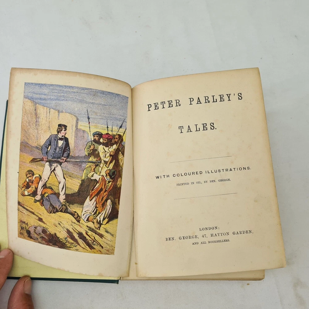 Undated Peter Parley Tales printed in London by Ben George. Includes several pages advertisments. Hardback in dark green, embossed with black ink and guilding. There is some separation to the first section as photographed, Otherwise Very Good Listing and template services provided by inkFrog