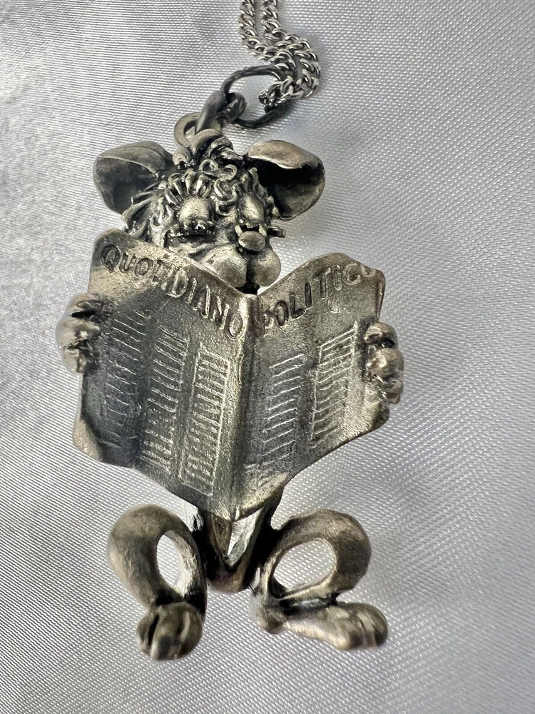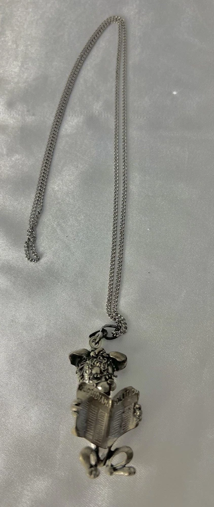 This vintage necklace features an adorable pewter poodle reading a newspaper. The pendant hangs from a delicate chain and is a perfect accessory for any dog lover. The piece has a distinctive style and can be worn on any occasion. The brand of the necklace is unbranded and it falls under the category of jewelry and watches. The necklace is pre-owned but remains in excellent condition. It is a unique and eye-catching piece that will undoubtedly attract attention. The pendant is perfect for those who appreciate vintage and antique jewelry, and it will make an excellent addition to any collection. A42