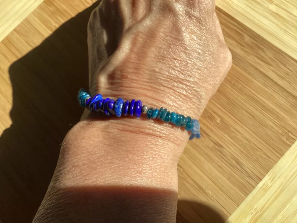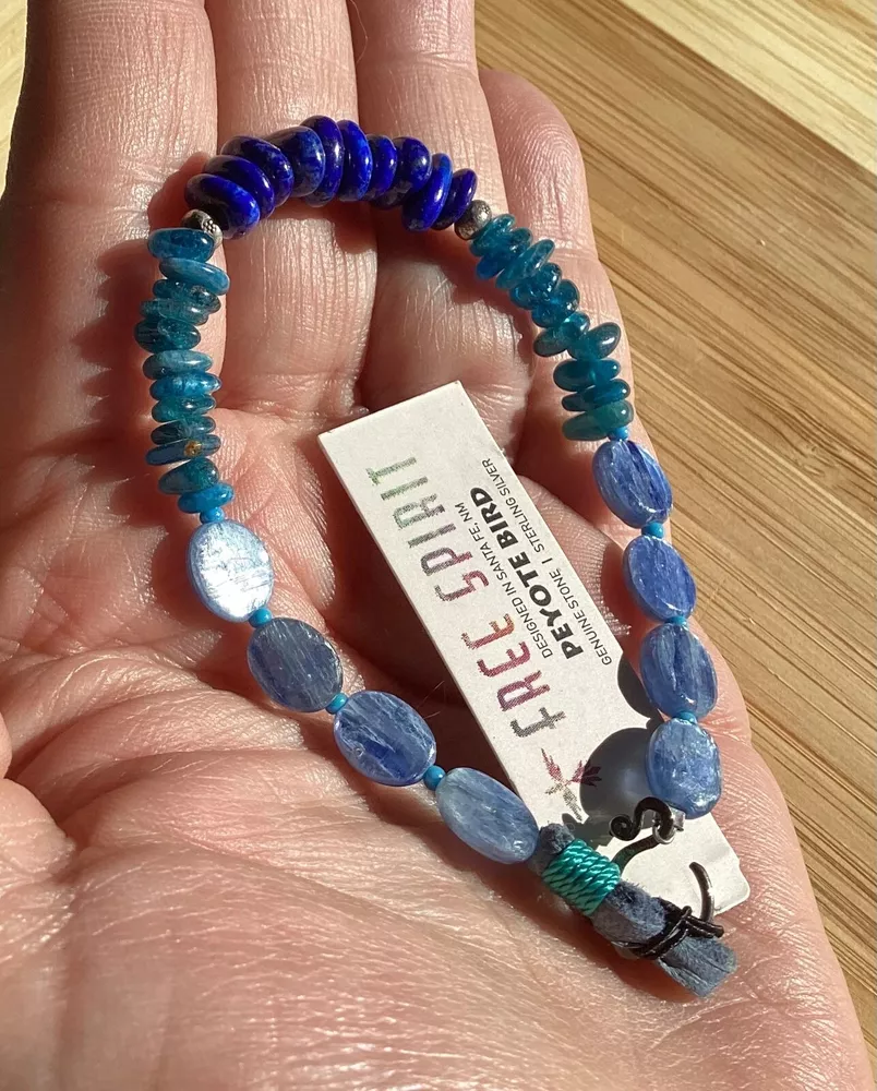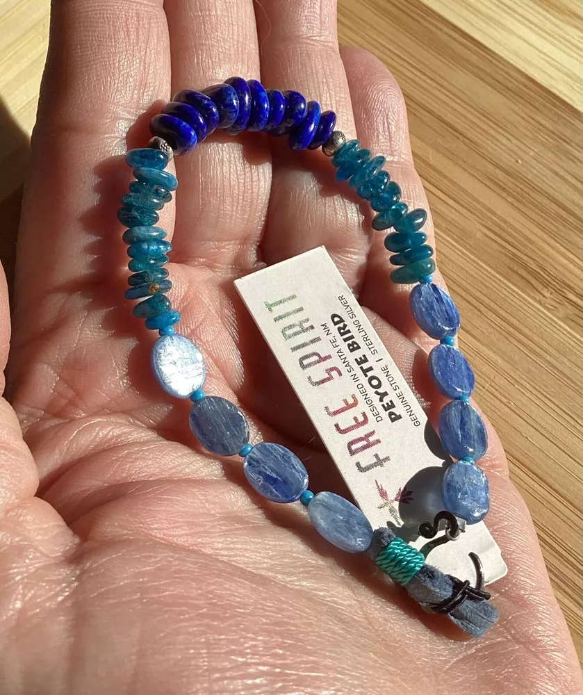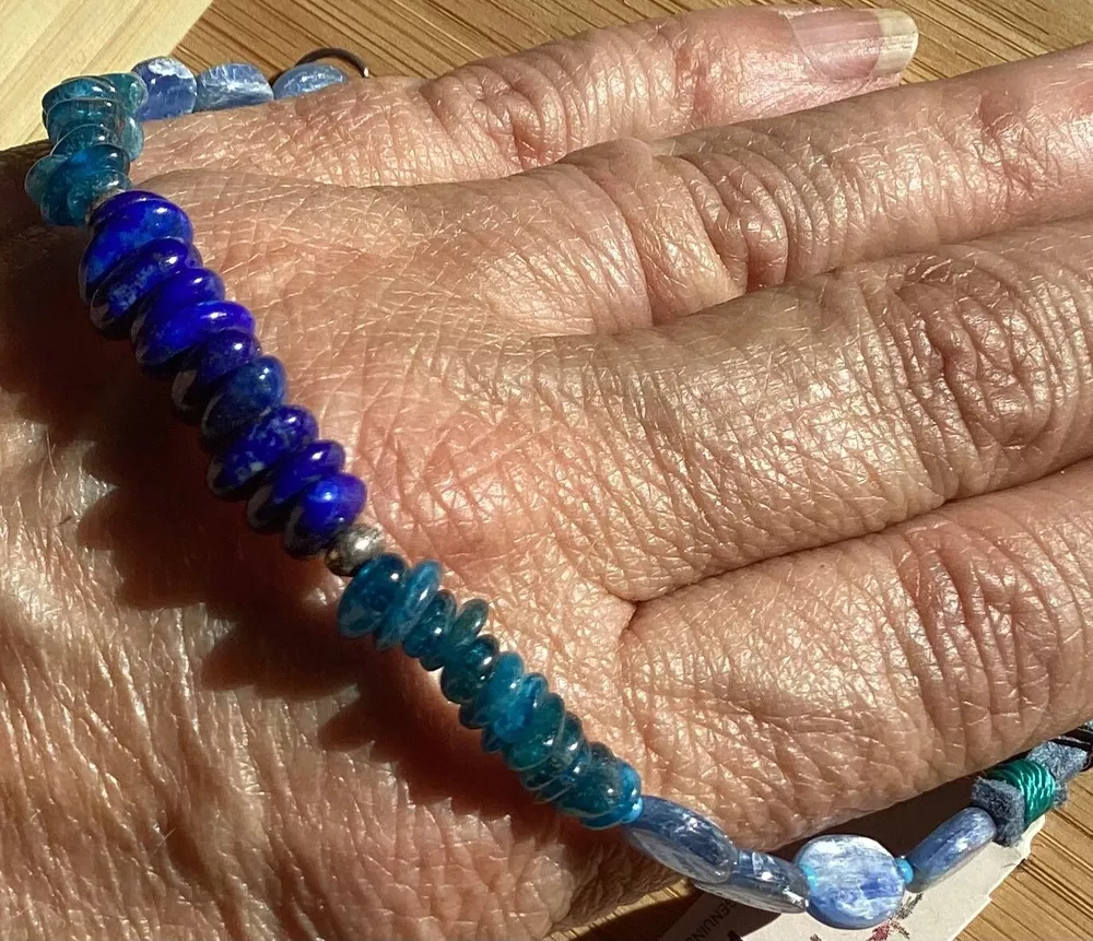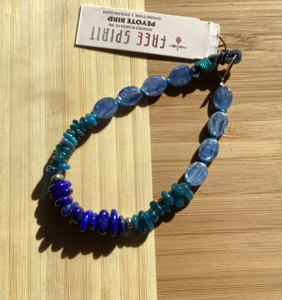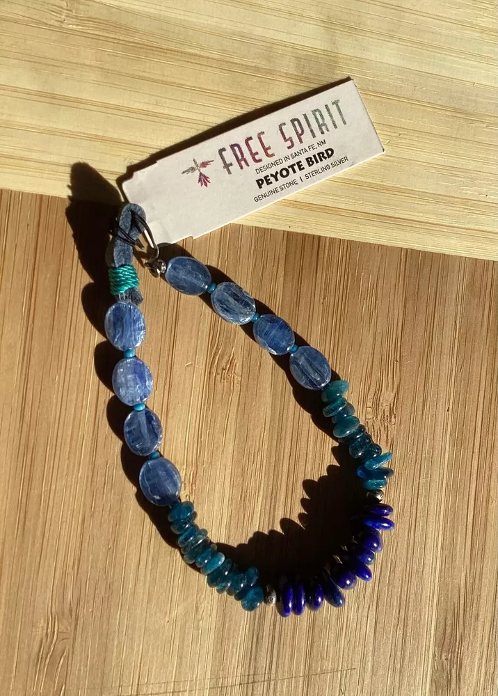 Beautiful shades of blue gemstone bracelet by Peyote Bird Designs. Handmade in Santa Fe New Mexico. Stones are dark blue lapis, blue green apatite and shiny blue kyanite. Measures 7 inches long, excluding hook. Closure is Sterling Silver hook that goes into leather loop. Nicely done! Ships USPS Ground Advantage.