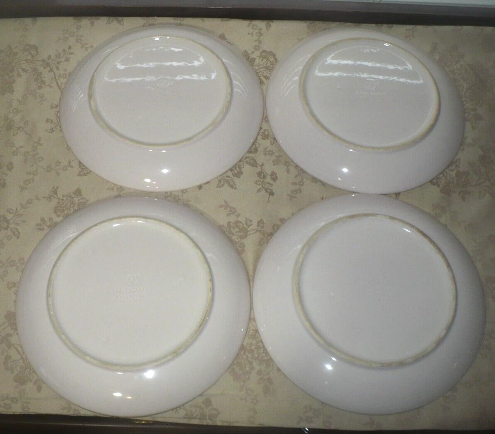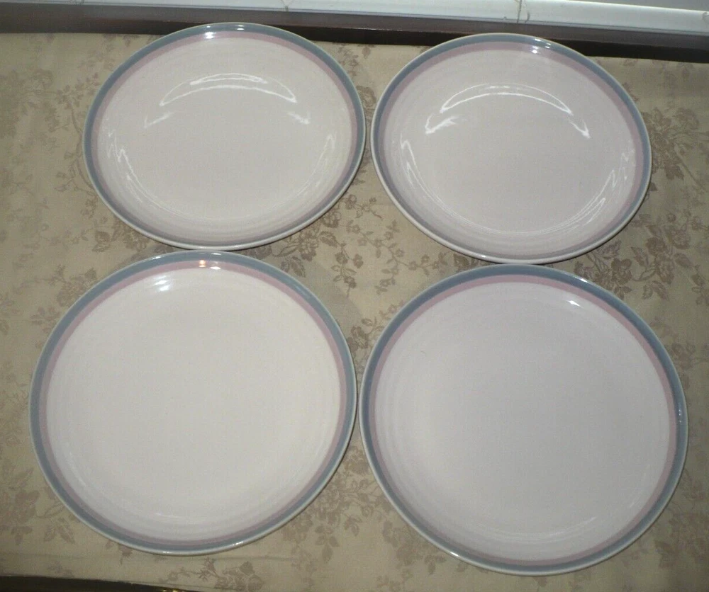This is a 4 Piece Set of Dinner Plates by Pfaltzgraff, made in the USA, in the pattern called Aura. It features a beige background with blue and pink bands. They measure 9-7/8", and all are in good condition with no chips or cracks but do have some minor utensil marks with normal use.