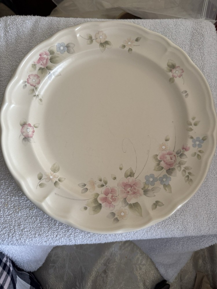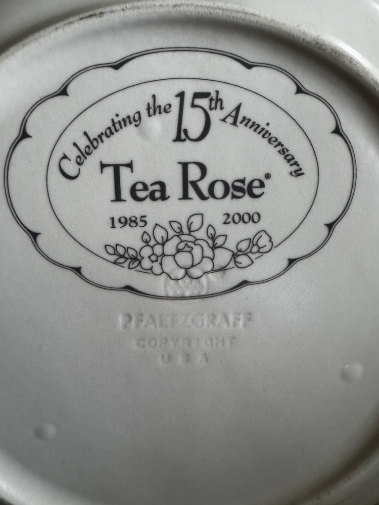 This product is a set of four round scalloped style dinner plates made of stoneware with a pink tea rose pattern. The plates are part of the Pfaltzgraff brand's 15th Anniversary Tea Rose product line and were manufactured in the USA in the year 2000. They are vintage and original, with a printed backstamp . No chips or cracks! Little signs of wear but still in beautiful condition!