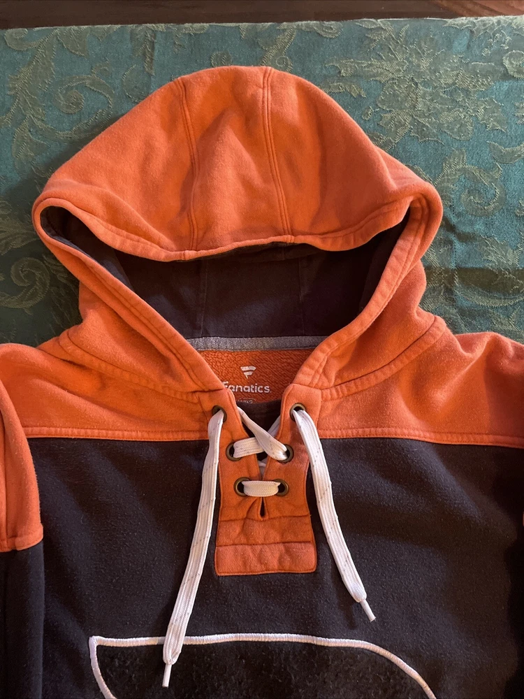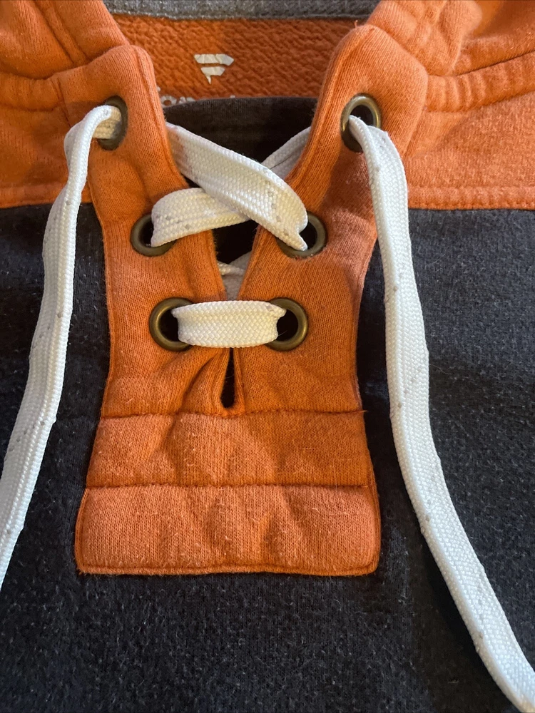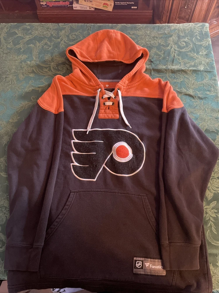 Show your love for the Philadelphia Flyers with this Fanatics hooded sweat shirt. This lace-neck sweatshirt is perfect for any NHL fan and features the team's logo prominently on the front. Made from high-quality materials, this shirt is comfortable and built to last. It's available in size L and is a great addition to any fan's collection. Whether you're cheering on the Flyers at the rink or just showing off your team spirit, this shirt is perfect for any occasion.