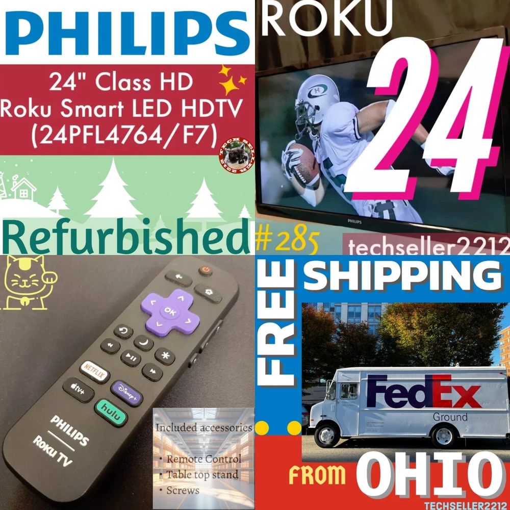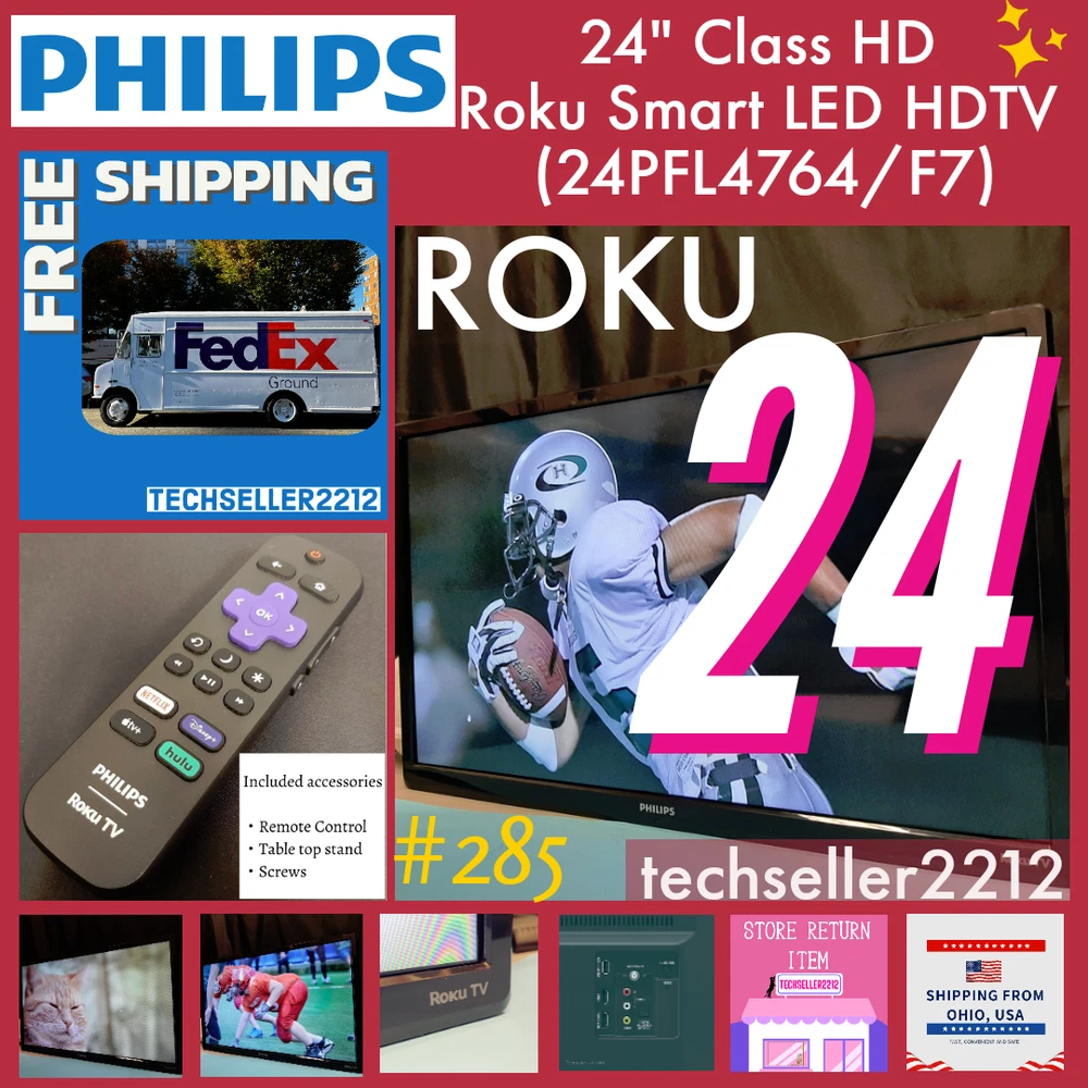PHILIPS 24" Class HD Roku Smart LED HDTV - 24PFL4764/F7 Product details Philips 24" Class HD Roku Smart LED HDTV (24PFL4764/F7) is a smart TV that’s simple to use, with tons of free content. Stream your favorite entertainment, get access to your cable box or HD antenna, or even fire up your gaming console – all from your home screen. With an easy-to-use remote and automatic software updates, Smart TV has never been easier. Roku Smart HDTV: Enjoy 150,000+ movies and TV episodes High Definition: 720p for ultra-sharp images Built-in Wireless: Easily connect to your wireless network via Wireless LAN 802.11ac Free Roku Mobile App: Makes it easy and fun to control your Roku TV 120 Perfect Motion Rate: 120 PMR delivers unprecedented motion sharpness to your TV Fast and Easy search: Search by title, actor, director to see where to stream your favorite shows for free or at the lowest price Works with Apple AirPlay: Effortlessly stream videos, photos, music, and more from your Apple device to your TV with AirPlay Works with Voice Assistant: Enjoy easy voice control with Hey Google, Alexa, and Siri R2 Grade : C6F3 Hereby certified renewed product is inspected in the US for OEM specifications and factory initialization for a clean device. Shop with confidence! “As an certified service center, we strictly enforce data sanitization, and we have confirmed that the renewed products sold here do not contain data.”
