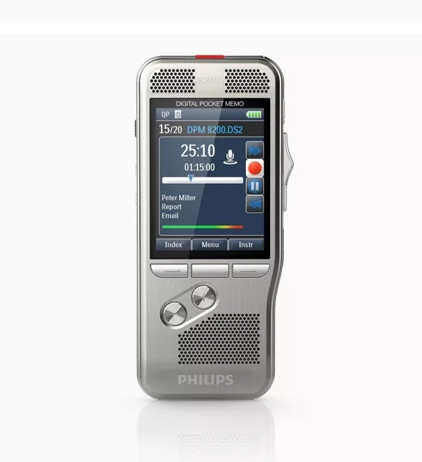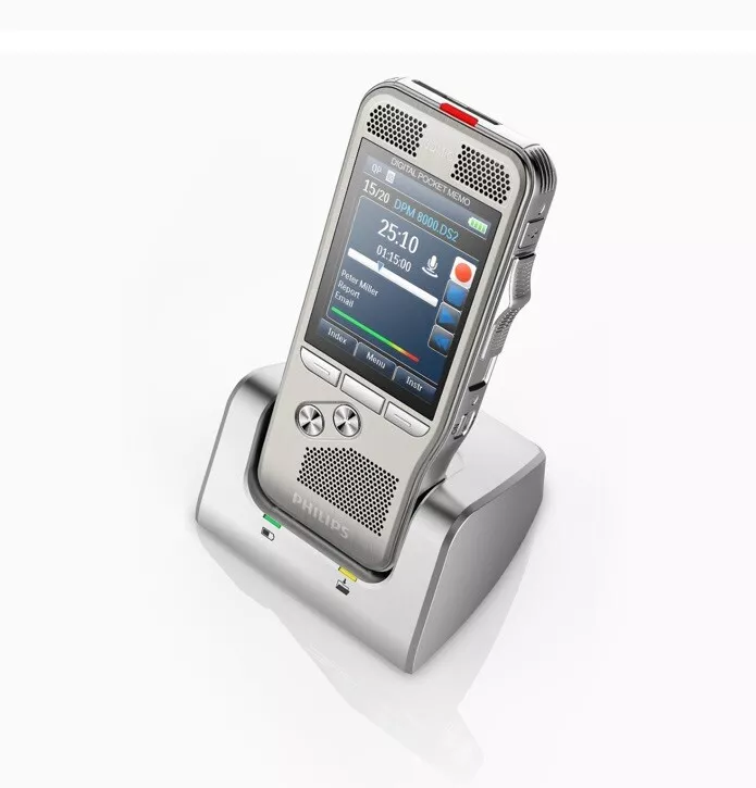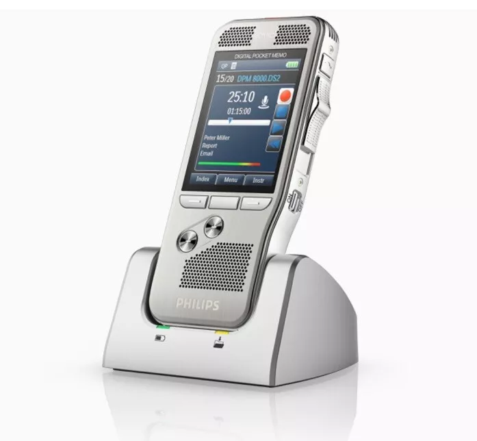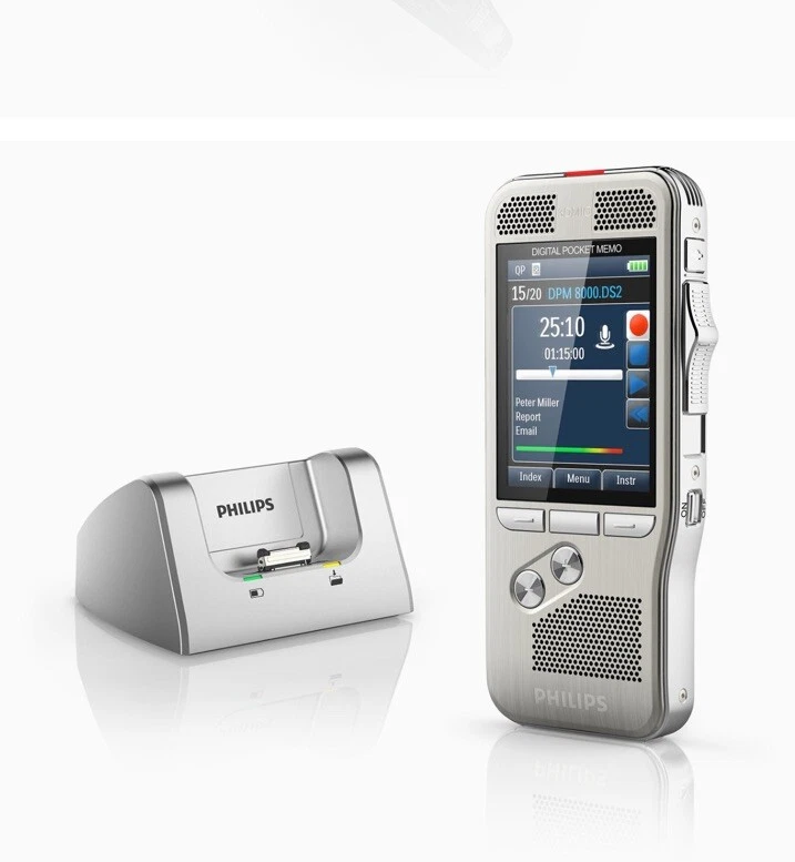 The recorder in the pictures with red background is the exact item the buyer will receive. The pictures with white background are stock photos to show what the item looks like outside the box. Product Description: Philips DPM-8000 Professional Digital Pocket Memo DPM8000/00 for use by Doctors, Lawyers. Insurance companies, Teachers, Professors et al - NEW Compatible Devices: Philips Transcription Kit 7277, GearPlayer Transcription Software Brand: PHILIPS Hardware Interface: USB Microphone Form Factor: Built-In Headphones Jack: 3.5 millimeters Number of Batteries: 1 Lithium Polymer battery required (Included) Features & Details: Superior audio quality and design: ✓ 3D Mic system for best audio quality and accurate speech-recognition results ✓ Built-in motion sensor for automatic microphone selection ✓ Ergonomic slide switch for efficient single-handed operation ✓ Robust stainless steel casing for extra durability Enhance your productivity: ✓ SpeechExec workflow software for efficient data management ✓ Large color display and clear user interface for easy, intuitive operation ✓ Docking station for fast battery charging and hands-free recording ✓ Light and motion sensors for extended battery life Designed for professionals: ✓ File encryption and device PIN lock for high data security ✓ Remote management support for time-saving deployment and maintenance ✓ Classic mode for clear and easy-to-use operation ✓ Strong and Durable Stainless Steel Design ✓ Wear Free 4 Position Slide Switch ✓ Comes complete with SpeechExec Pro ✓ Integration with Dragon Professional, Legal and Medical What is in the box: • Digital dictation recorder DPM8000 • Docking station • Dictation software SpeechExec Professional • Li-Ion battery (Battery Included) • 4 GB SD-Card (SD Card Included) • Micro USB-cable • Pouch • User manual