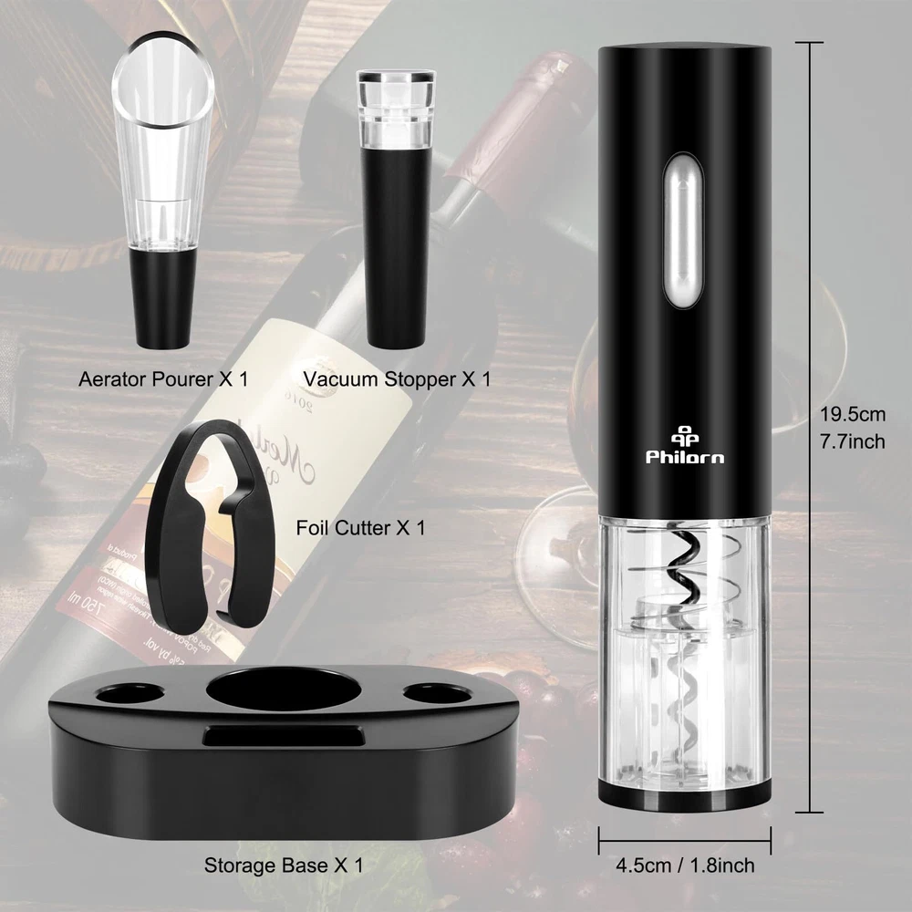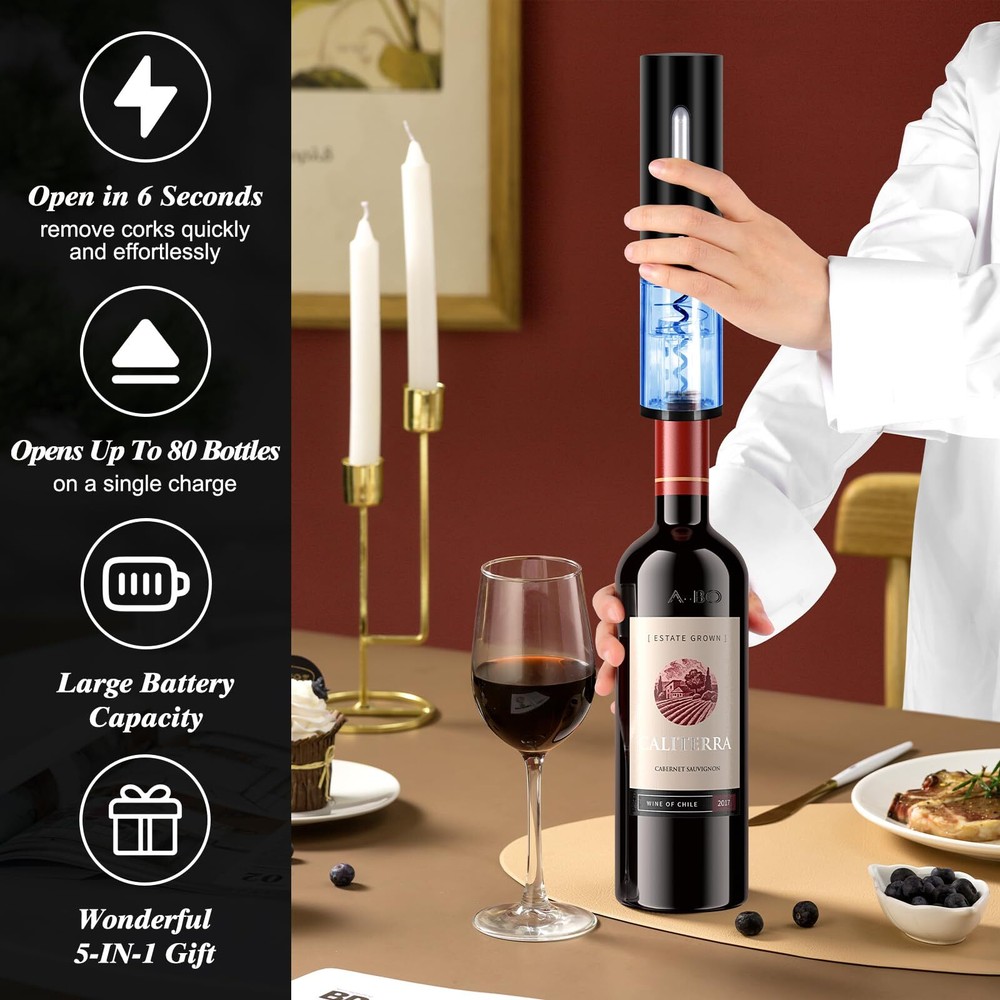 【5-in-1 Wine Lover's Set】 A perfect set for all your wine needs. electric wine opener set includes 1 x Electric Wine Opener, 1 x Foil Cutter, 1 x Wine Pourer, 1 x Vacuum Stopper and 1 x Storage Base. With all these essentials, you can enjoy your favorite wine wine anytime asap if you like. 【Easy Operation】Automatic Electric Wine Bottle Opener can open a bottle of wine in 5-7 seconds. It only requires pressing the down (extract button) and up (release button) buttons to operate, which is easy to use. 【Rechargeable Design】This Cork Screw Wine Bottle opener features a cord-free design, allowing you to open up to 80 bottles on a single 2-hour charge. The charging stand is built-in and no batteries are needed. With this wine opener, you can enjoy the convenience of opening wine bottles without any hassle. 【Vacuum Wine Stopper】 The Vacuum stopper is made from food-safe materials, and its bevel is designed for safe pouring. The preserver vacuum pump avoids wasting wine and can keep most opened wine and champagne fresh for up to 7 days. 【Perfect Gift for Wine Lovers】 The electric wine opener with charging base is a must for every wine lover, Whether it's a holiday, birthday, or special occasion, this set will undoubtedly leave a lasting impression. Suit for New Year, Valentine's Day, Anniversaries, Christmas, Thanksgiving, Mother's Day, Father's Day, Graduations and more.