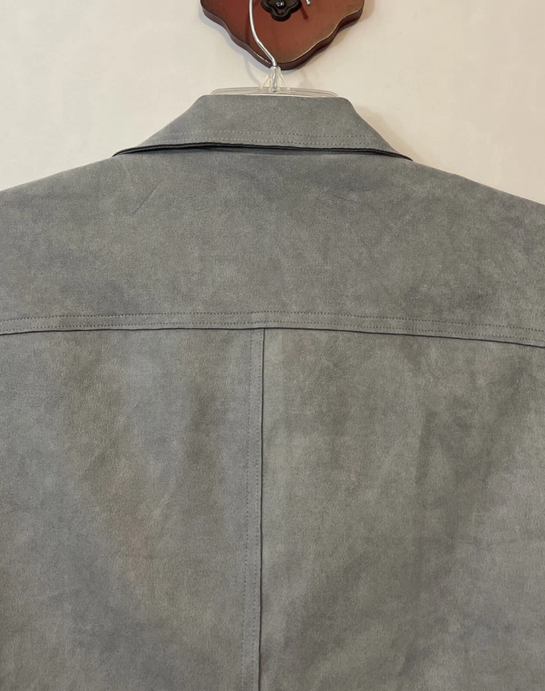 Elevate your wardrobe with this stunning Philosophy jacket! Crafted from luxurious velour style fabric, this gray jacket features an open-front design with a collared neckline and pleated accents. The long sleeves and zipped pockets make it perfect for both casual and business occasions, while the stretch and breathable features ensure comfort all year long. This designer jacket is available in size XL and is a must-have addition to any fashion-forward woman's collection. With its solid pattern and buckle and zipper accents, this jacket exudes sophistication and style. Add a touch of elegance to your outfit and make a statement with this Philosophy jacket! Length: 22 inches. Chest: 23 inches across laying flat. Material: polyester spandex blend.