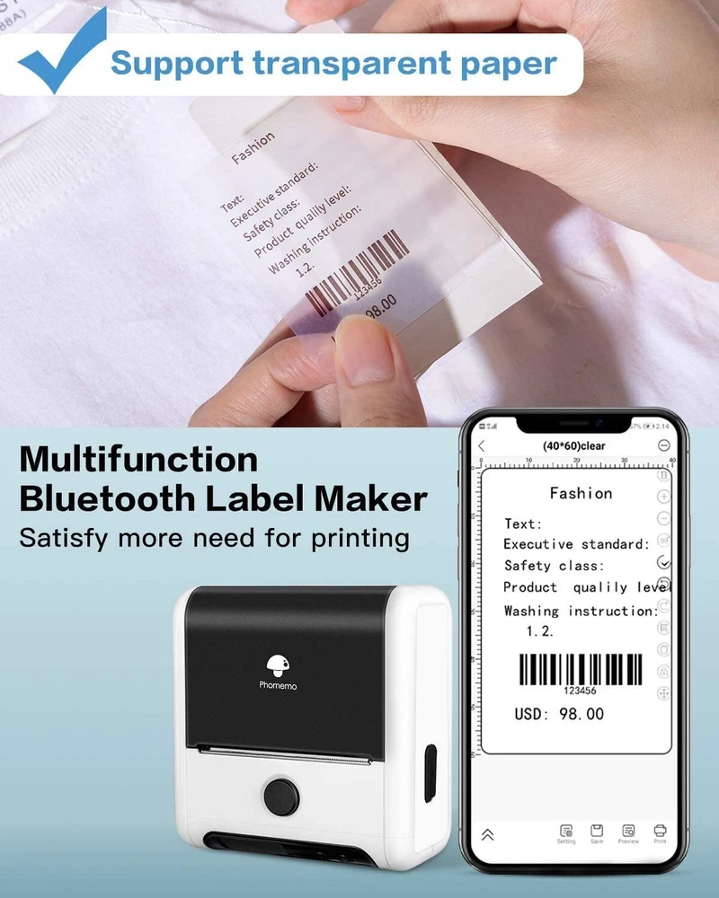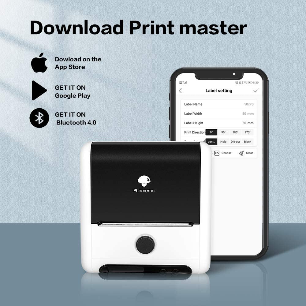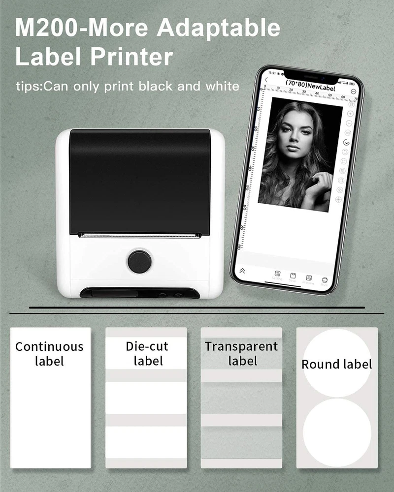 Phomemo M200 Mini Bluetooth Thermal Label Maker Always know your need! -Phomemo M200 Label Maker is a multi-purpose label machine. Bluetooth Label Printer with various App templates, mobile phone editing, you can choose the template according to your needs, and can set up the new size template. -With the great compatibility, M200 label printer is able to print 20-80mm wider label, which offers you more possibilities in printing. -Ideal for making clothes label, jewelry label, mailing address label, product label, money label, retail label, cable label, jar label, name tag, DIY, and more. Connect with " Print Master " APP Thermal Technology Bluetooth Connection App Multi-Functionality Long Continuously Working Time Easy Bluetooth Connection Steps as Follow Download Print master App from App Store & Google Play > Turn on M200 printer and open Phone Bluetooth > Choose printer model in app > Go and enjoy your printing About this item Updated Style: Phomemo M200 label maker are updated version. M200 printer can print both non-continuous and continuous paper. Support to print on transparent paper. 20-80mm Wider Printing: M200 Printer are 5V/2A, Fast Charging- 2600mAh battery in it, full charge have 1 week standby time. Phomemo Label Maker prints 30% more time than similar products on the market. Easy to Use: One-click printing, saving time and effort. Smart app offers variety of fonts and themes. Using app: Install "Print Master" App from Apple Store & Google Play->Turn on M200 printer and open Bluetooth connection.Choosing printer model M200 from app->Enjoy Printing. Multipurpose Using: Perfectly for HOME/OFFICE/RETAILING and more application.It's suitable for This mini label printer has a wide range of uses and involves many industries: Clothing, Food, Telecommunications, Jewelry, School, Home Use and more endless tasks in daily life. It's water, abrasion resistant and BPA free. Removed Easily, No Residue Left: Phomemo M200 label maker paper won't leave residue after easy removal, you don't need to rack your brains to clean the paste surface. Package Includes (Printer) : 1 x M200 Pocket Thermal Printer 1 x Roll of Thermal Printing Paper (inside the printer) 1 x Type-C Cable 1 x User Manual 1 x Packing Box *If you choose paper only , you will receive paper only , no printer. Type of Paper: Type Style Color Size Pcs/Roll Quantity 3 Rolls 20×10mm Thermal Paper Square White 20mm*10mm 600 pcs 3 Rolls 3 Rolls 40×60mm Thermal Paper Square White 40mm*60mm 130 pcs 3 Rolls 3 Rolls 40×80mm Thermal Paper Square White 40mm*80mm 100 pcs 3 Rolls 3 Rolls 50×30mm Thermal Paper Square White 50mm*30mm 230 pcs 3 Rolls 3 Rolls 40×30mm Transparent Thermal Paper Square Transparent 40mm*30mm 230 pcs 3 Rolls