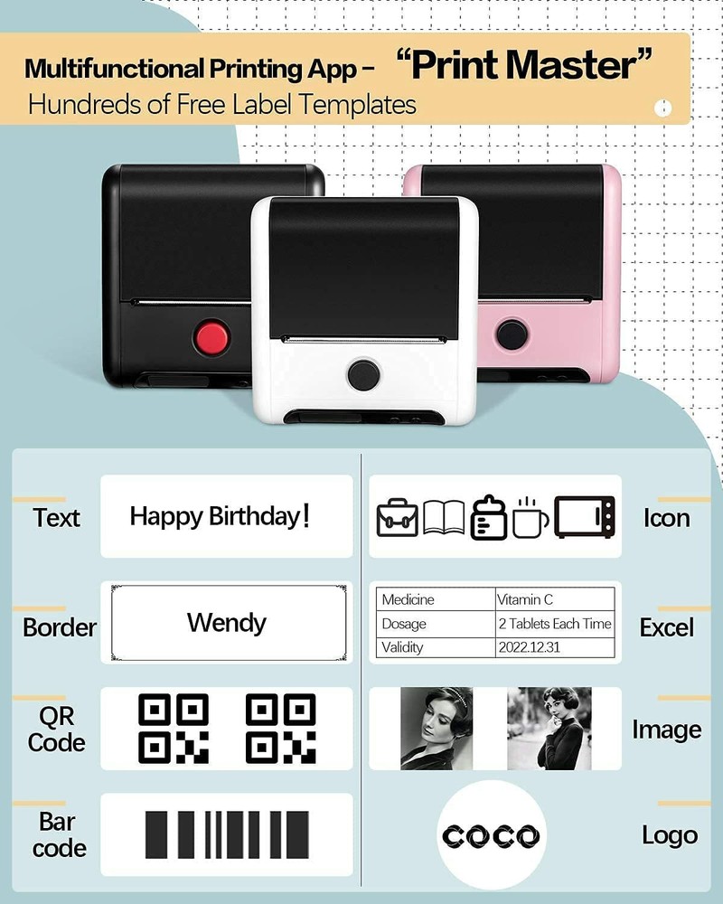 Phomemo M200 Bluetooth Thermal Label Printer Updated M200 label maker adopts a minimalist design, with subtle changes in a cube, and the screen is tilted upward to a slight angle to better support users. With the great compatibility, M200 label printer is able to print 20-80 mm wider label, which offers you more choices in choosing various sticker paper. Easy Bluetooth connection steps as follow: Download Print master App from App Store & Google Play > Turn on M200 printer and open Phone Bluetooth > Choose printer model in app > Go and enjoy your printing. About this item All in One Thermal Label Printer - M200 pink label printer gathers all the function you need. It supports automatic/manual power off, restore factory setting, battery indicator, continue or skip paper feed, adjustable printing density and printing speed. Powerful Phone App - You can operate by downloading " Print Master " APP on iOS or Android mobile phone. Easy connection via Bluetooth. "Print Master" APP offers lots of templates, fonts, icon and other more tools for you to print. Large Capacity Battery - Type C fast charging and 2600mAh large capacity battery meets your daily printing demands. Standby time up to 1 week after full charging. You can feel free to carry it out and print without keeping worry about out of juice. Support Various Types of Labels - Supports to print 20-80 mm wider label. M200 printer can print gap paper, black mark paper, transparent paper, die-cut paper, continuous or non continuous paper. No annoying sticky residue when the labels are removed. Wider Applications -This Bluetooth label maker is perfect to be used at home, studio, office, hotel, school, etc. It is a good helper for you to make warm prompt, memorandum, small business, storage and organization. More Functions: Adjustable Print Density Adjustable Print Speed Restore Factory Setting Auto/Manual Power Off Bluetooth Connection Backlight LCD Screen Battery Indicator Skip Paper Feed Package Includes: 1 x Phomemo M200 Pocket Thermal Printer 1 x Type-C Cable 1 x White Regular Thermal Printing Paper (in the printer) 1 x User Manual 1 x Packing Box *If you choose paper only, you will receive paper only, no printer. Type of Label: Product Name Color Size Adhesive or not Pcs/Roll Quantity (per box) 1 Roll 30*20mm White Square Label White 30mm*20mm Yes 320pcs 1 Roll/3 Rolls 1 Roll 40*30mm White Square Label White 40mm*30mm Yes 230pcs 1 Roll/3 Rolls 1 Roll 40*60mm White Square Label White 40mm*60mm Yes 130pcs 1 Roll/3 Rolls 1 Roll 50*30mm White Square Label White 50mm*50mm Yes 230pcs 1 Roll/3 Rolls 1 Roll 50*80mm White Square Label White 50mm*80mm Yes 100pcs 1 Roll/3 Rolls Item Specifics Supported Paper Size : 80mm × φ50mm Model : Phomemo M200 Printer Maximum Resolution : 203 x 203 DPI Custom Bundle : Yes Product Line : Phomemo M200 Series Input Type : Monochrome Connectivity : Bluetooth Type : Label Printer Output Type : Black & White Features : Pockert Technology : Thermal MPN : M200-TOP Printing Speed : 35mm/s Service Life : 50km Brand : Phomemo Manufacturer Warranty : 1 year Type-2 : Photo Printer Support System : Windows 7/8/10 / iOS 8.0 / Android 4.0 or above
