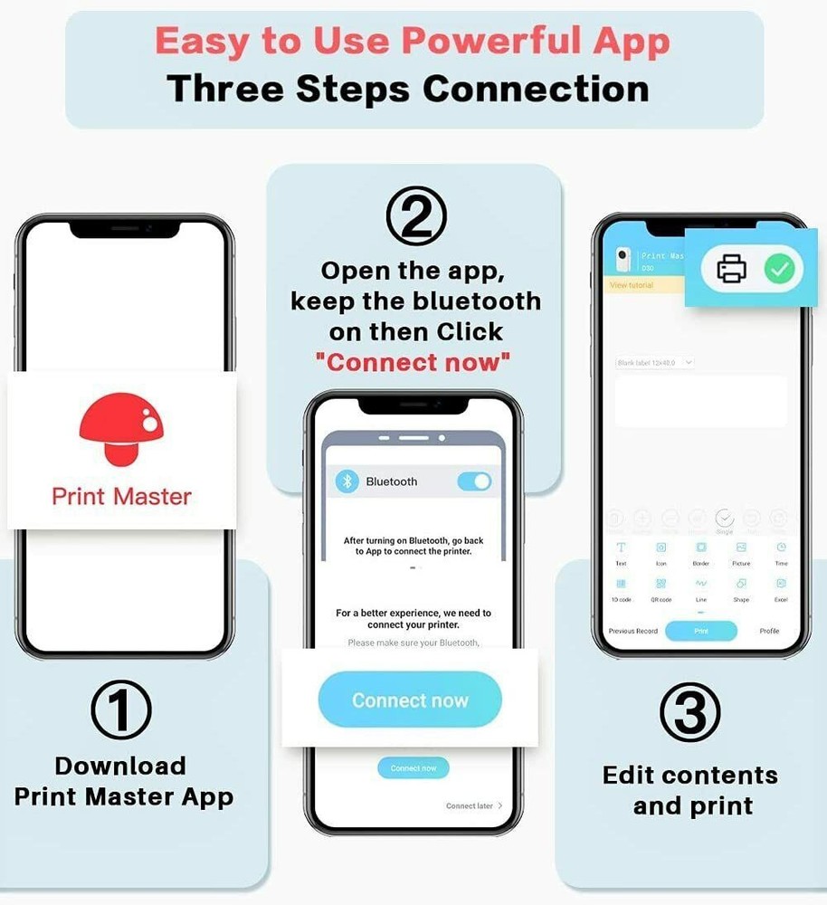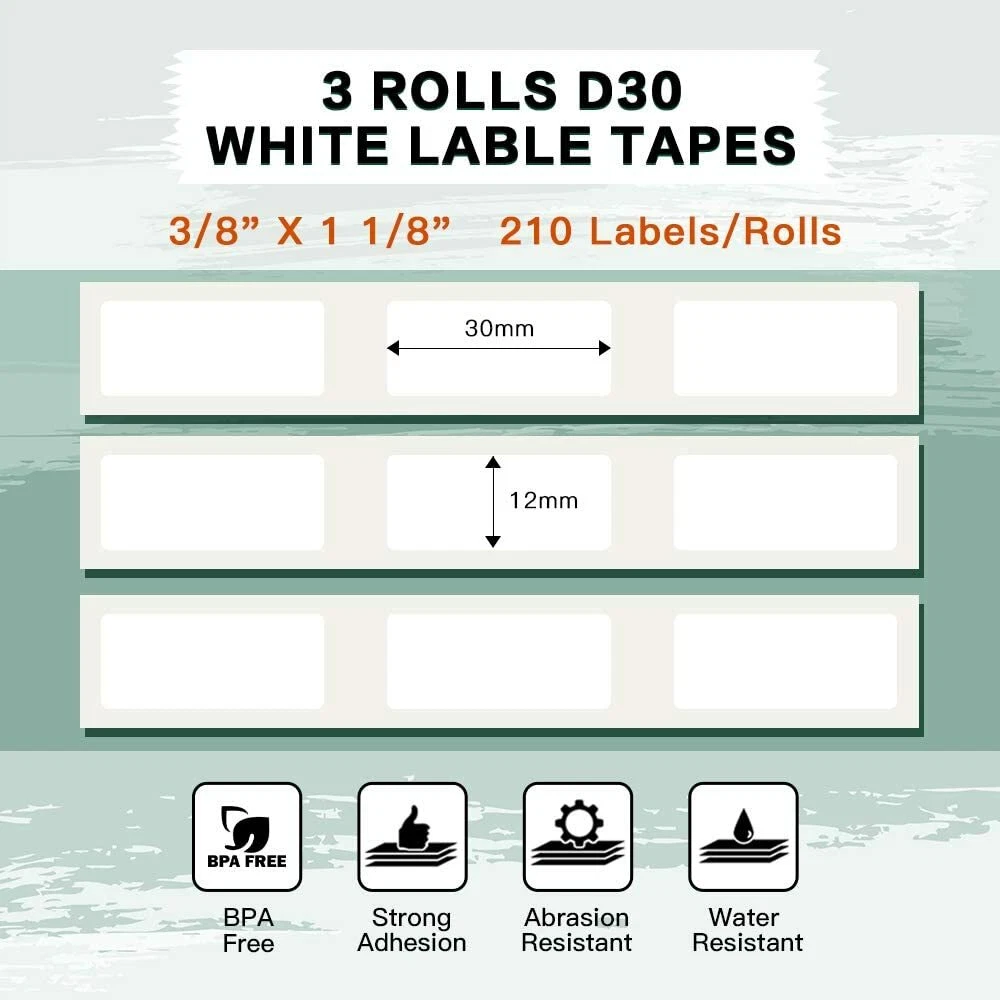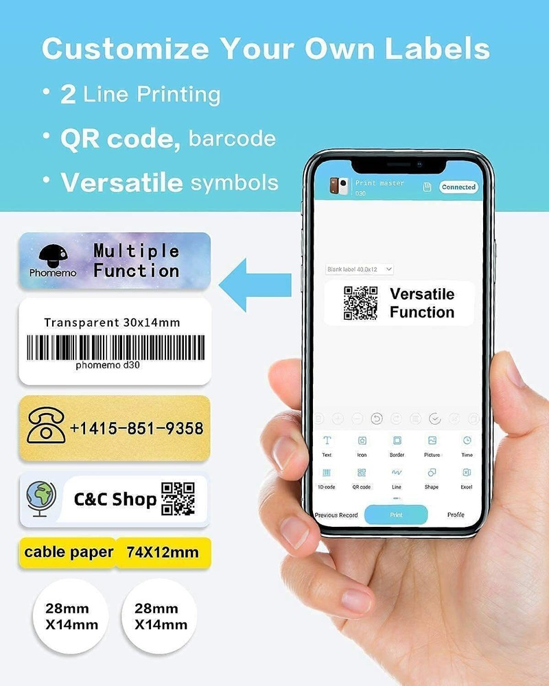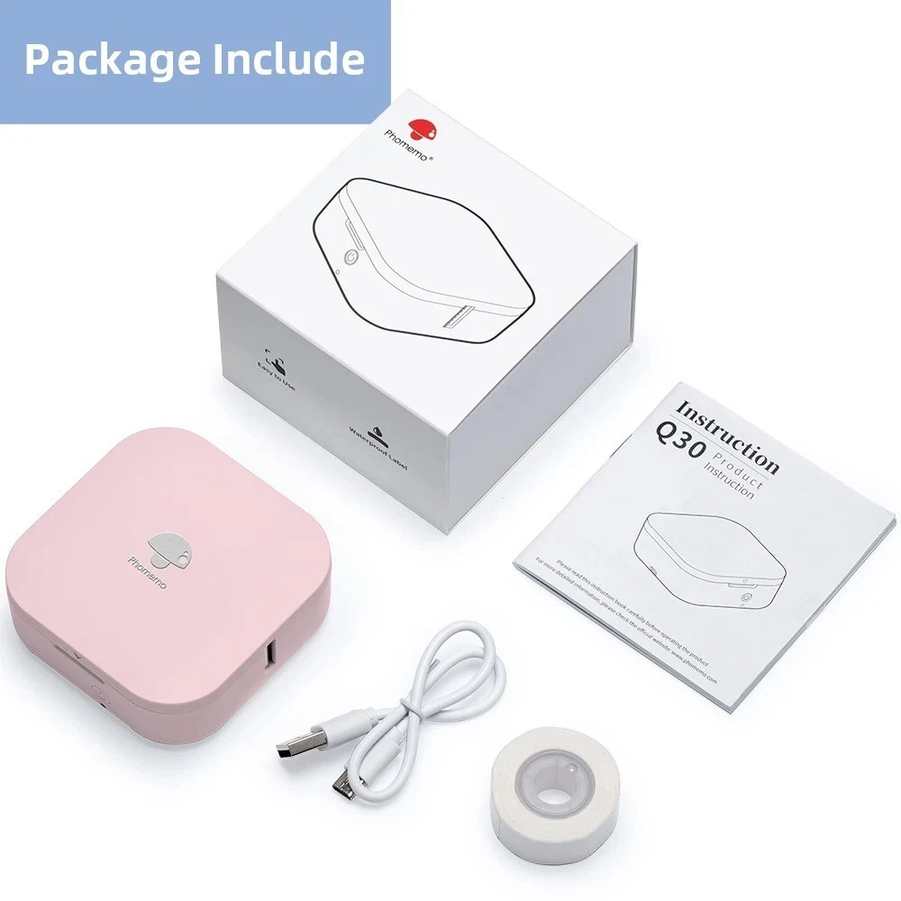 Phomemo Mini Label Maker Q30S Bluetooth Wireless Thermal Label Printer Machine Specifications Material: ABS + Metal Color:White、Green、Pink Print Media: Thermal Paper Size: 82mm x 82mm x 32mm Paper Capacity specification: 6/12/14/15mm Package Weight: 102g Battery: Insert 4 AAA-batteries (not include) Interface: 5V, Micro USB Connection: Bluetooth 4.2 Support System: for IOS + Android Resolution: 203dpi Network Printing: supported Printing paper: 6/12/14/15 mm Package List: 1 x Printer 1 x 12mm*40mm White Sticker (Insided the Printer) 1 x User Manual 1 x Packing Box 1 x Type-C Data Link [Make Your Life More Organized] - Q30 label maker can be used to print storage tags, Files category, dates, names , etc. Only the palm size, compact and portable , it will be a good assistant for home, office or travel. [Save Your Extra Cost] - The Q30 inkless label maker machine uses thermal label paper, comes with a roll of white label tape (12mm*40mm). Simply refill the label tape after ran out, and each label costs less than 2.5 cents. [Create Labels on the Go] - The Q30 Bluetooth handheld label printer needs 4 alkaline-AAA -battery pack (not included) or charges via Type-C cable . After the Bluetooth connection and calibration of the label, you can print anytime, anywhere. *When not in use, to save battery power, the label maker will automatically turn off after 15 minutes . [More Creativities in the APP] - Q30 label maker is controlled by the free app 'Print Master' , you can freely edit text, and can also add icons/ cartoon borders / import Excel. It even supports intelligent recognition of pictures / convert text to QR code / voice input text. [Simple but Practical] - The Q30 mini label printer supports 6mm/12mm/14mm/15mm 4 specifications of printing paper, which can be applied to different items. In addition, please look for the Q30 exclusive label tape, which is waterproof and oil-proof, Clearer text , and can be easily torn off without residue. How to connect your phone to Q30 Label Maker via Bluetooth? Multiple Label Styles to Meet your Different Needs