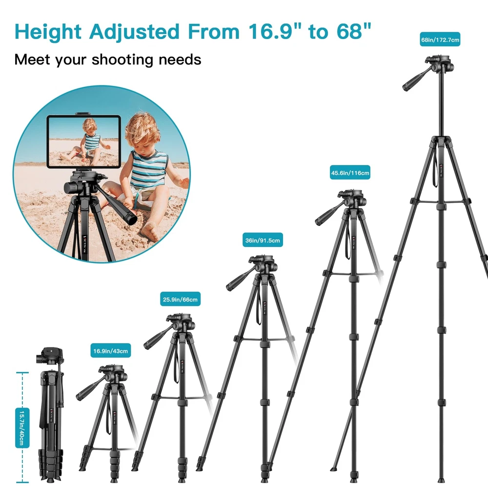 iPad Tripod 【 Phone Tripod with Universal 2-in-1 Tablet Holder】phone and tablet tripod comes with a 2-in-1 clip, can carry both cell phone (landscape/vertical) and tablet. Compatible with iPad, iPad Air, iPad Pro 10.2"/10.9"/11"/12.9", iPad mini, and many other tablets. For smartphones like iPhone15 14 13 12 11 Pro/XS/XR, Samsung, Xiaomi, Huawei, etc 【Multi-functional Tripod Kit & 3-Way Pan Head】Versatile camera tripod comes with Standard 1/4" screw mount, performs well with a wide range of devices, compatible with small cameras/DSLR/Gopro/webcams/ring light. Stable and smooth 3-way pan head can freely adjustable angles for 360° panoramic shooting, 180°up & down shooting, and 90°vertical portrait , which can satisfy all the needs of vertical, horizontal, and overhead photography, etc 【Wireless Remote Shutter】Phone tripod stand is equipped with a wireless remote, easily connect your phone (iOS and Android), tablet, camera.It allows you to conveniently capture photos and videos from a distance of up to 33ft/10m. No need to touch, you can easily realize photo shooting, video shooting 【Stable Tripod Adjustable Height】Tripod stand easily extends the tripod height (from 16.9 inches to 68 inches) by adjusting the quick-release leg locks, perfect for various photography heights. Non-slip rubber feet provides strong stability, withstand up to 9.3 pounds of pressure. It provides reliable support for various photography needs, selfies, camera photography, live streaming, vlogging, pursuing fitness activities or practicing dance 【Portable Travel Tripod】 Tripod stand comes with a convenient storage bag, lightweight and compact, weights 1.65lbs, folded size is 15.7 inches, and it's easy to transport and store
