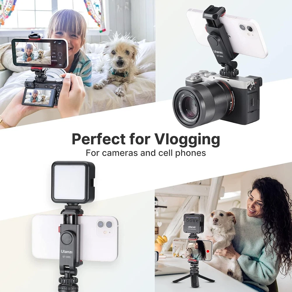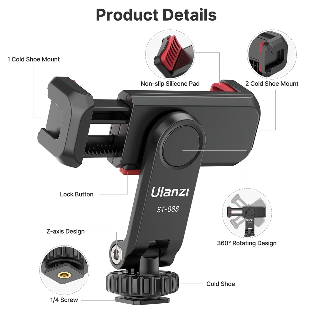 2 Standard Cold Shoe and 1/4" Screw Design: The mobile phone tripod mount upgraded, has a standard 1/4" screw holes and two cold shoe mounts. 1/4" screw holes can be installed on tripods, selfie sticks, stabilizers and other accessories; 2 cold shoe mounts can fix microphones, photography lights and other equipment Any Angle, Instead of a Ball Head: The traditional smartphone tripod mount cannot adjust the Z-axis angle, but our phone tripod adapter ST-06s adjustable angle design allows you to adjust the pitch angle on a tripod or camera hot shoe without a ball head. It is more convenient and easy to use Update and Safer Design: phone mount upgrade traditional installation method, push and lock by simply press the button, easier to use. Thick non-slip silicone pad and enhance the fixed gear, it won’t hurt the phone while holding it firmly, the cell phone clip is more stable 360° Rotating Tripod Phone Holder: You can rotate your phone from portrait mode (vertical) to landscape mode (horizontal). cell phone holder for tripod design makes it easier for you to find the best shooting angle and capture every moment of your life by taking photos and photography Mini Size and Wide Compatibility: Weighing only 51g, The phone clamp is compatible with iPhone 16 15 14 13 12 11 Pro Max X XR Xs Max 8 7 Plus SE, Samsung Galaxy S24 S23 S22 S20 S10 S9 Note 10 9 Google Huawei and so on (any smartphone within 2.36 inch to 3.54 inch wide). You will like it to meet your needs without removing the phone case